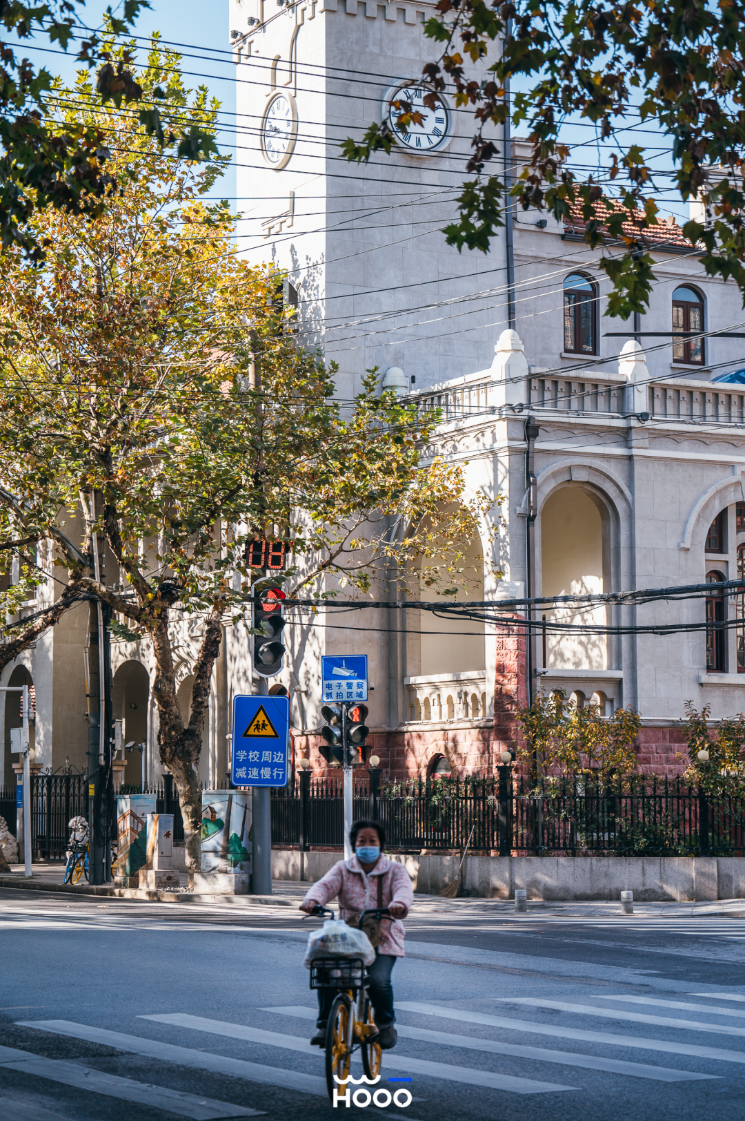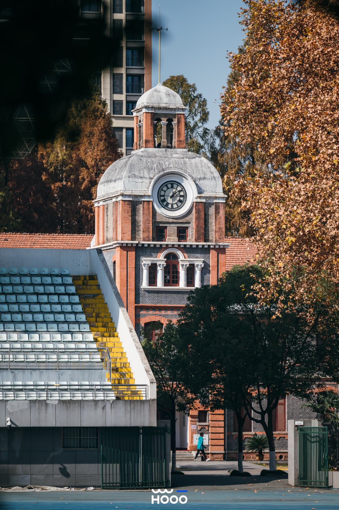 焦糖色的梧桐树后,砖红灰色夹杂的的四中老钟楼,在武汉一众灰白钟楼中倒显得格外清新美貌。
