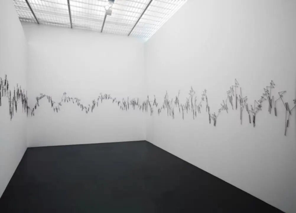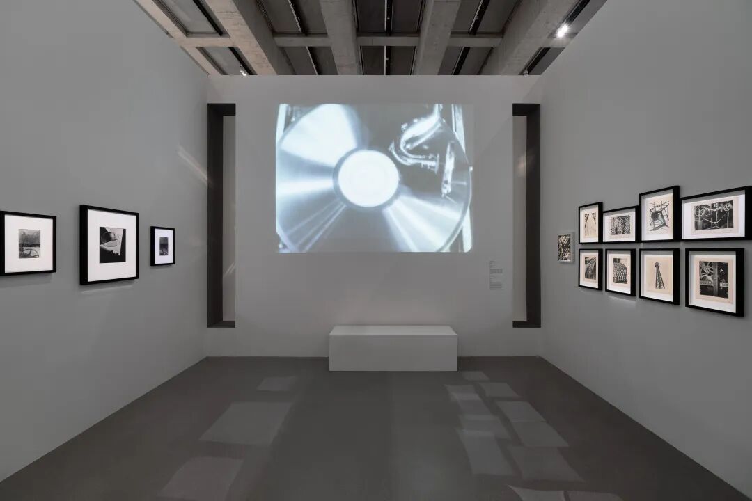 如果不考虑“抽象”的修辞,该展览确有其丰富之处,它将抽象艺术总是跟绘画领域的主导关系打破,以身体性——洛伊·富勒 (Loïe Fuller) 19世纪末的“蛇形舞”作为开端,透过非男性身体的展演 (performative) 维度,引入一个关键的女性主义话语范式。随后,展览从摄影和电影、雕塑和空间塑造等层面进一步拓展了抽象艺术语言,让我们看到2、30年代女性摄影师镜头下的光影游戏、50年代女性雕塑家创作的富有流动性的雕塑、60年代动态艺术和欧普运动中女性的身影,以及20世纪末女性艺术家是如何透过创作来探索空间感知。其中,迥异于彼时极简主义雕塑里常见的锋利几何线条,美国艺术家克莱尔·法尔肯斯坦 (Claire Falkenstein) 用缠绕的金属线制成的雕塑《无题》呈现出一具流动的、有机的形态,受宇宙膨胀理论的启发,她把自己的雕塑称之为“一个不断扩大的太空”。匈牙利裔法国媒体艺术家维拉·莫尔纳 (Vera Molnar) 被广泛认为是计算机艺术和生成艺术的先驱,也是最早在艺术实践中使用计算机的女性之一,1968年,她使用电脑创作了她的第一幅算法绘画;在墙面装置作品《OTTWW》中,莫尔纳利用钉子之间绷紧的黑线模拟了由计算机生成的图形变化,探索早期计算机技术中常见的系统缺陷。1970年代末以来,英国艺术家安·维罗妮卡·詹森斯 (Ann Veronica Janssens) 发展了其独特的实验性创作,通过对特定地点装置和无形媒介的使用,如光、声音或人造雾,邀请观众进入她所营造的沉浸式体验中,这种体验有时是谵妄的、令人眩晕的,带来一种视觉、时间和心理上的脆弱感,灯光装置《玫瑰》正是如此:在一个封闭、黑暗的空间中,基于七个投影仪的光束在墙上排列成一个圆圈,它们的光被悬浮的薄雾所捕捉,从而创造出一个七芒星结构,这种对视觉感知和空间体验的探索也是詹森斯对于客观实在的质疑,她用其视觉艺术的表现方式积极回应现象学中的知觉经验问题。