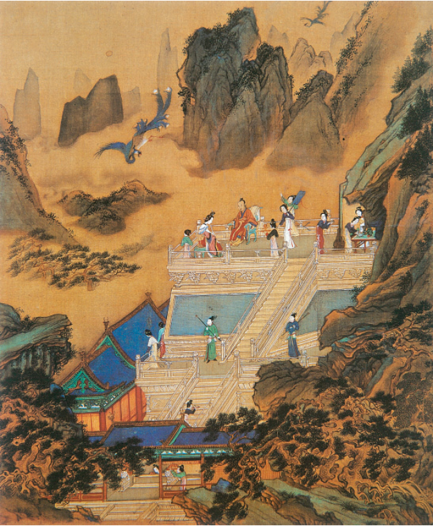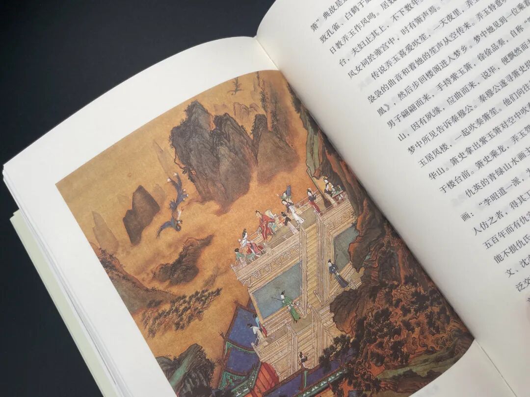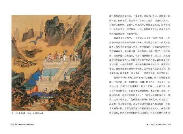 此画描绘的是春秋前期秦穆公之女弄玉在凤楼上吹箫引来凤凰的故事。《列仙传》中对“弄玉吹箫”典故是这样描写的:萧史者,秦穆公时人也。善吹箫,能致孔雀、白鹤于庭。穆公有女,字弄玉,好之,公遂以女妻焉。日教弄玉作凤鸣。居数年,吹似凤声,凤凰来止其屋。公为作凤台,夫妇止其上,不下数年。一旦,皆随凤凰飞去。故秦人为作凤女祠於雍宫中,时有箫声焉。