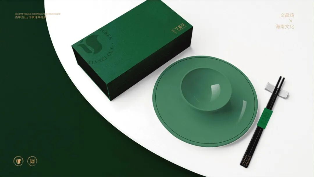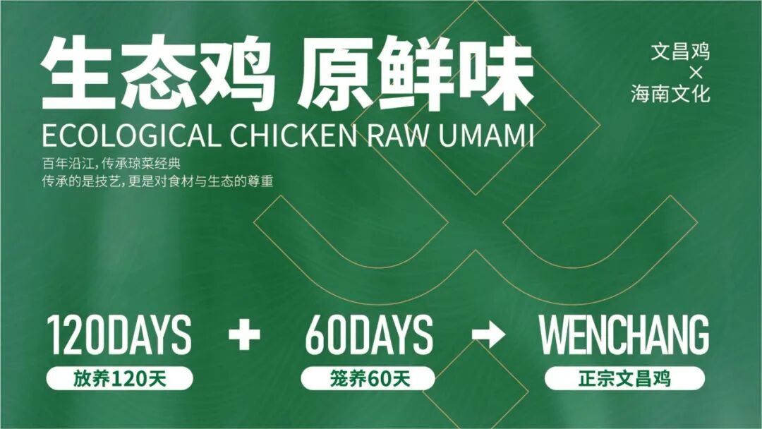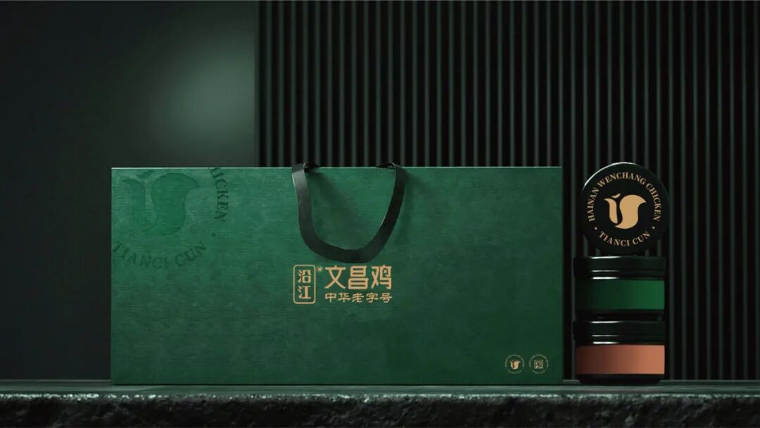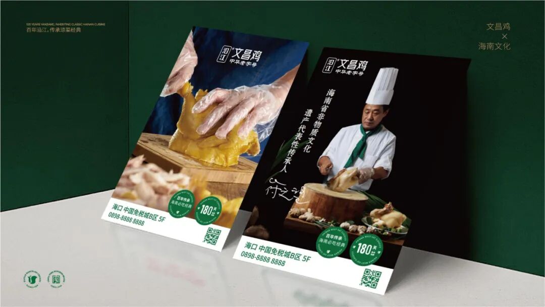 “沿江”二字加框加上小鸡外形的小图标,形似印章,突出技艺传承与百年历史沉淀,带领食客找到海南最正宗的文昌鸡味道。