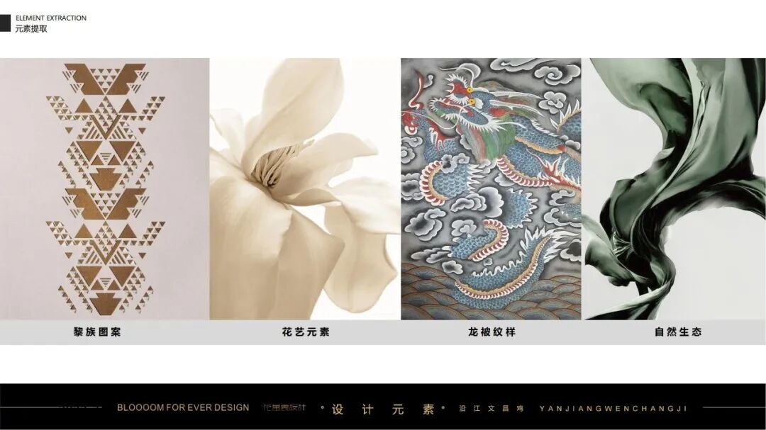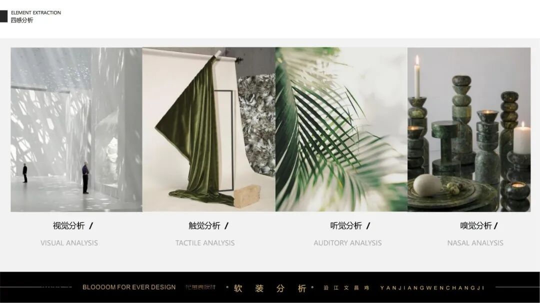 设计团队在对项目的性质进行分析后,提取出元素、软装场景、色彩与材质应用。