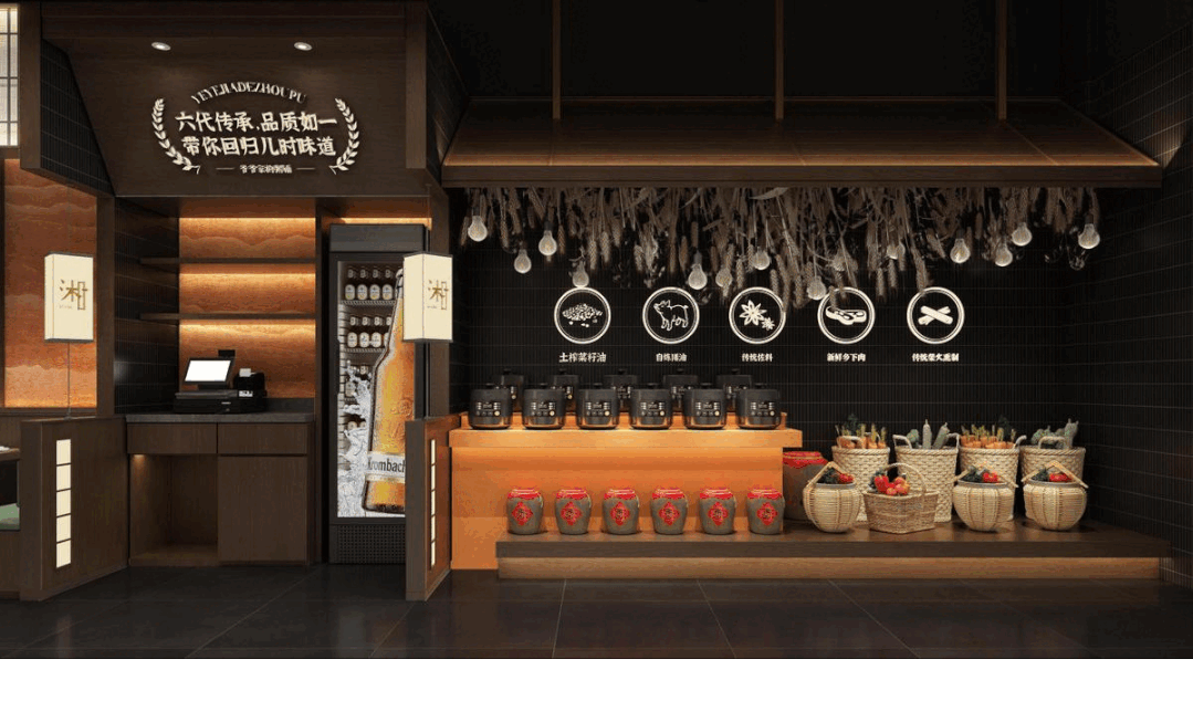 本次空间设计旨在将现代与传统相结合,为爷爷家的粥铺营造一个传统复古又不失现代时尚的氛围场。通过新中式风格的自然大气与现代风格的简约素雅衔接,让宽敞的大厅处处体现高端精致的新中式风格,内敛时尚的色彩搭配也在透露着高级感。既保留了古色古香、又不失时尚精致的细节。