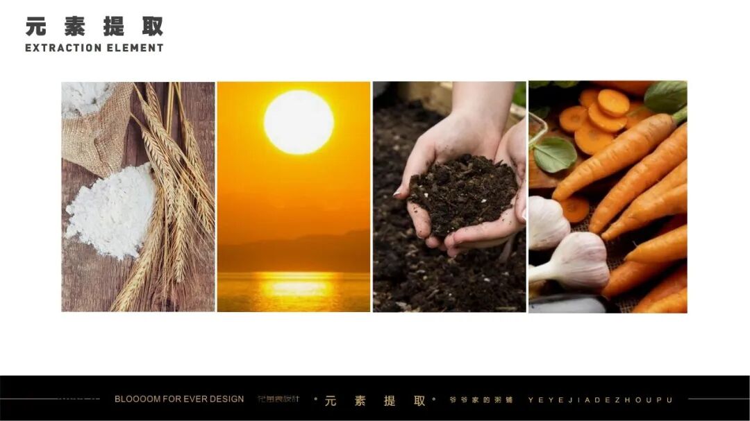 提取谷物、光照、土壤、农作物等元素,契合家常菜的属性,体现爷爷家的原材料的纯天然、健康卫生,以及充沛的勃勃生机。