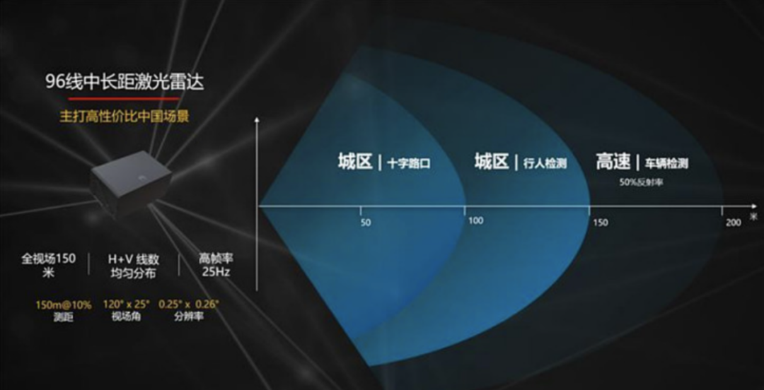 2020年年尾,华为发布了 96 线混合固态的激光雷达,随后应用在极狐Hi版和阿维塔11上,这枚96线半固态激光雷达的视场角可覆盖横向 120°纵向 25°,可以做到 150m距离10%反射率的测距。
