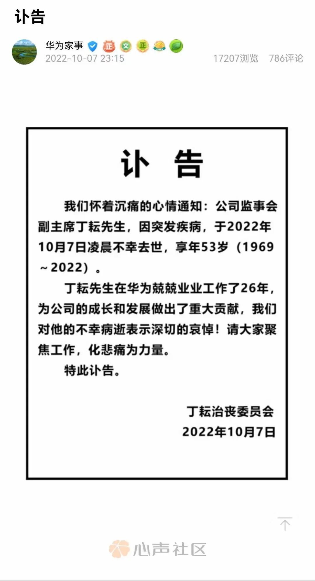 华为官方也于7日晚发布讣告,证实丁耘因突发疾病,于7日凌晨不幸去世,享年53岁,但讣告中并未说明丁耘是否因长跑而引发的心脏疾病去世。