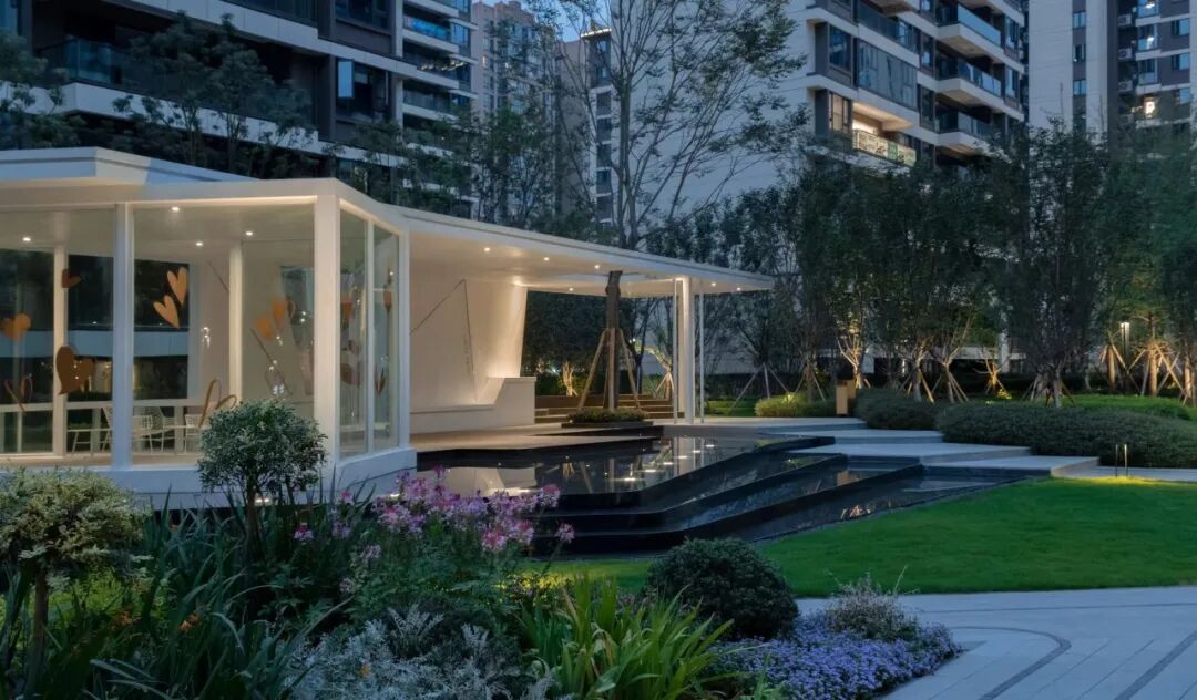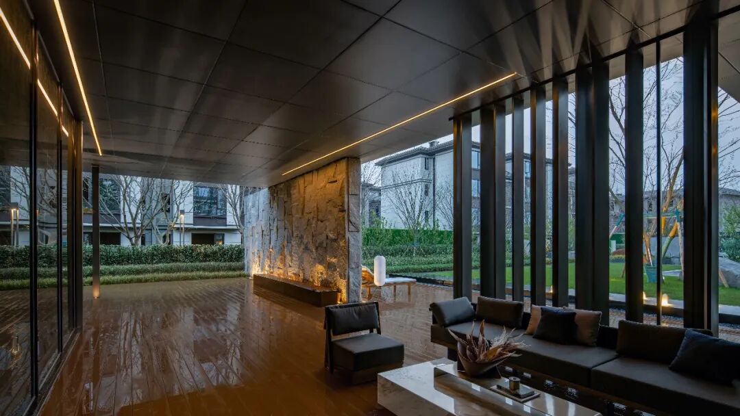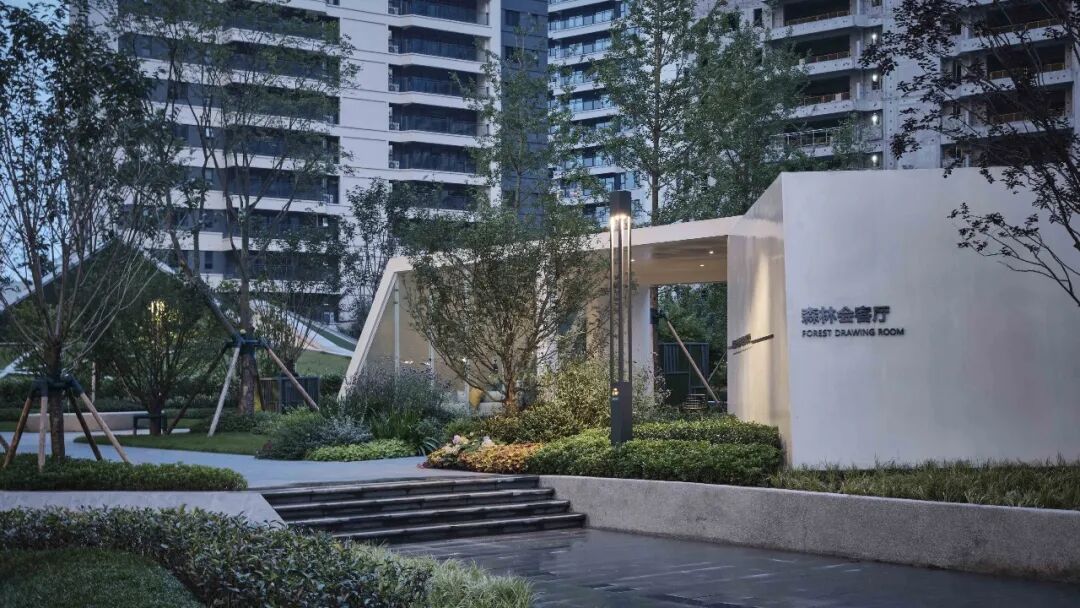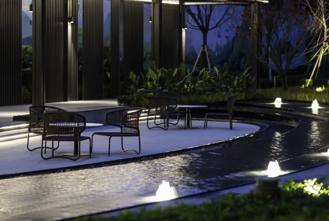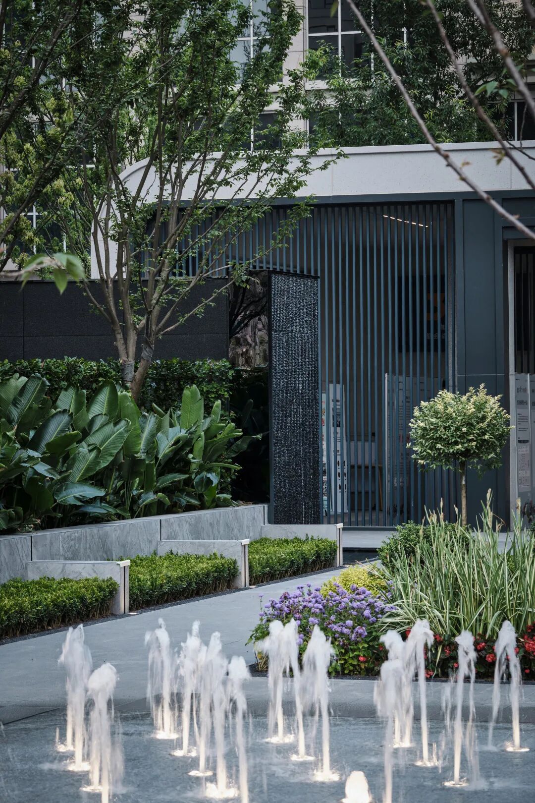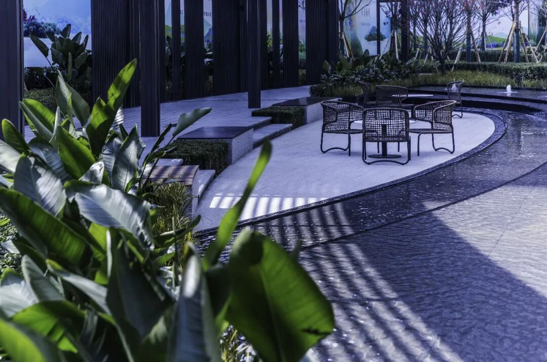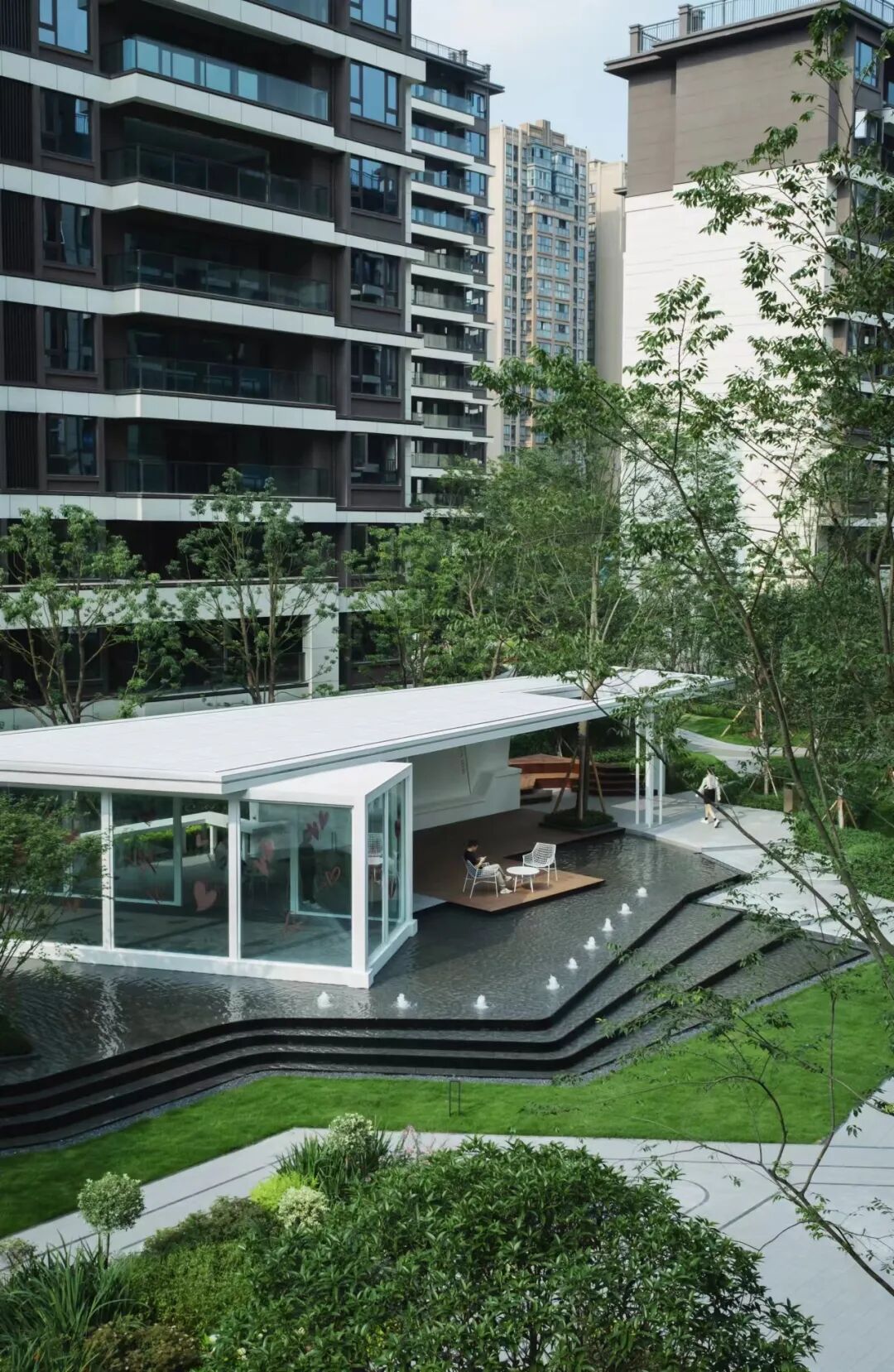 林木环绕的森林会客厅在楼群环抱中自成一格,水在空间中肆意流动,灵动又轻巧的营造出精致的现代生活氛围,完美塑造打动人心的生活场景美学。