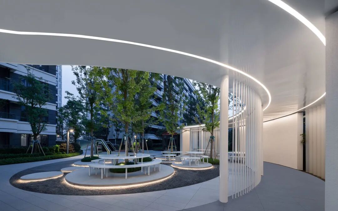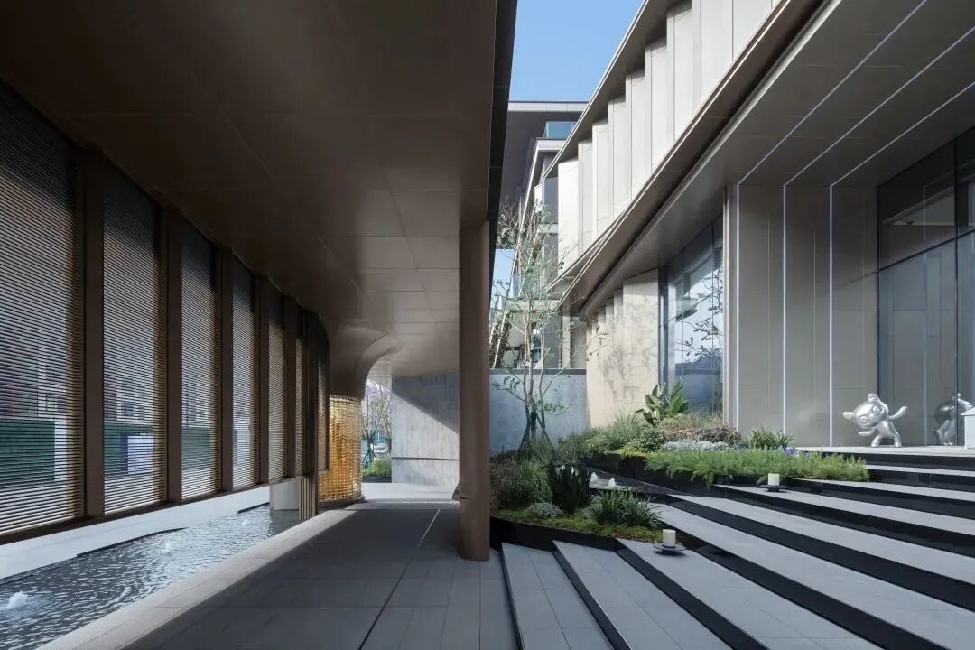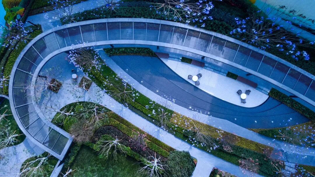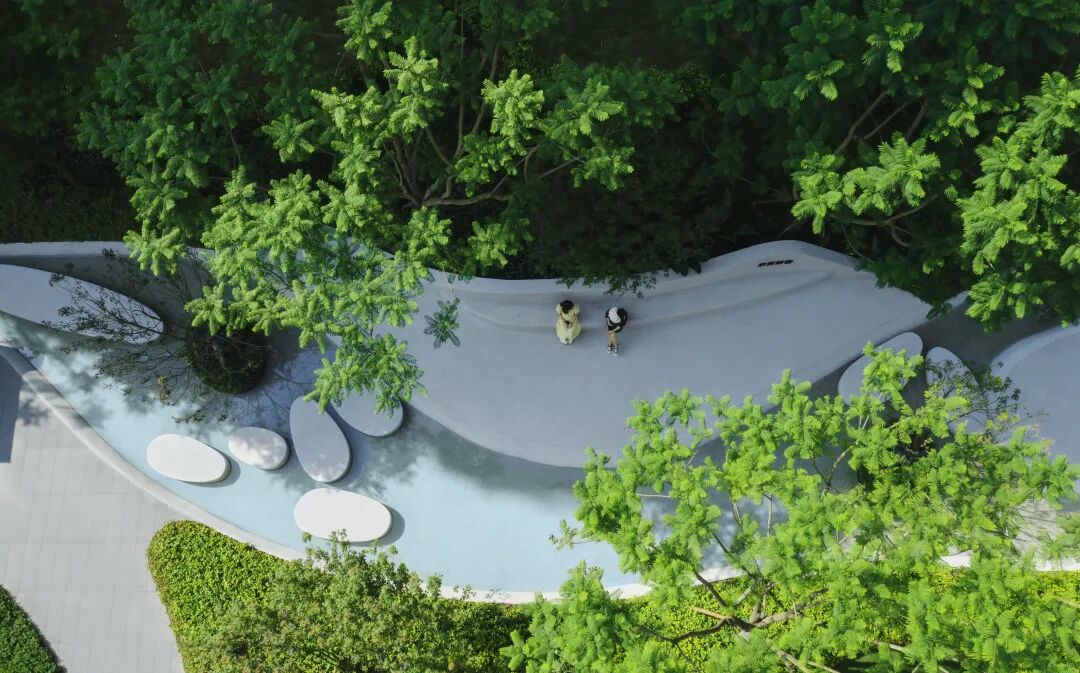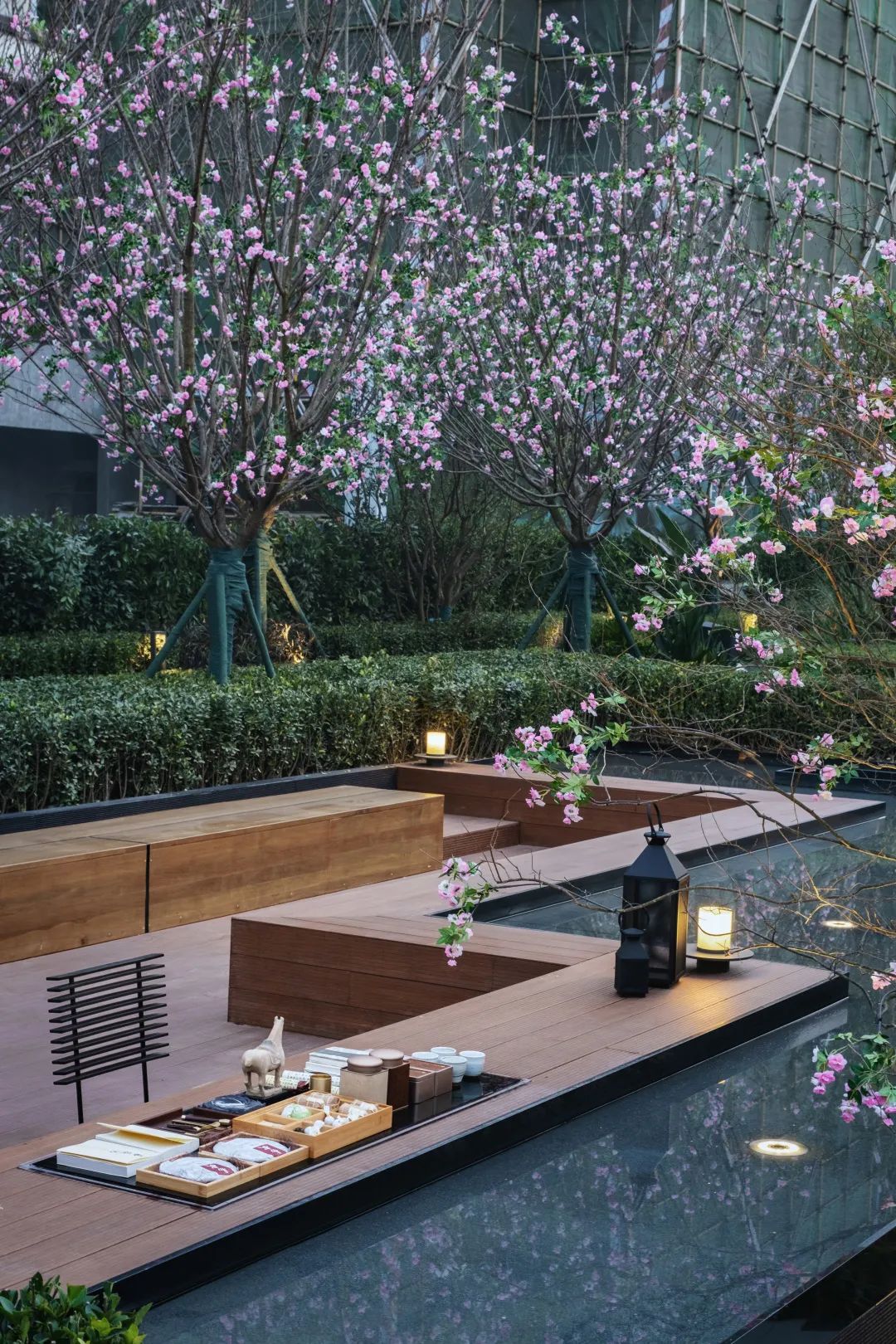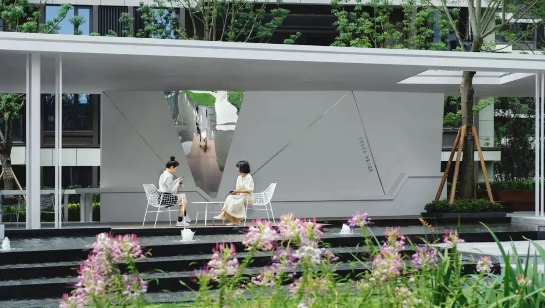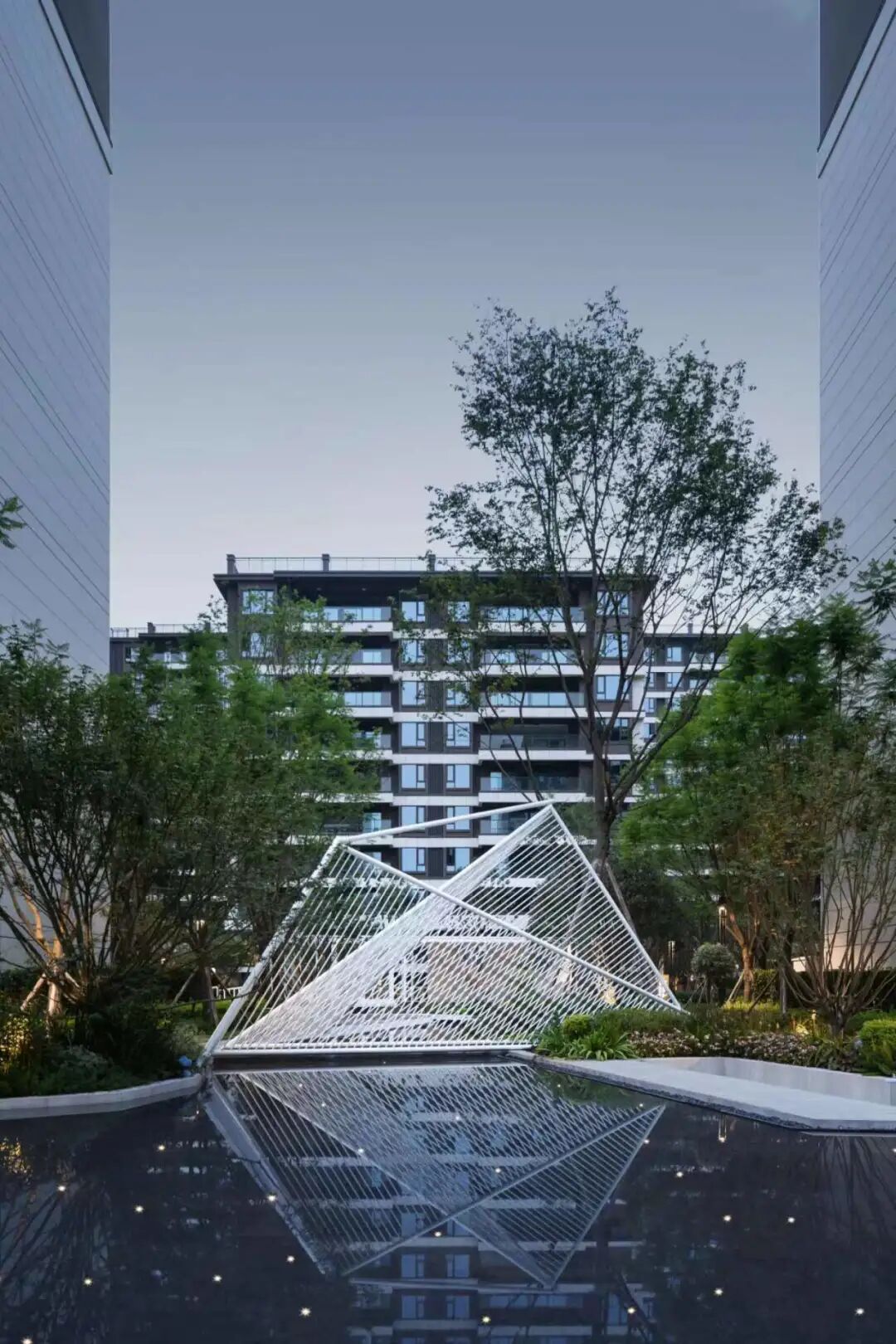 林木环绕的森林会客厅在楼群环抱中自成一格,水在空间中肆意流动,灵动又轻巧的营造出精致的现代生活氛围,完美塑造打动人心的生活场景美学。