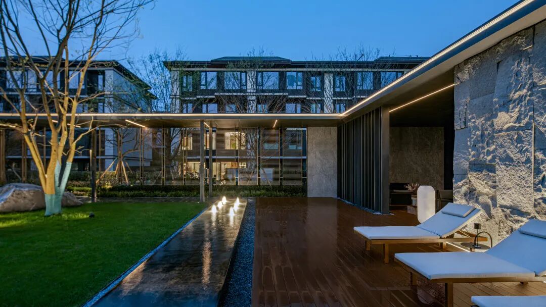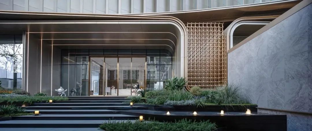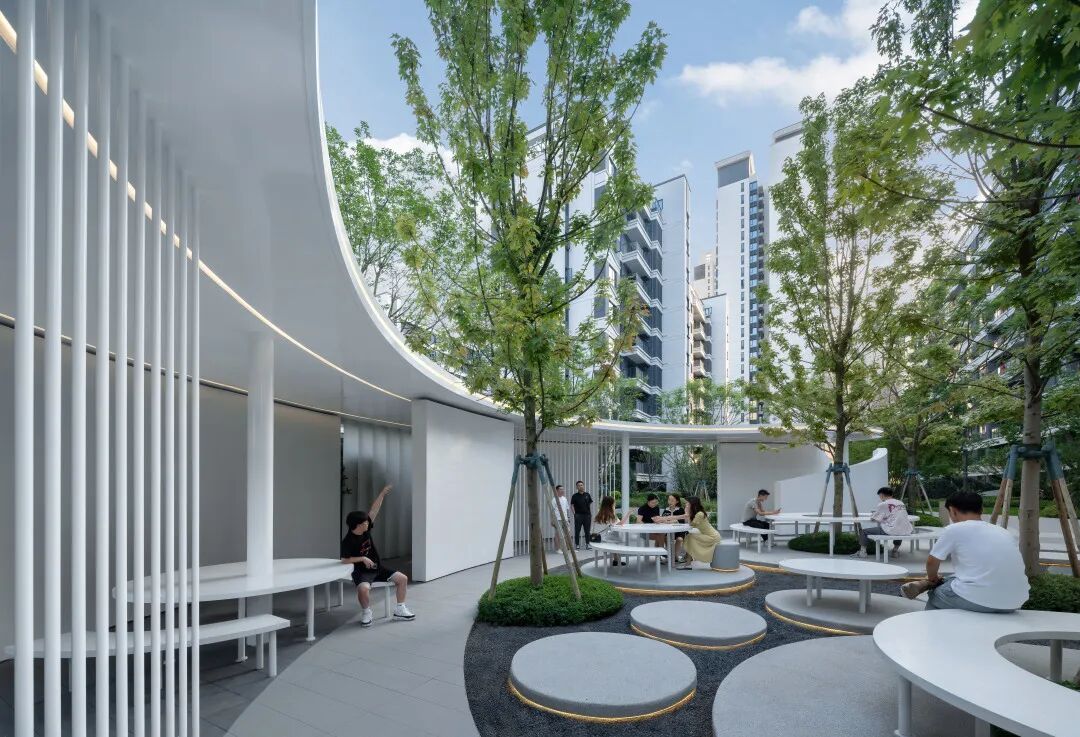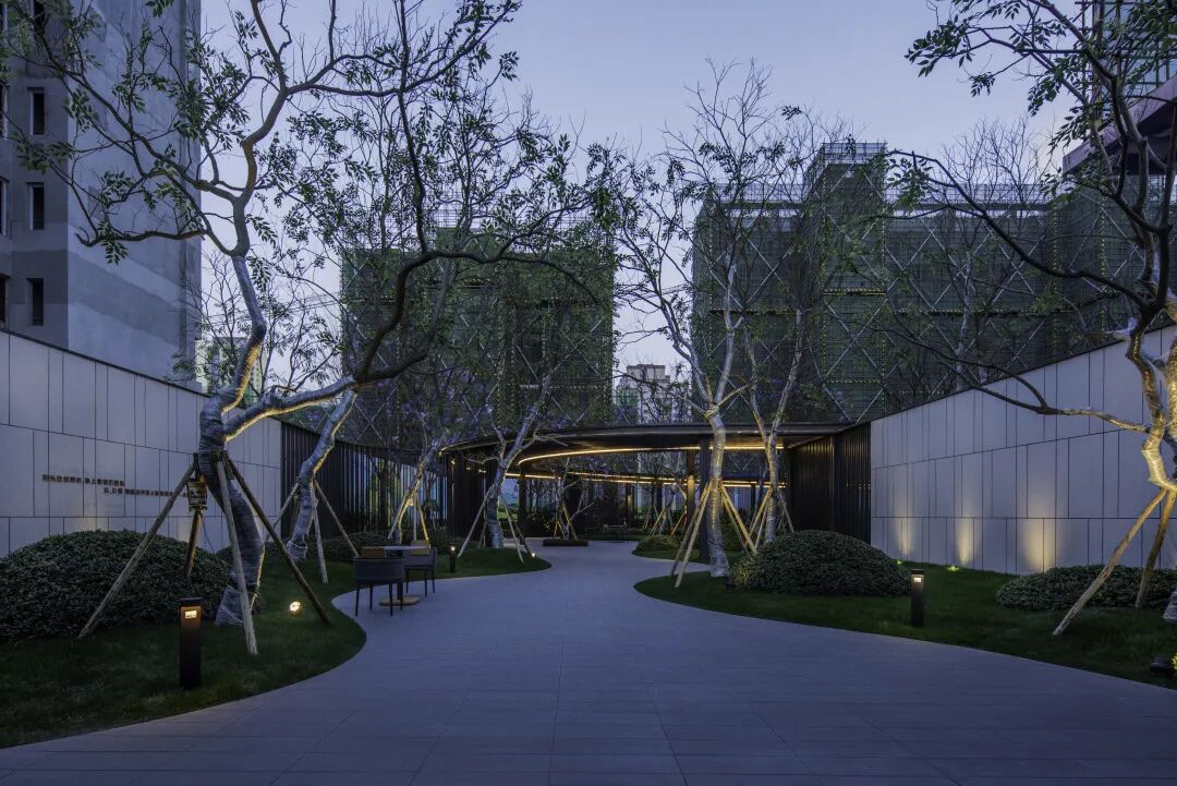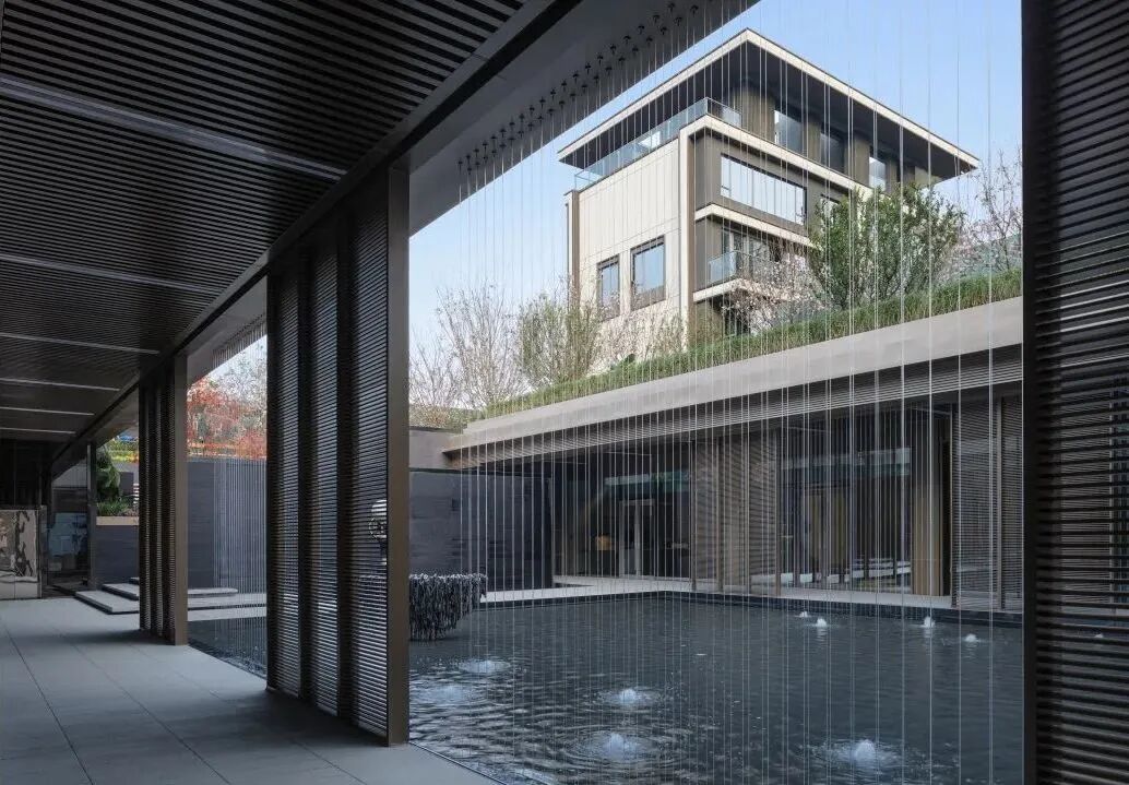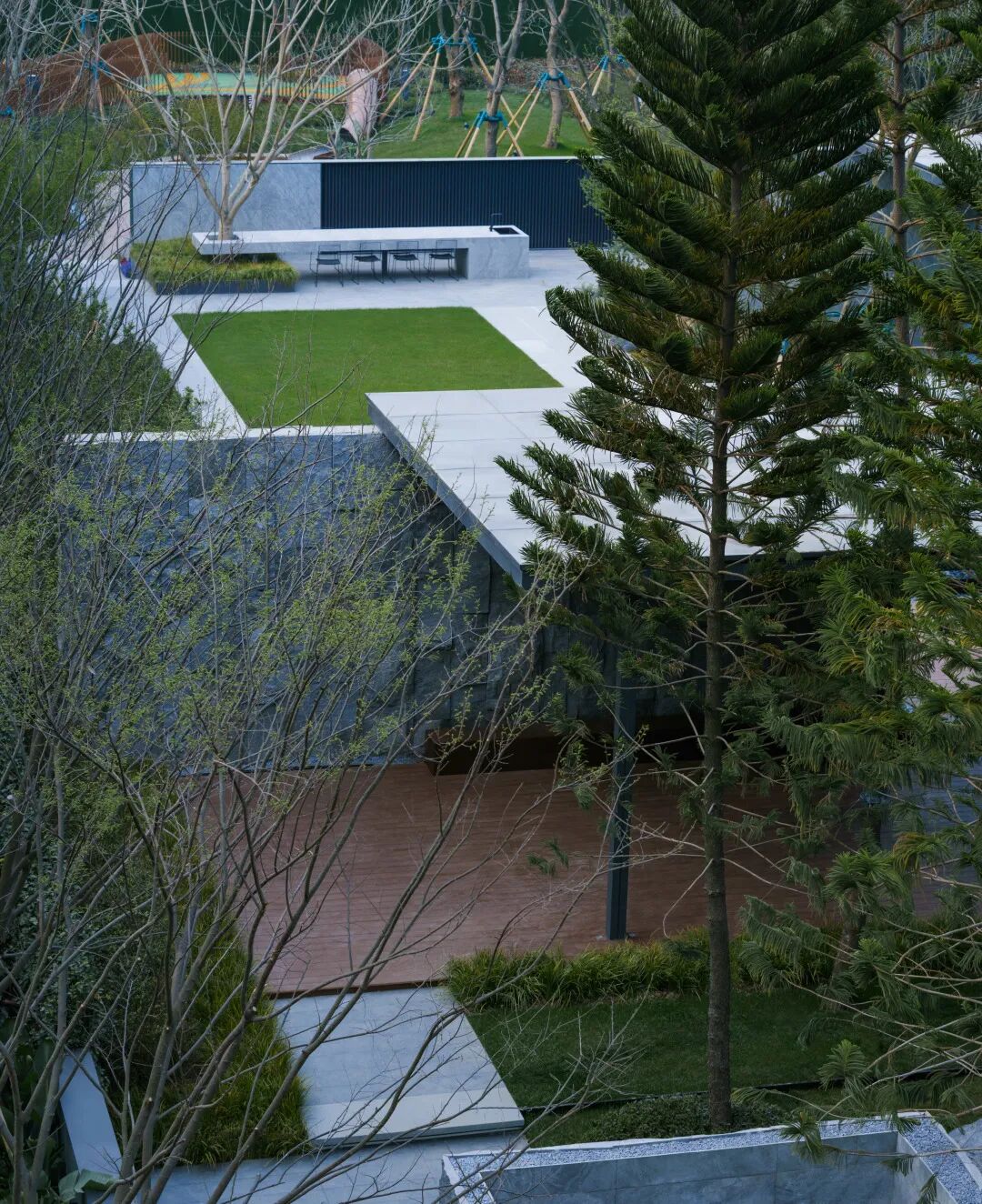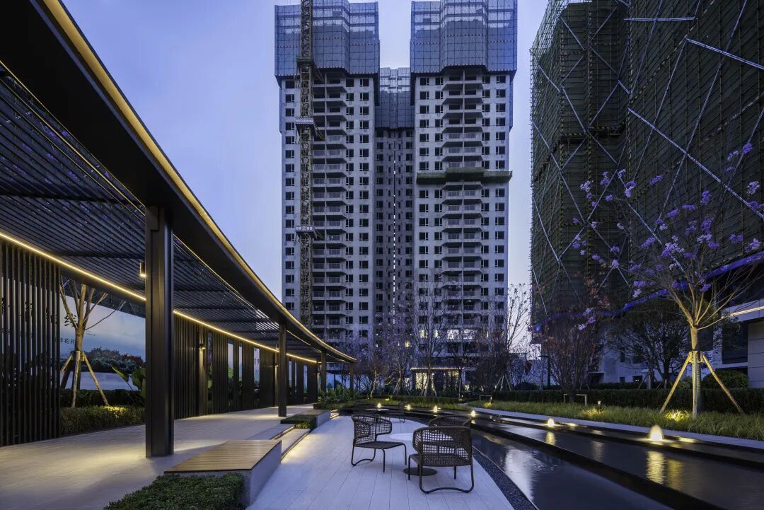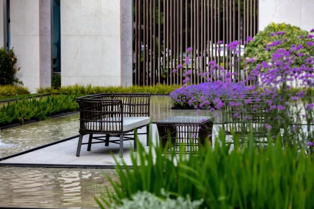 林木环绕的森林会客厅在楼群环抱中自成一格,水在空间中肆意流动,灵动又轻巧的营造出精致的现代生活氛围,完美塑造打动人心的生活场景美学。