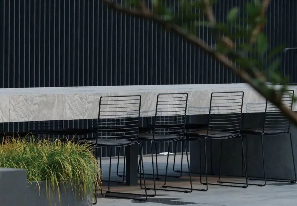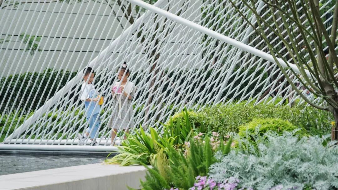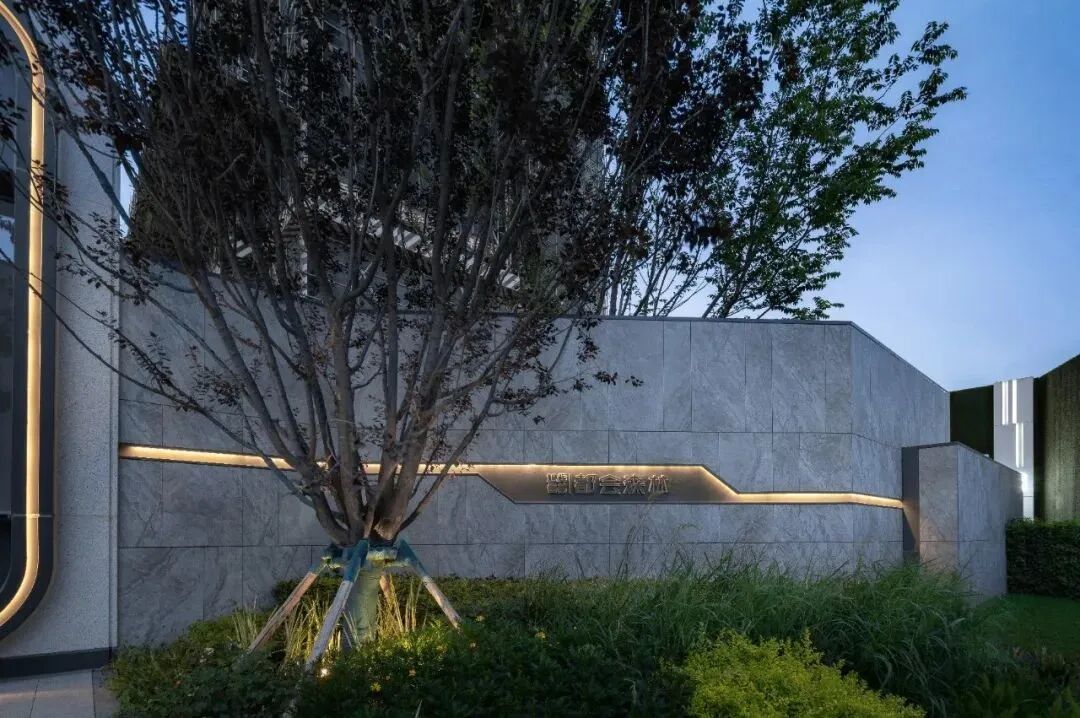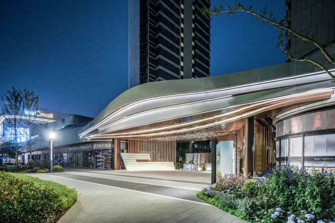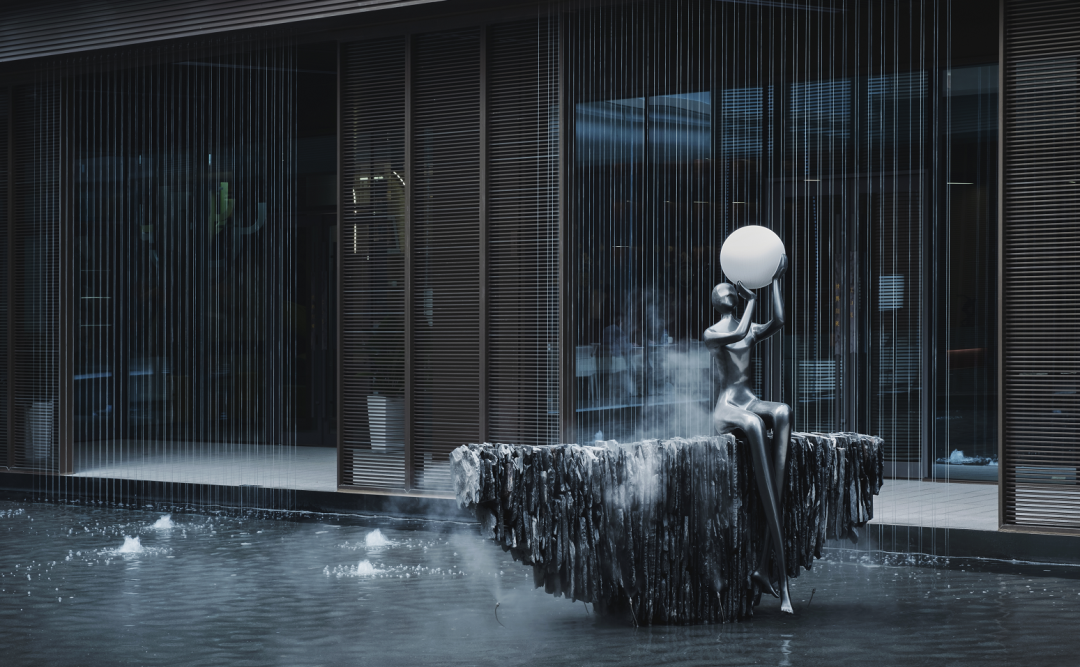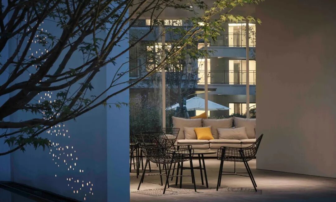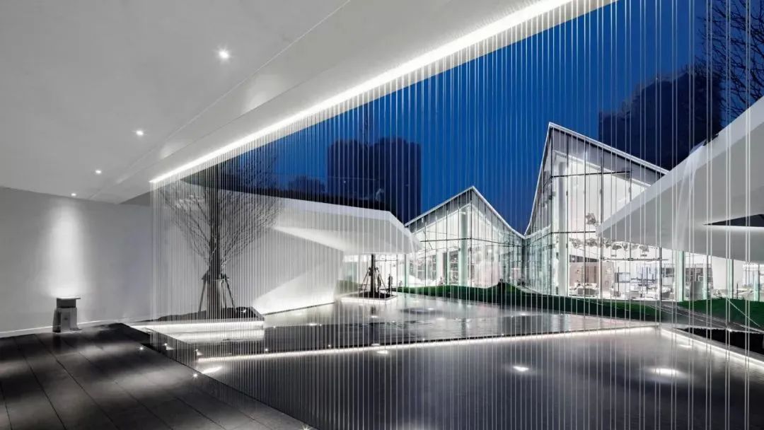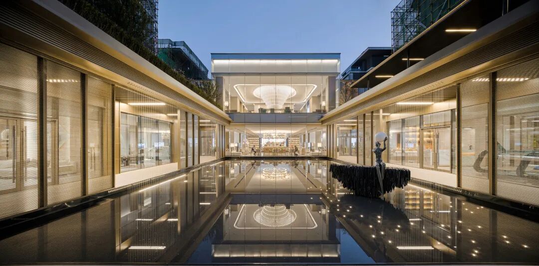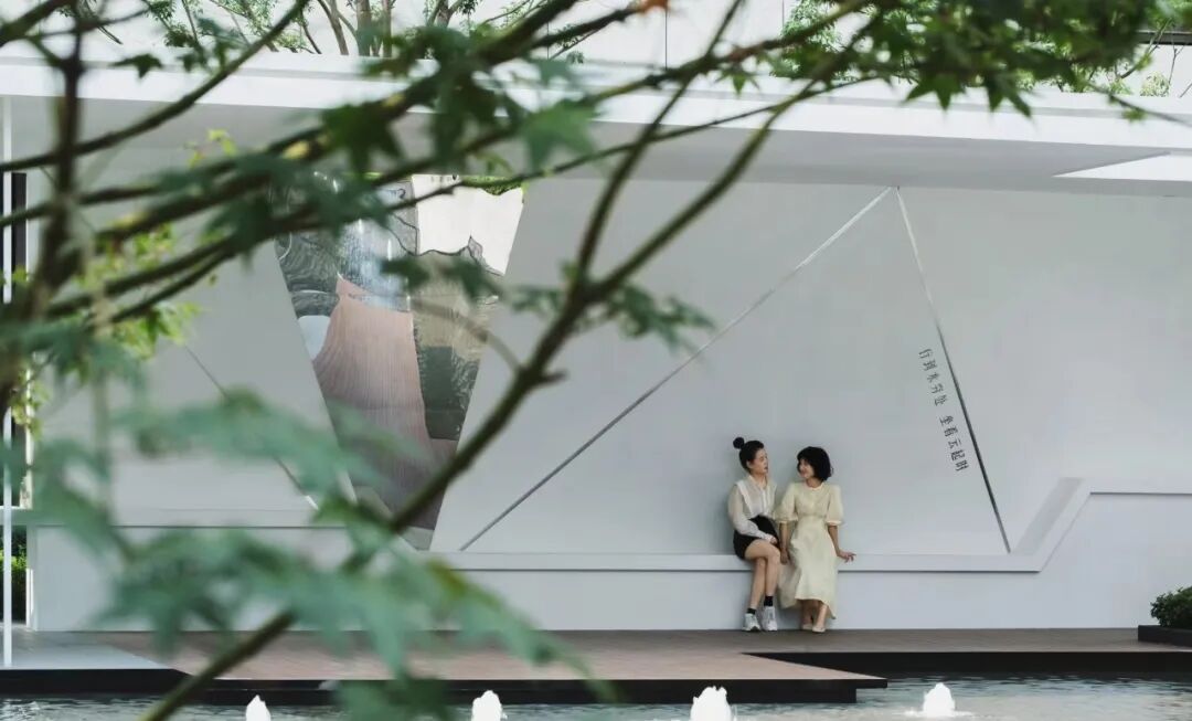 林木环绕的森林会客厅在楼群环抱中自成一格,水在空间中肆意流动,灵动又轻巧的营造出精致的现代生活氛围,完美塑造打动人心的生活场景美学。