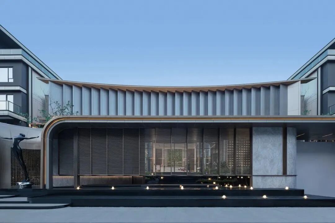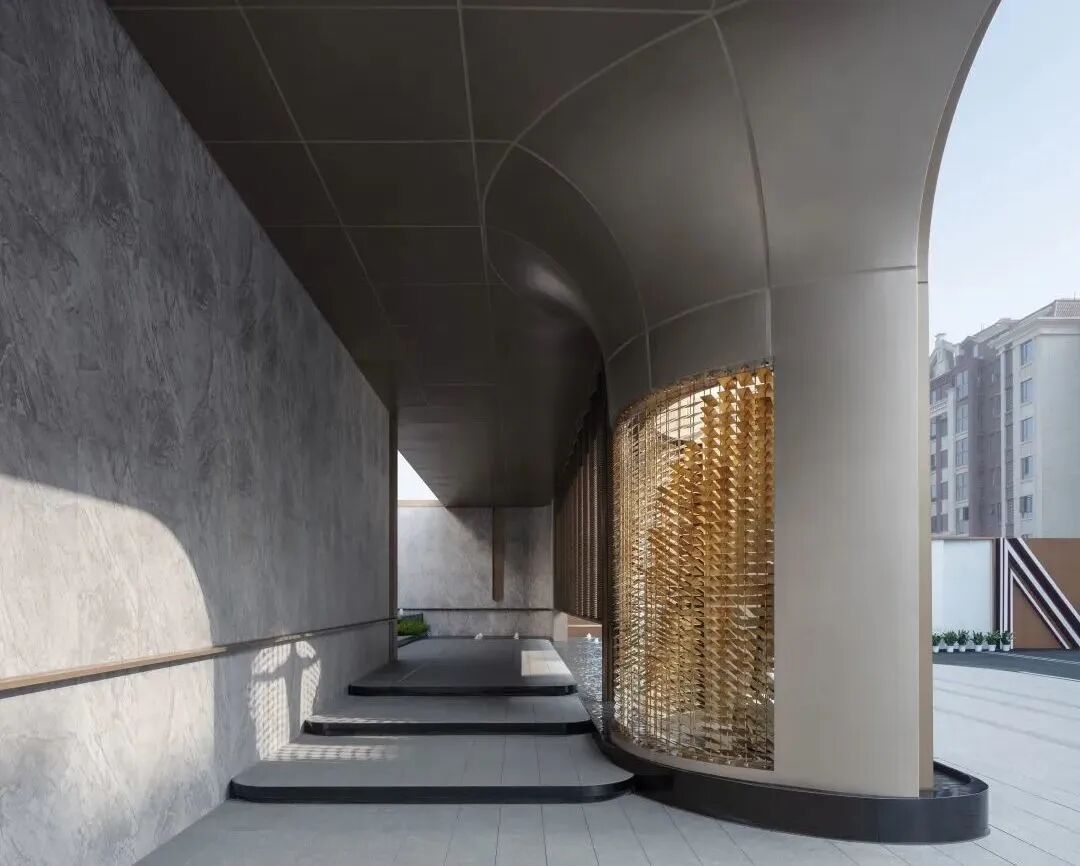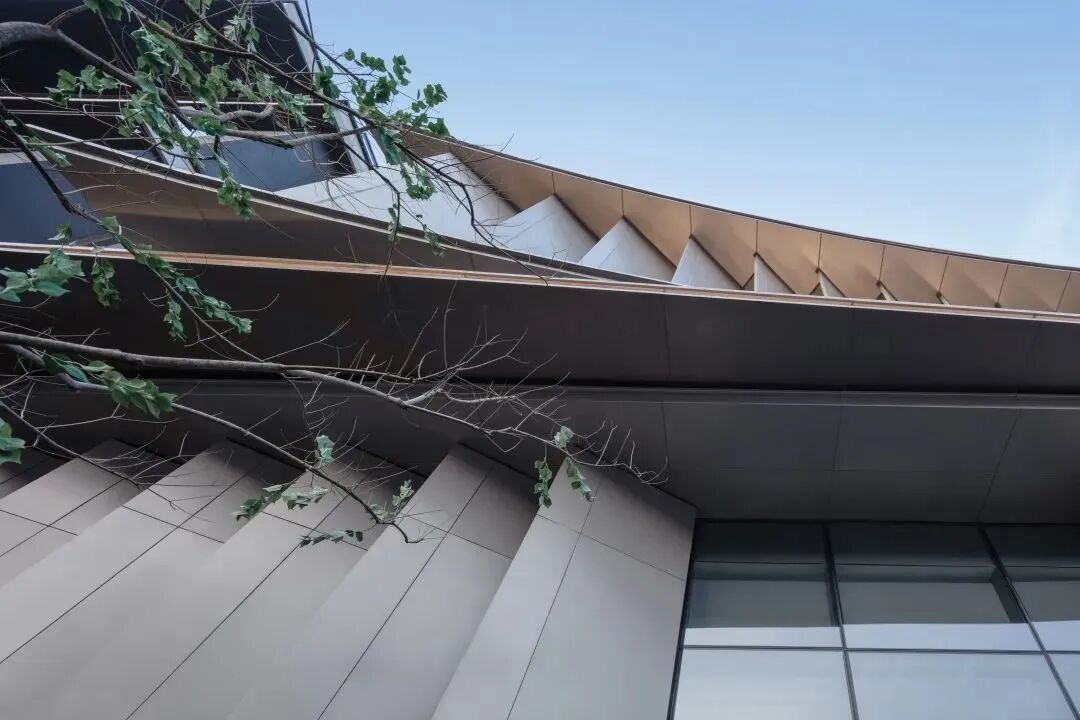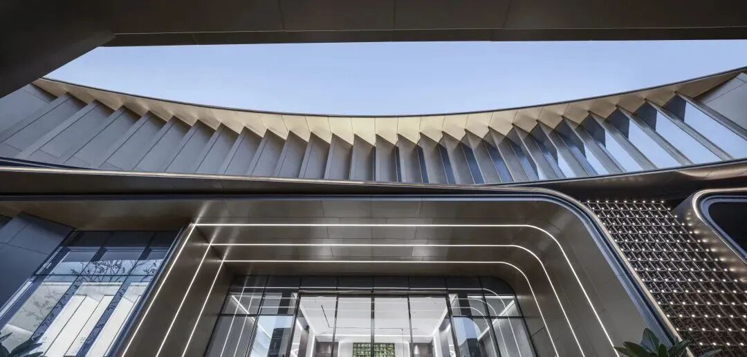 自然流淌的曲面及折板相互碰撞,结合大面铝板严控分缝,营造精致秩序感,既有坚硬,又有柔软,给人以精致高雅气质。