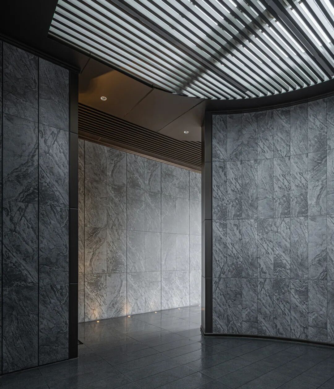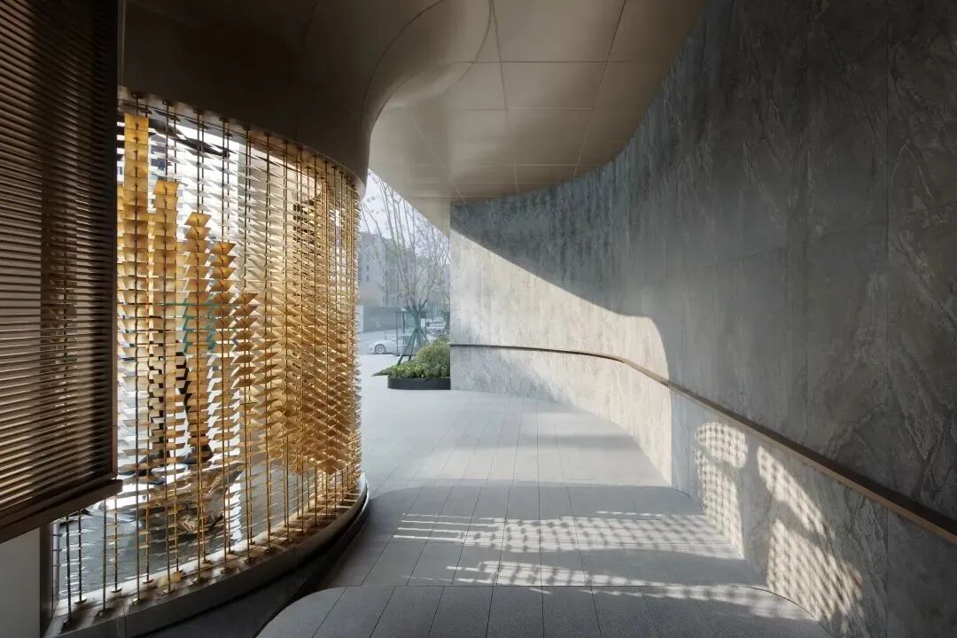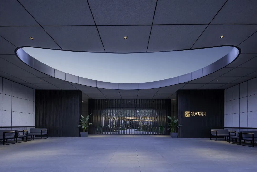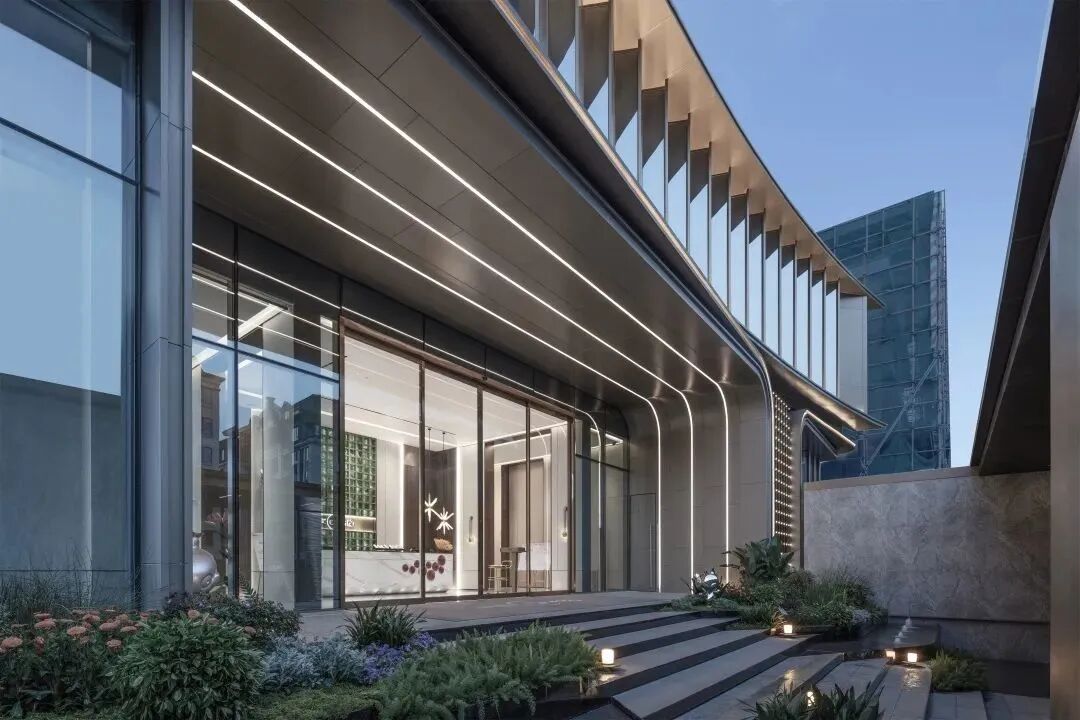 自然流淌的曲面及折板相互碰撞,结合大面铝板严控分缝,营造精致秩序感,既有坚硬,又有柔软,给人以精致高雅气质。