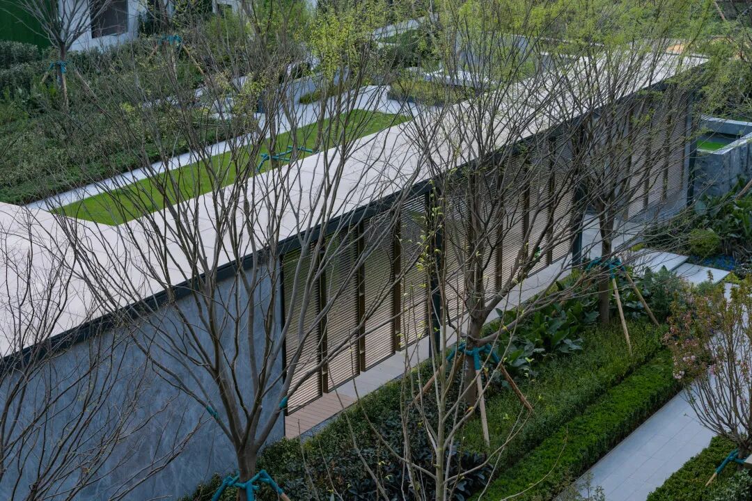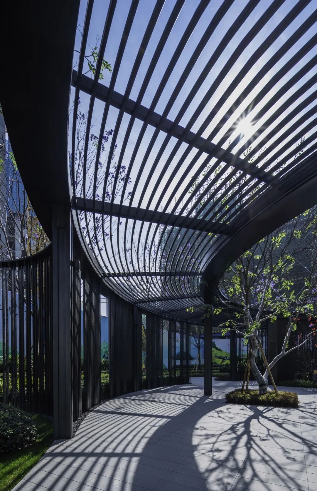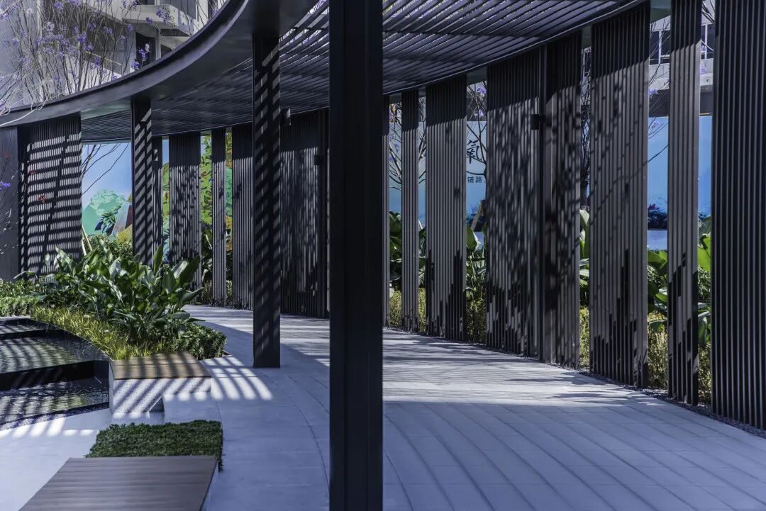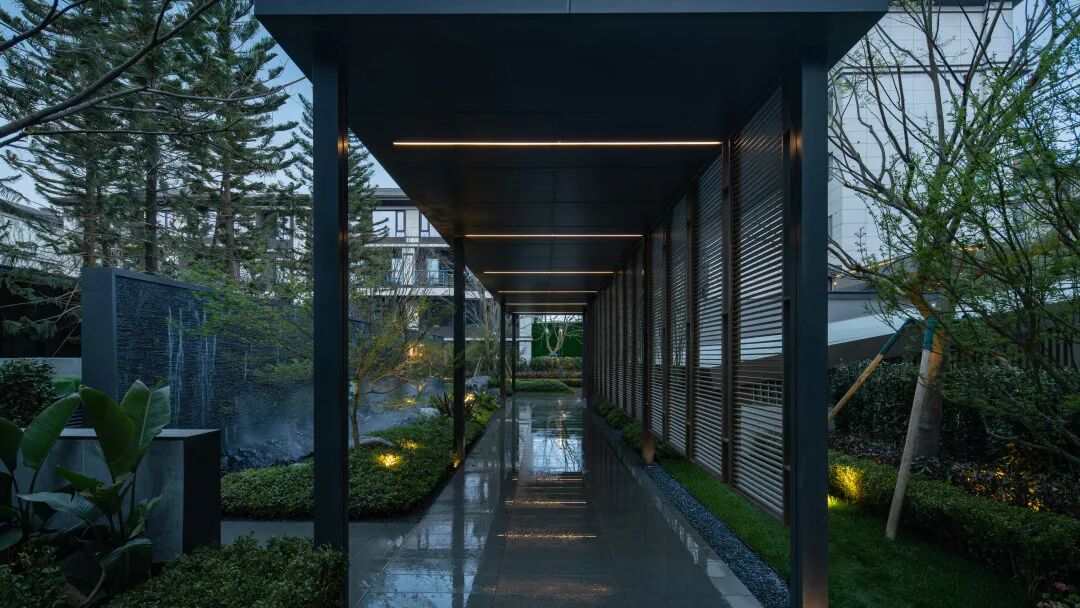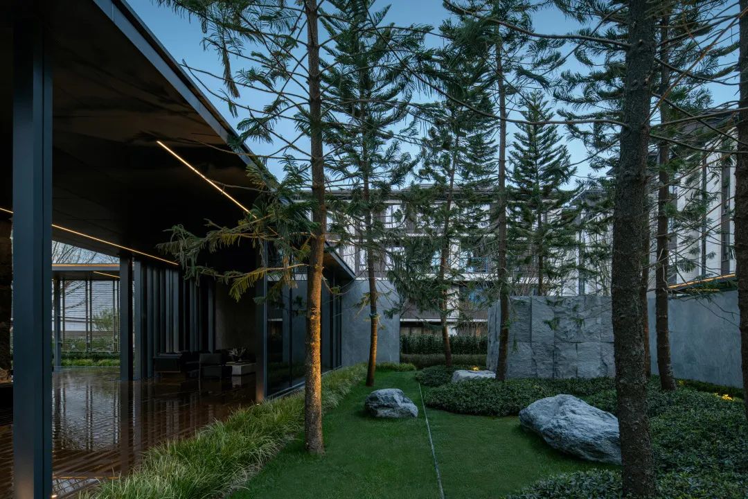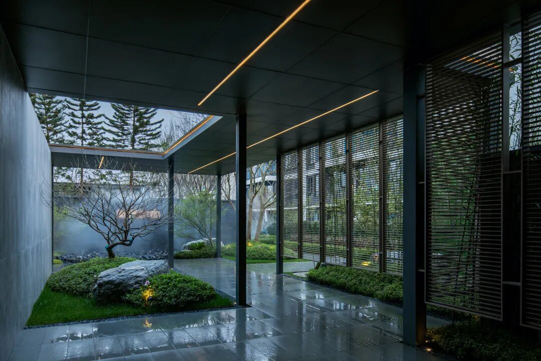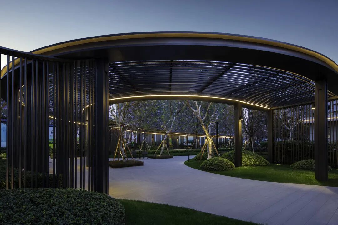 踏入后庭,是别出心裁的空间构成与富氧通透的半开敞廊架空间。结合植物包容与柔和的细微造景,营造简约高级的景致体验效果。