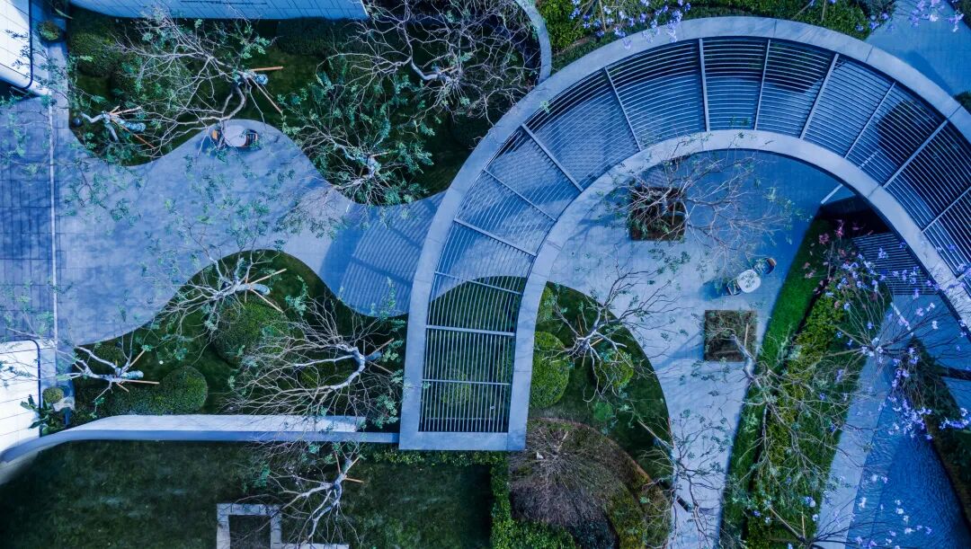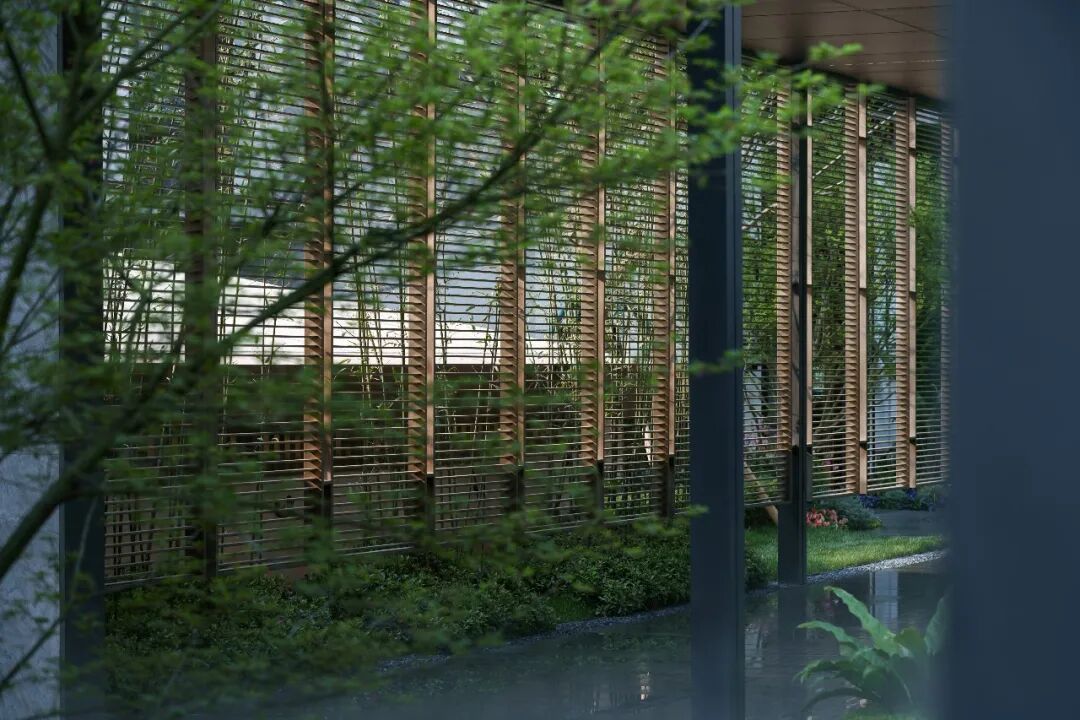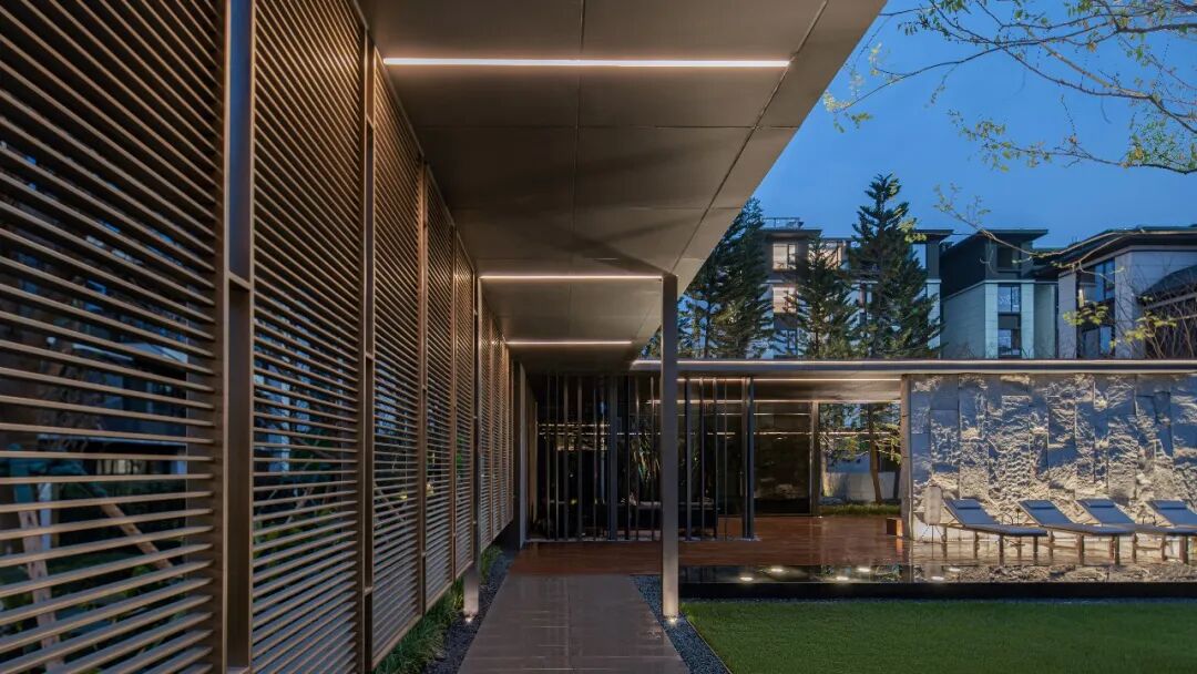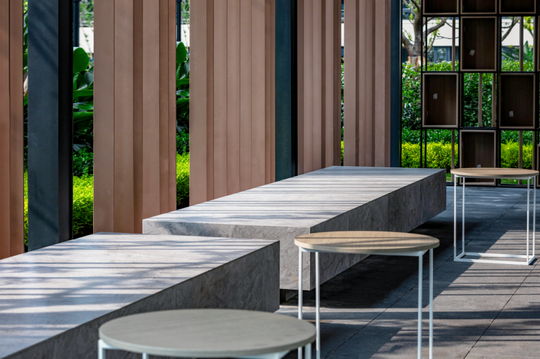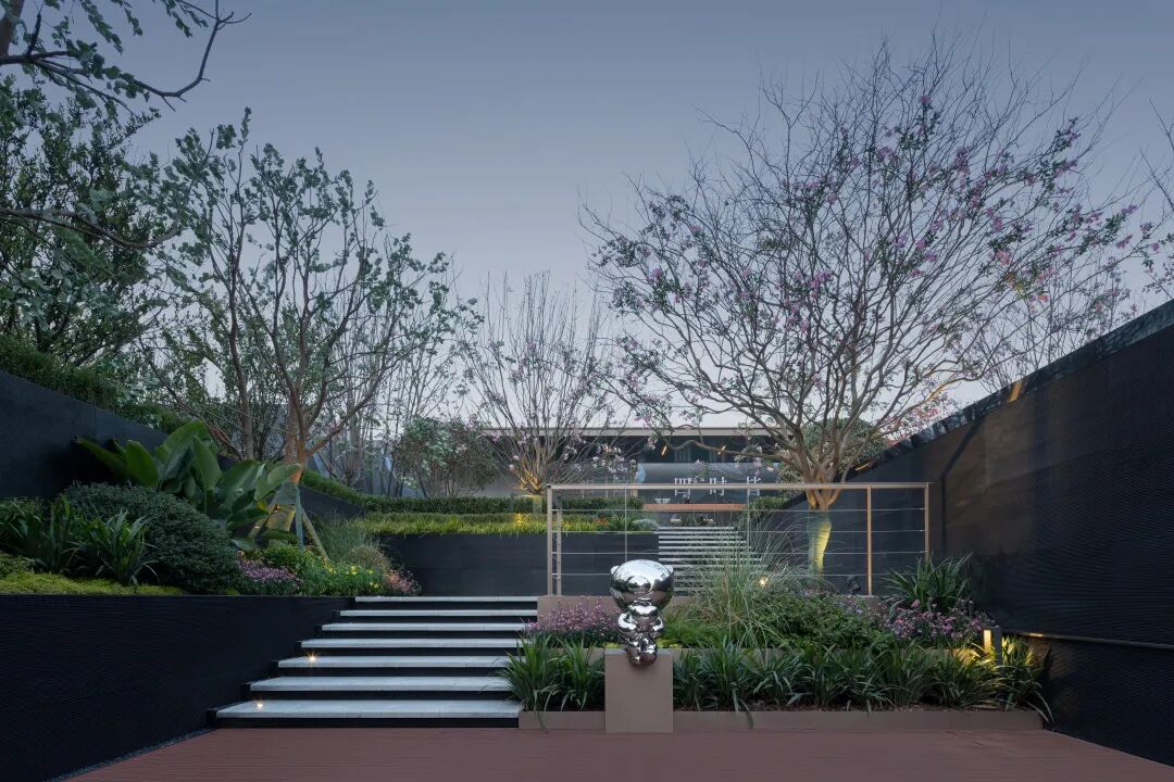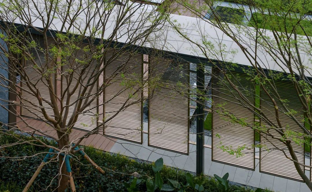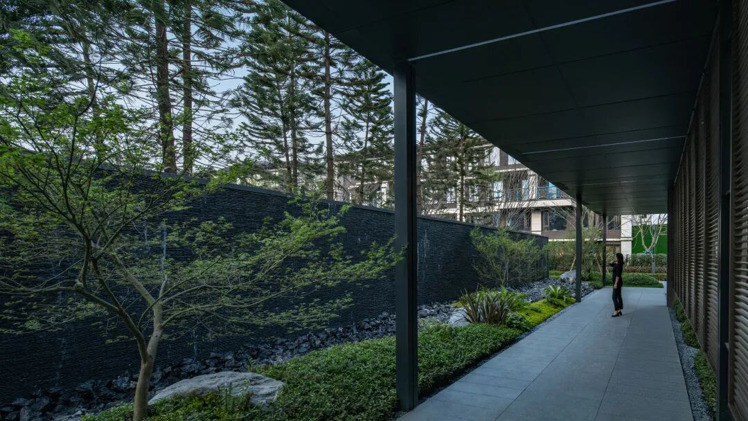 踏入后庭,是别出心裁的空间构成与富氧通透的半开敞廊架空间。结合植物包容与柔和的细微造景,营造简约高级的景致体验效果。