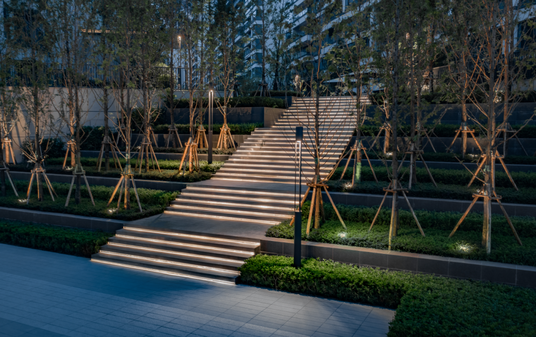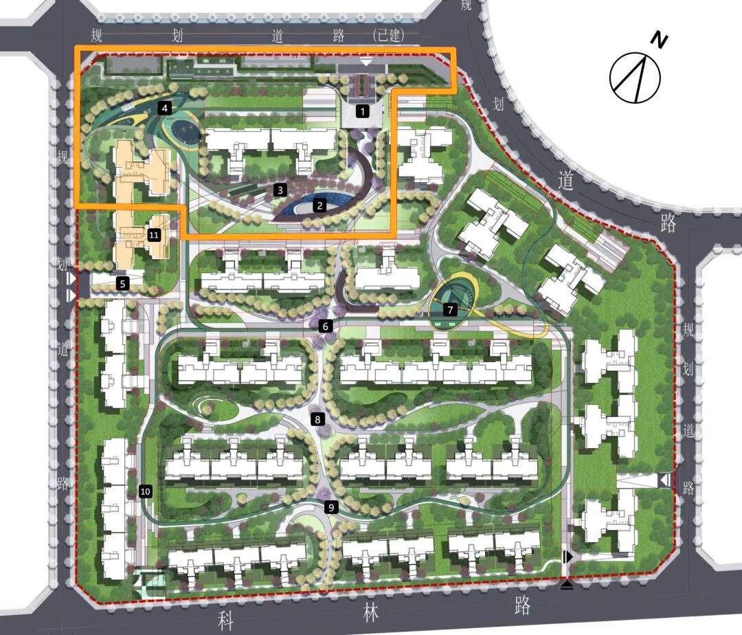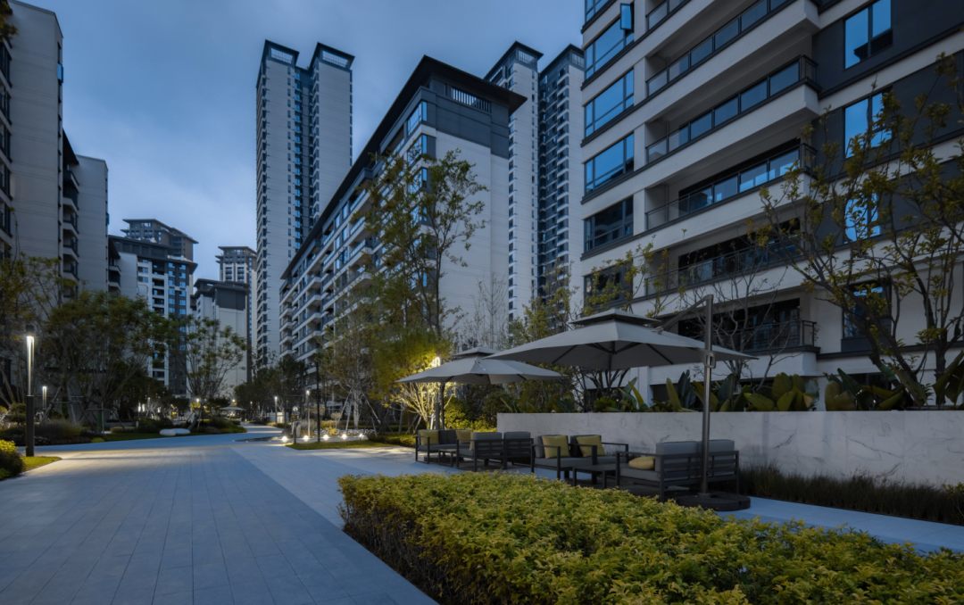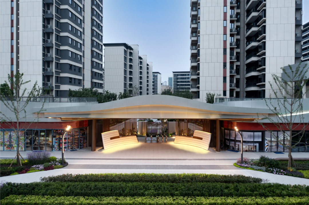 步入园区,流水潺潺折射着光斑,同时感受树林在层层叠叠光耀下的斑驳,享受着归家的仪式感。