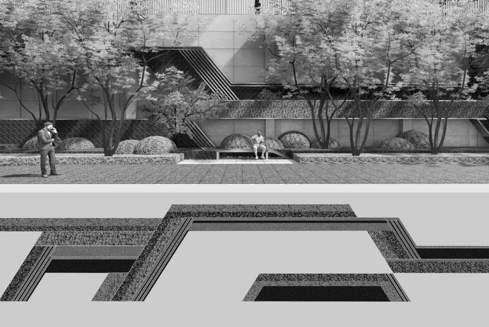 由于场地存在2.6米高差,景观在设计上以朦胧的金属格栅遮挡住入口空间及台阶,通过折线型行进路线消解高差,入口视角无法察觉高度变化,只有步入后才能感知其奥妙。