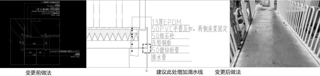 2.钢结构矩管旁边混凝土预留50*50*50的槽,槽内扣DN50半管,顶部转孔,两侧座浆固定,此做法作为RPDM排水用,排水槽与立柱交接位置联通排水。