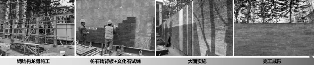 1.考虑规避泛碱和文化石透底,经研判选择仿石砖背板干挂+流水文化石粘贴工艺
