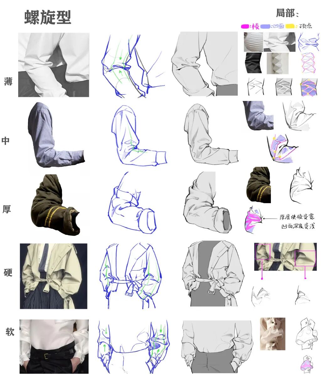 当然,不同面料/材质的衣服,褶皱表现手法也不一样: