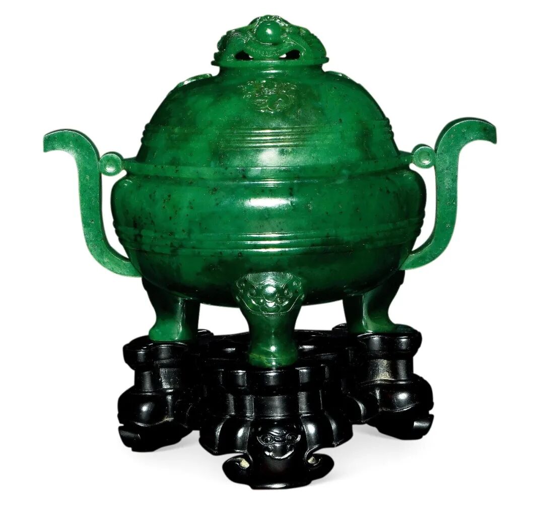 清乾隆 碧玉龙踞钮兽足熏炉(连座)