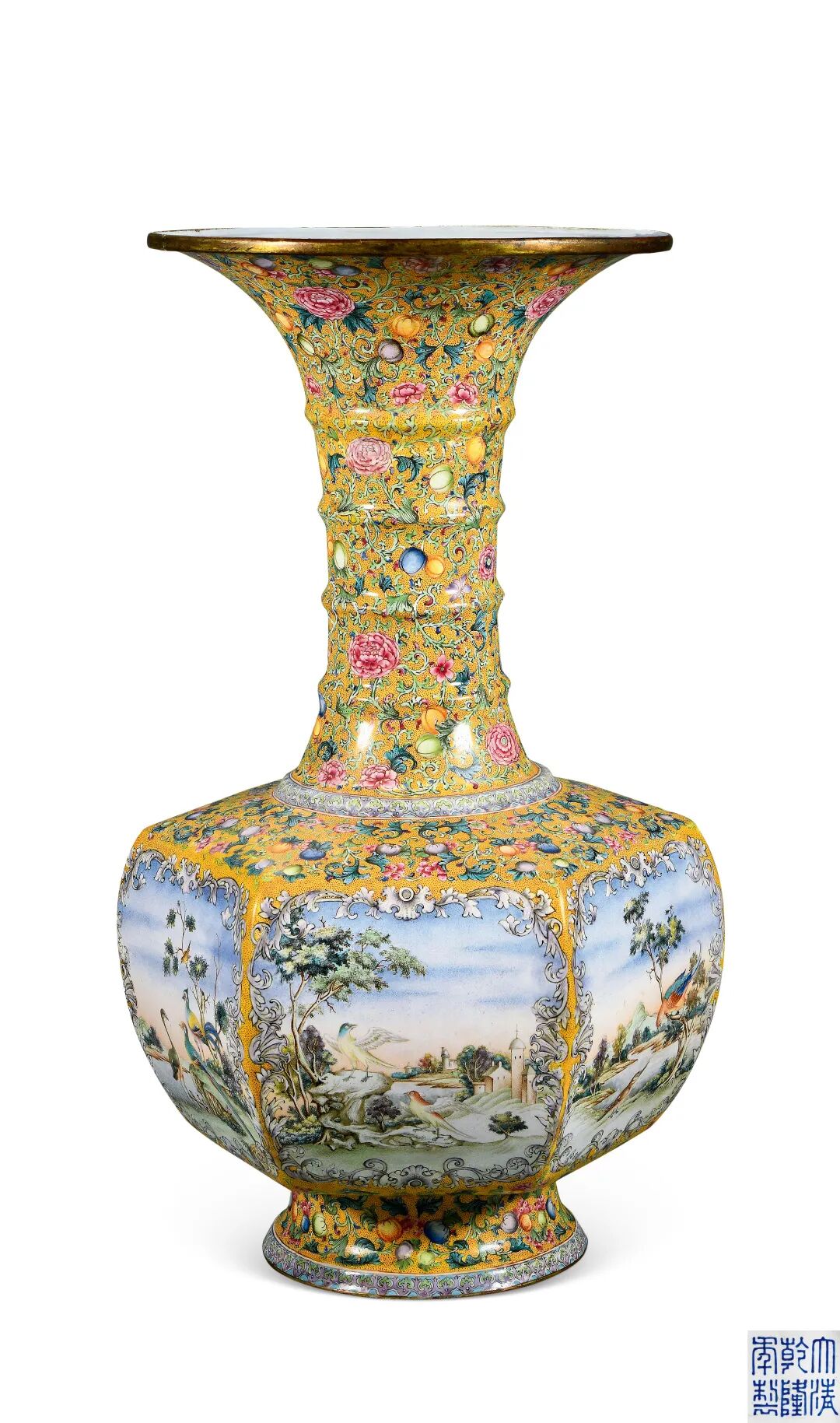 清乾隆 铜胎画珐琅锦地瓜瓞绵绵开光花鸟六方尊