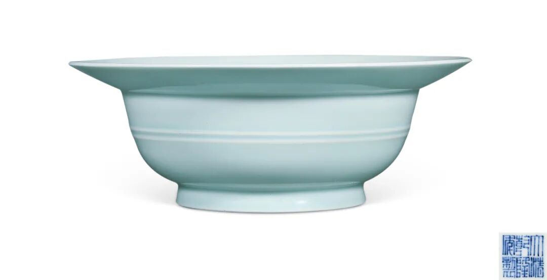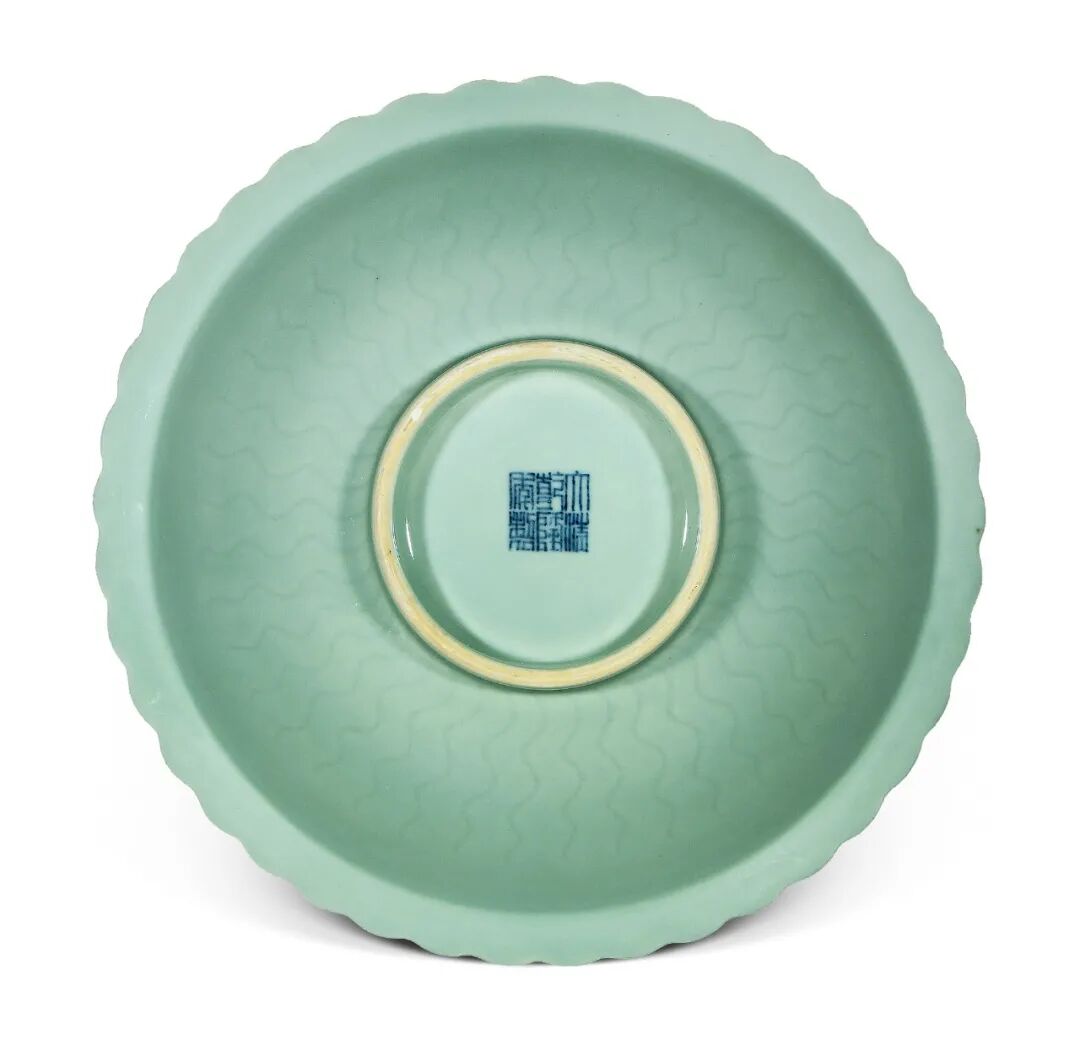 清乾隆 青釉暗刻水波纹花口斗笠大碗(配座)