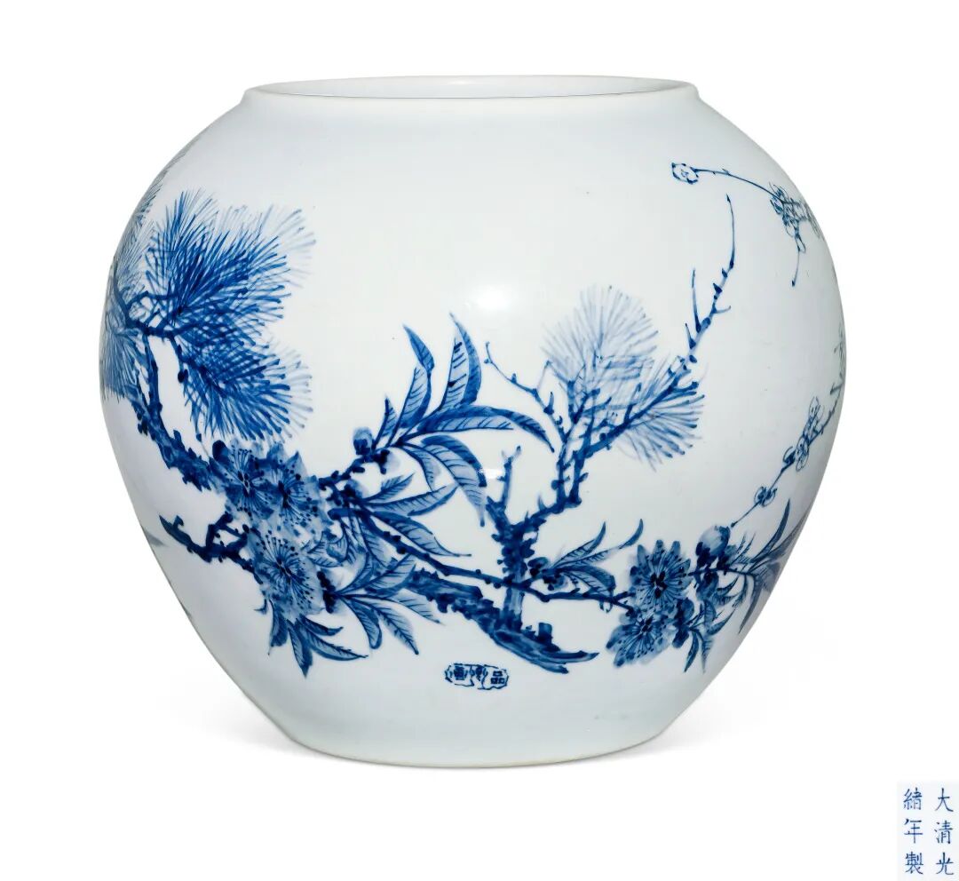 清光绪 金品卿作青花岁寒三友图大球型缸