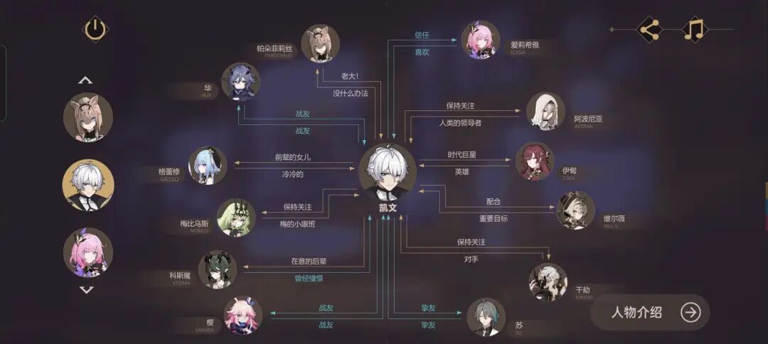 而最能反映侧面叙事的,是来自各个角色的支线对话(在乐土大厅中遇到相关角色后概率触发),这些支线对话多是某角色对另外一些角色的看法,这种手段不但能同时塑造两位角色的人设,也能让碎片化的叙事逐渐体系化——「英桀关系网」可能是这种侧面叙事体系化叙事的代表。