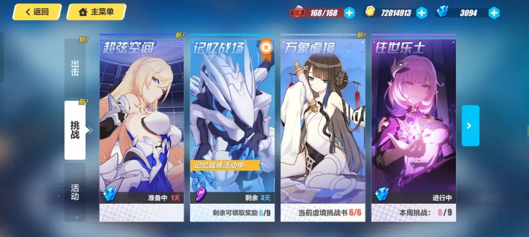 为什么会说「设置为常驻副本」这个行为更大胆?因为之前《崩坏3》也曾多次推出过RogueLike爬塔玩法,但几乎都是以活动内容的形式独立配置。比如最近一次的RogueLike爬塔玩法,是仍在开放的夏日活动,这个活动的主要玩法是策略卡牌对战和RogueLike爬塔;再比如之前曾推出过的、更贴近乐土「老角色改动+技能流派」模式的「无尽噩梦」玩法。