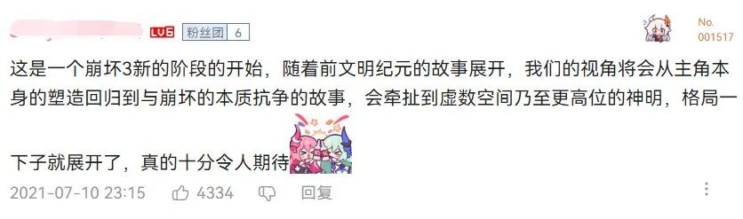 前文提到《崩坏3》早期的内容叙事是偏线性的,这会提高玩家的真实感和参与度,但也会让《崩坏3》的故事范畴困于主角团的认知。因此全新的前文明故事线的补充,不仅仅是设定和世界观上的补充,也让《崩坏3》的内容体系从王道冒险上升到更具史诗和历史感的新阶段——在「往世乐土」概念PV的留言区,玩家也感受到了这种内容维度上的变化。