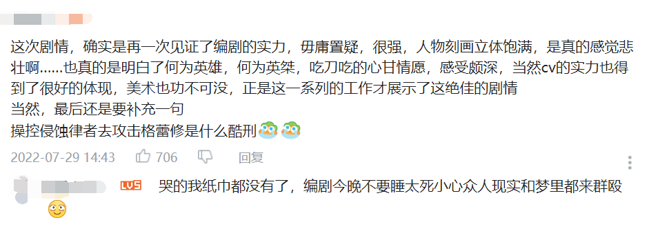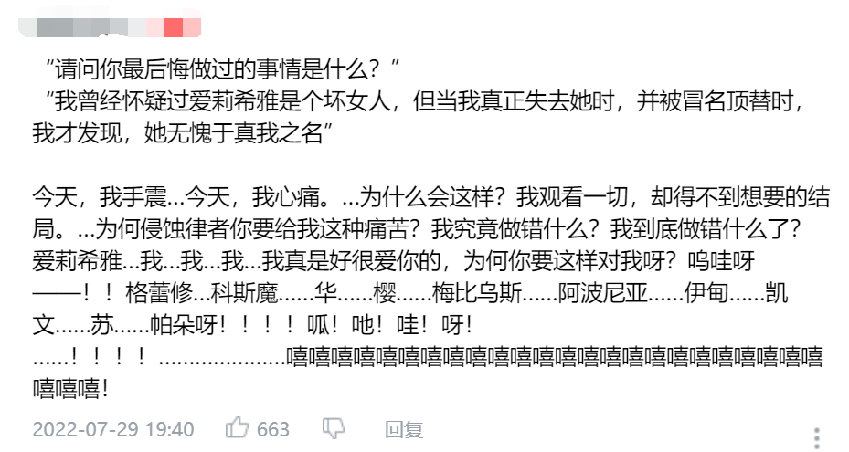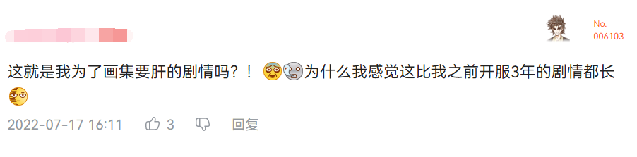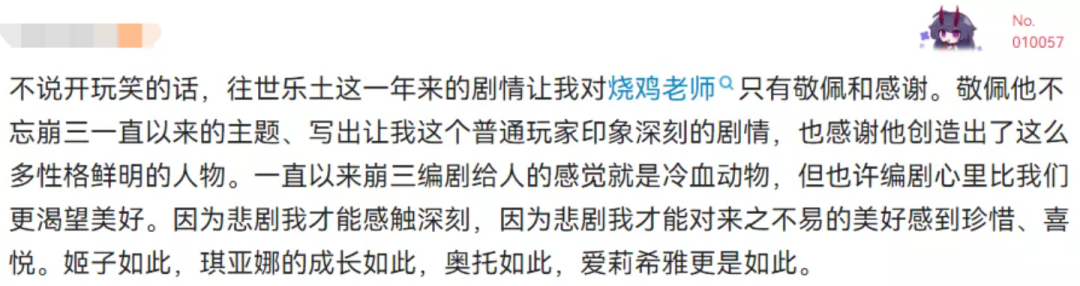 更加「反常」的,是项目团队处理「往世乐土」后半部分内容的方式。此前往世乐土通过铺开前文明宏大的故事线、大笔墨塑造人物和故事背景让玩家沉浸其中,大家都以为故事和角色刚刚起步,一切还有美好的未来,但后半部分笔锋一转,伏笔中的反派直接摧毁了这些美好,13位新角色逐一被刀,消亡退场。前后的反差也让不少玩家的情绪被调动了起来,相关内容社区中都是他们挨刀的评论。
