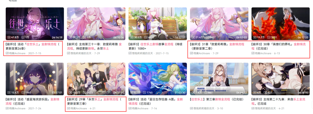 这种喜爱也激发了玩家们的厨力,反映到他们对乐土相关内容的二创视频上。以「往世乐土」为关键词,在B站上检索相关视频,能发现仅8天内的新发布视频总量就超过1000条,其中播放量在百万以上的视频超过10条。而这些视频的内容,大多都围绕庞杂的剧情,以及愈发丰满的角色们展开。