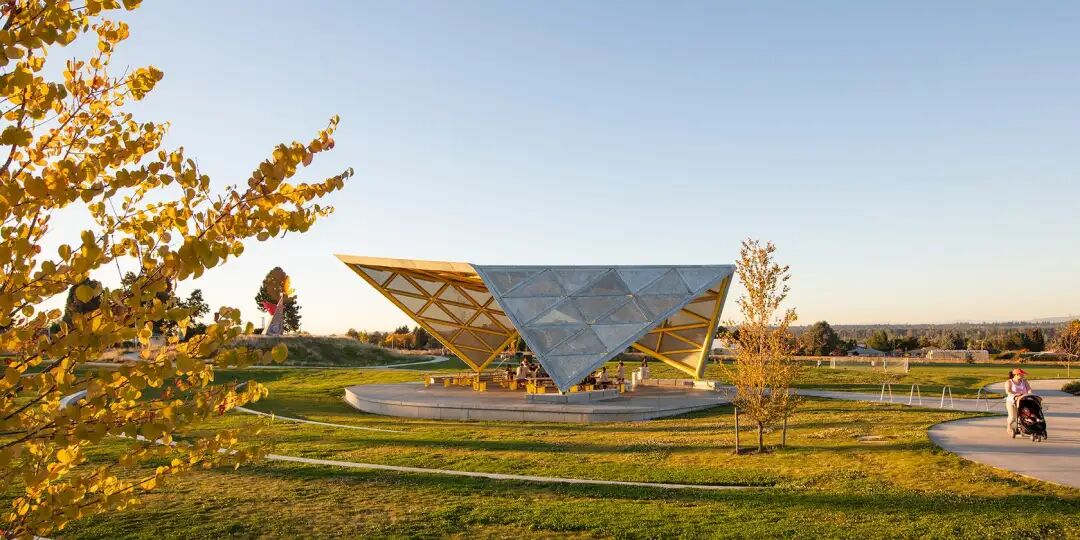 公园的设计焦点是像是大型折纸的建筑,镀锌钢的结构侧面有穿孔的三角形板,可以在白天野餐时提供自然采光;晚上变成一个圆形剧场,为公园里的剧迷建造了一个真正的“绿色世界”。