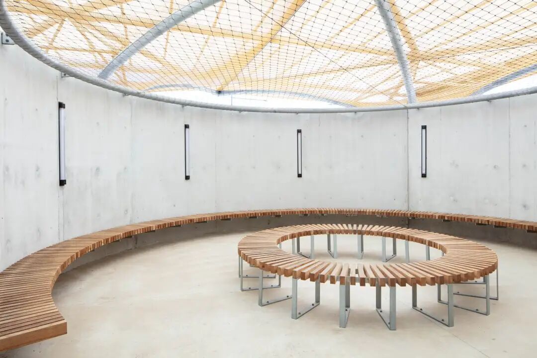 展馆的柔和曲线环绕着椭圆形运动,带有放射状网格,起伏的混凝土墙包围了圆形空间,这些空间开放,但通过带有大悬垂的宽阔玻璃纤维屋顶保护免受风、雨和阳光的影响。拱形钢结构上垂下一个黄色网状结构,就像一个树冠让日光透过,同时赋予欢乐和愉悦的元素。