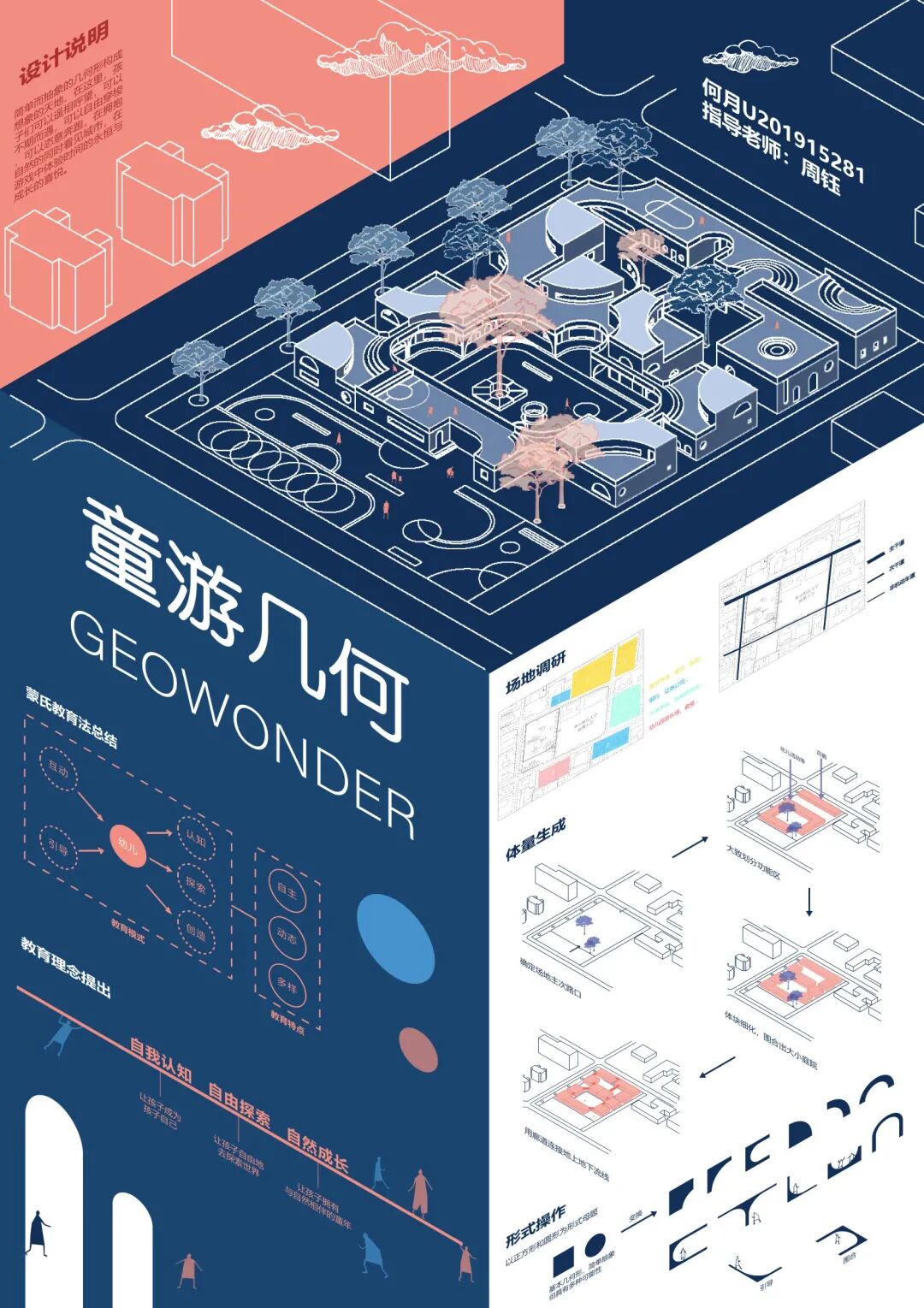 本次设计从儿童的心理与行为研究出发,通过学习蒙氏教育法,提出让孩子“自主认知、自由探索、自然成长”的教育理念,建筑形式以正方形和圆形为母题,对体块进行切割、增减等变换操作,通过调整尺度塑造适合不同年龄段的孩子的活动空间,让孩子和成人都能获得丰富的空间体验。简单而抽象的几何形构成想象的天地,在那里,孩子们可以遥相呼望,可以不期而遇,可以自由穿梭,可以恣意奔跑,在拥抱自然的同时看见城市,在游戏中体验时间的永恒与成长的喜悦。