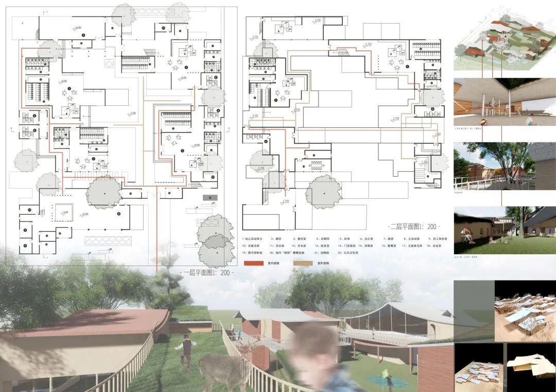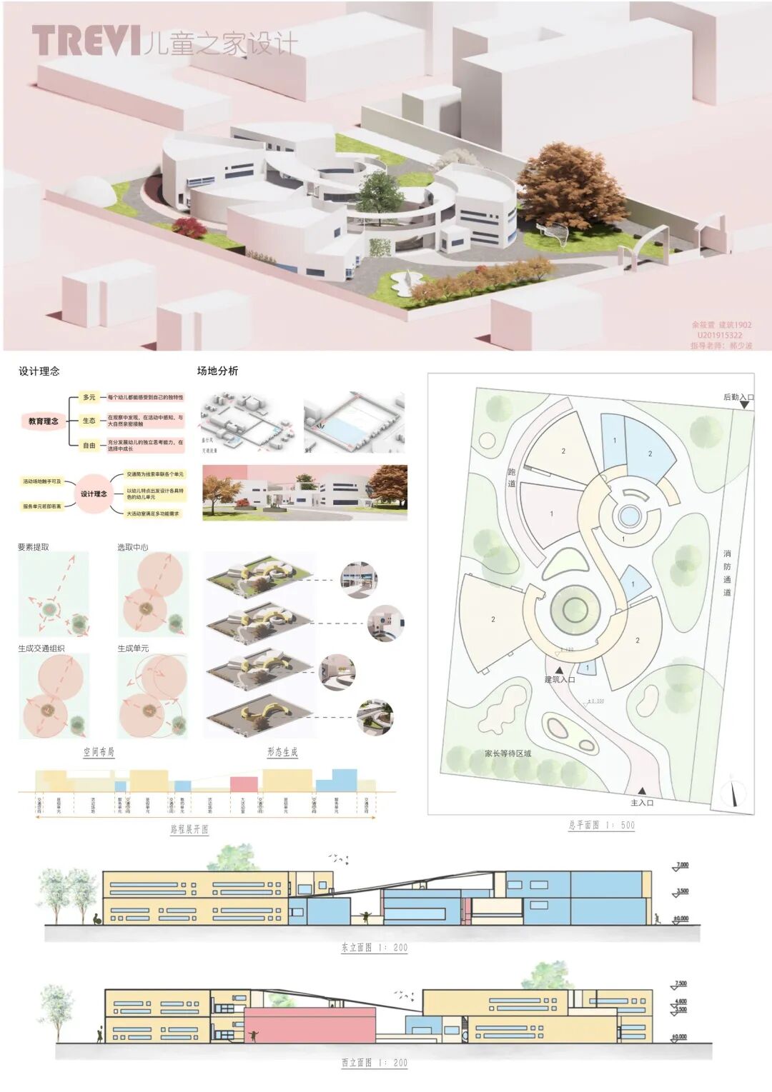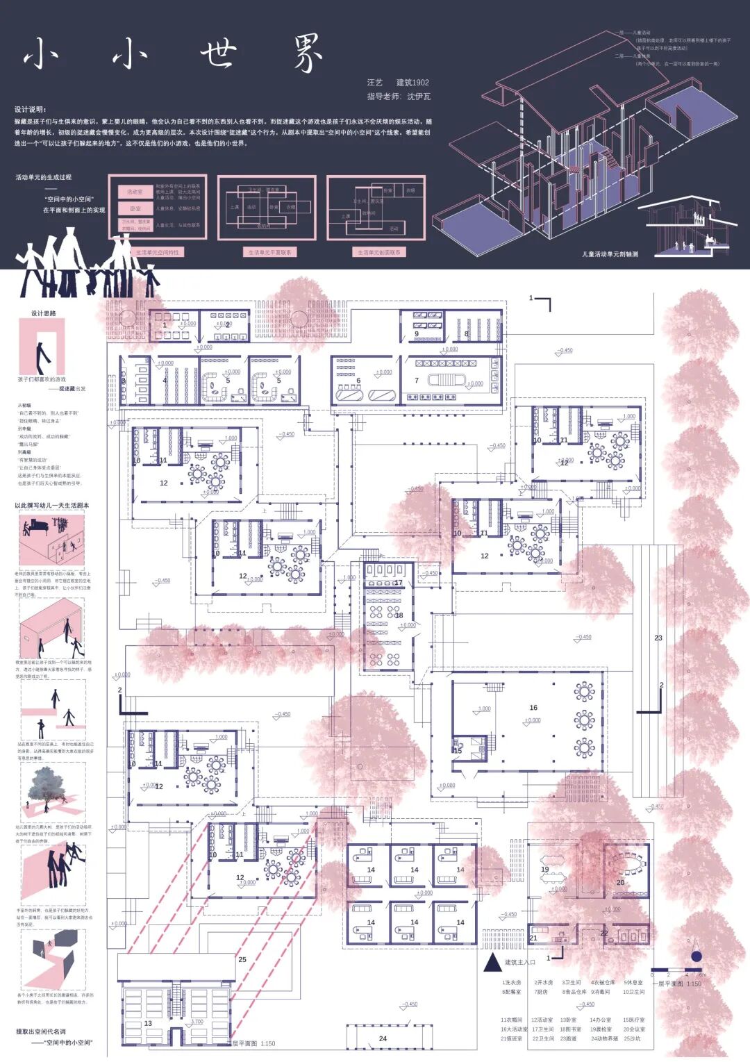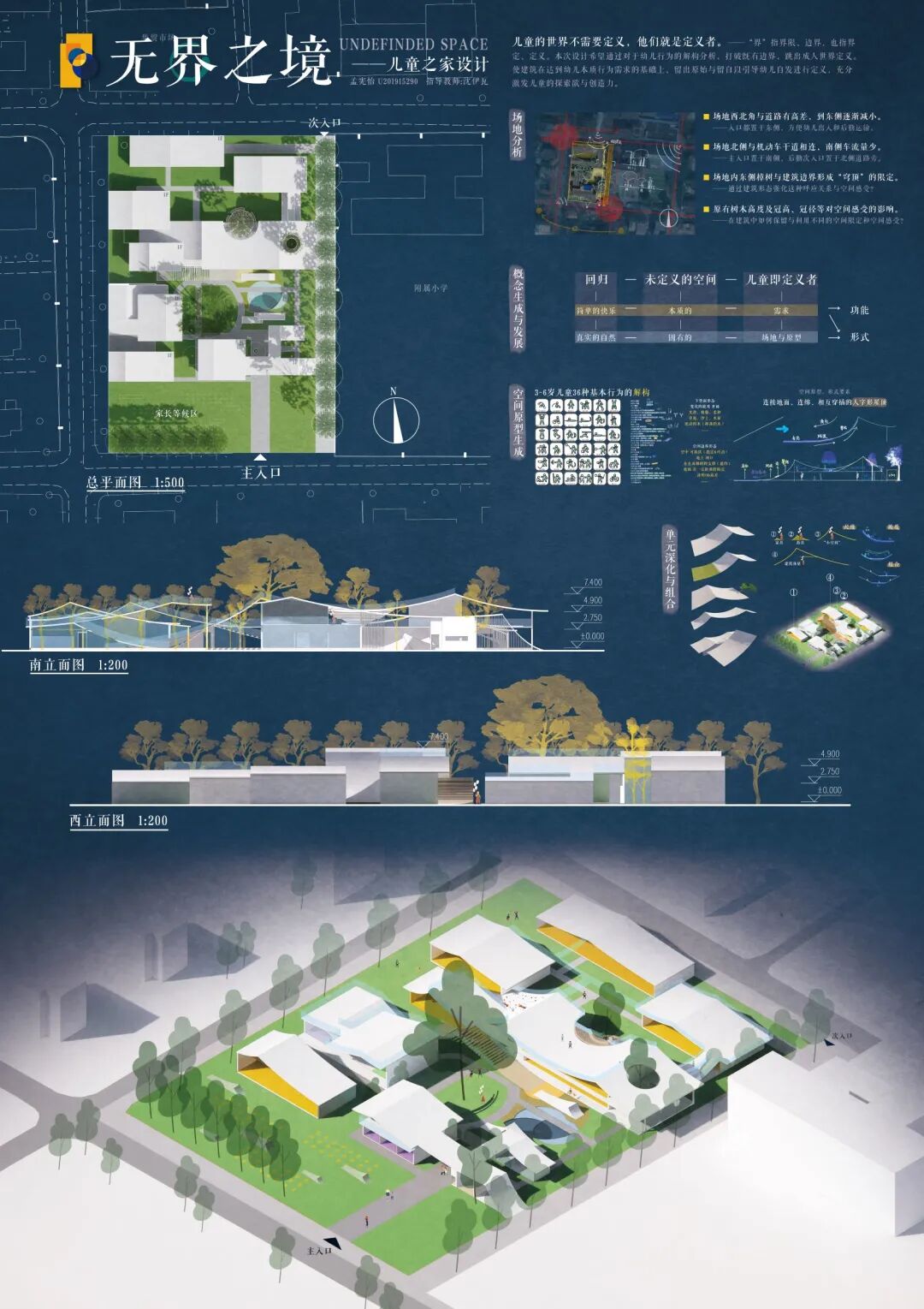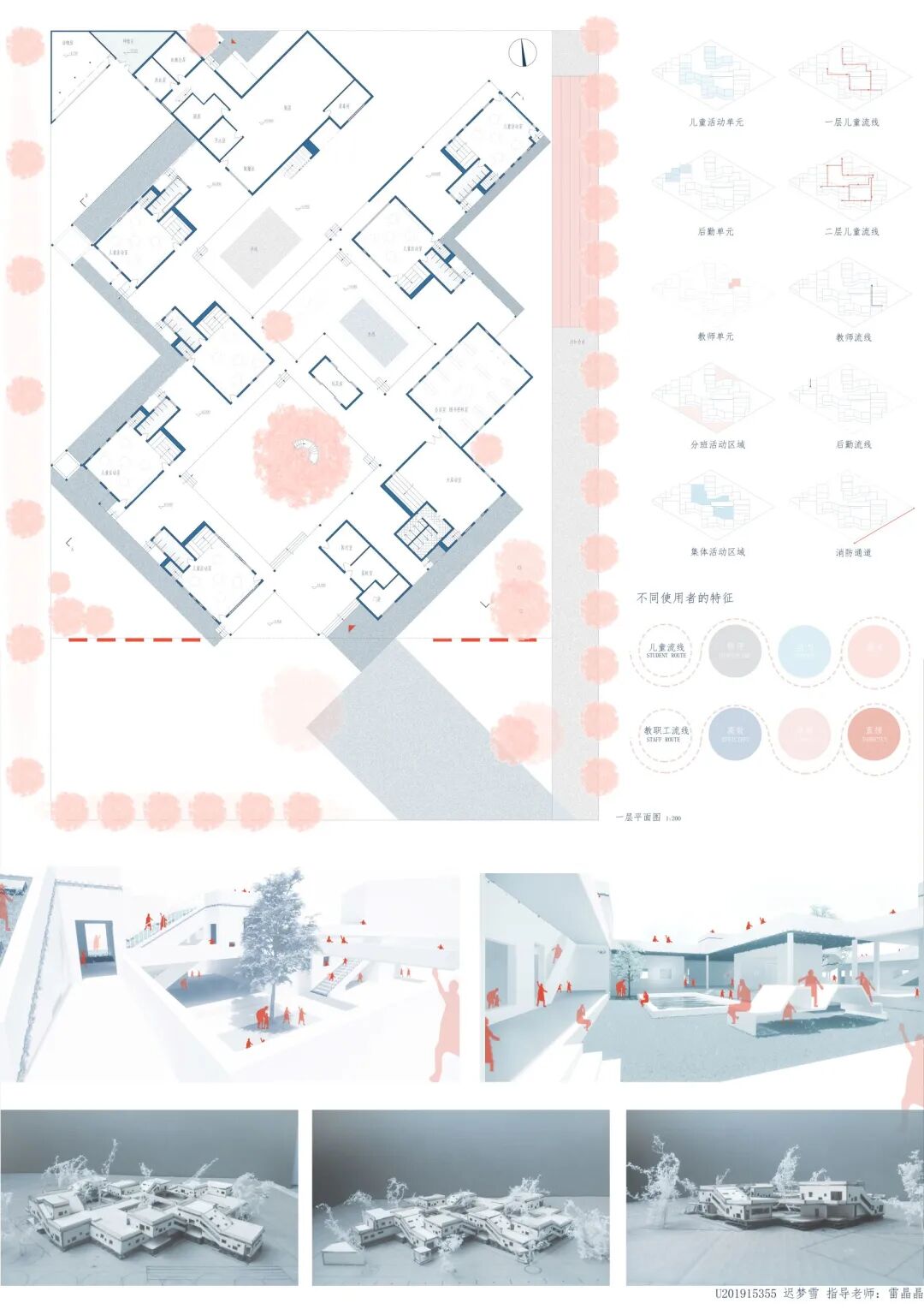 针对社会现状提出解决问题的策略——置入两个不同功能的庭院,再通过对儿童一天的时间线的折叠,进一步转化为空间的布置模式。充分考虑场地周边条件,以一种谦逊的状态将建筑置入到场地之中,再通过相减的手法加入两个庭院。希望孩子们能够在这片地上既能够与家长增进交流,又能够在自己的世界里快乐成长。