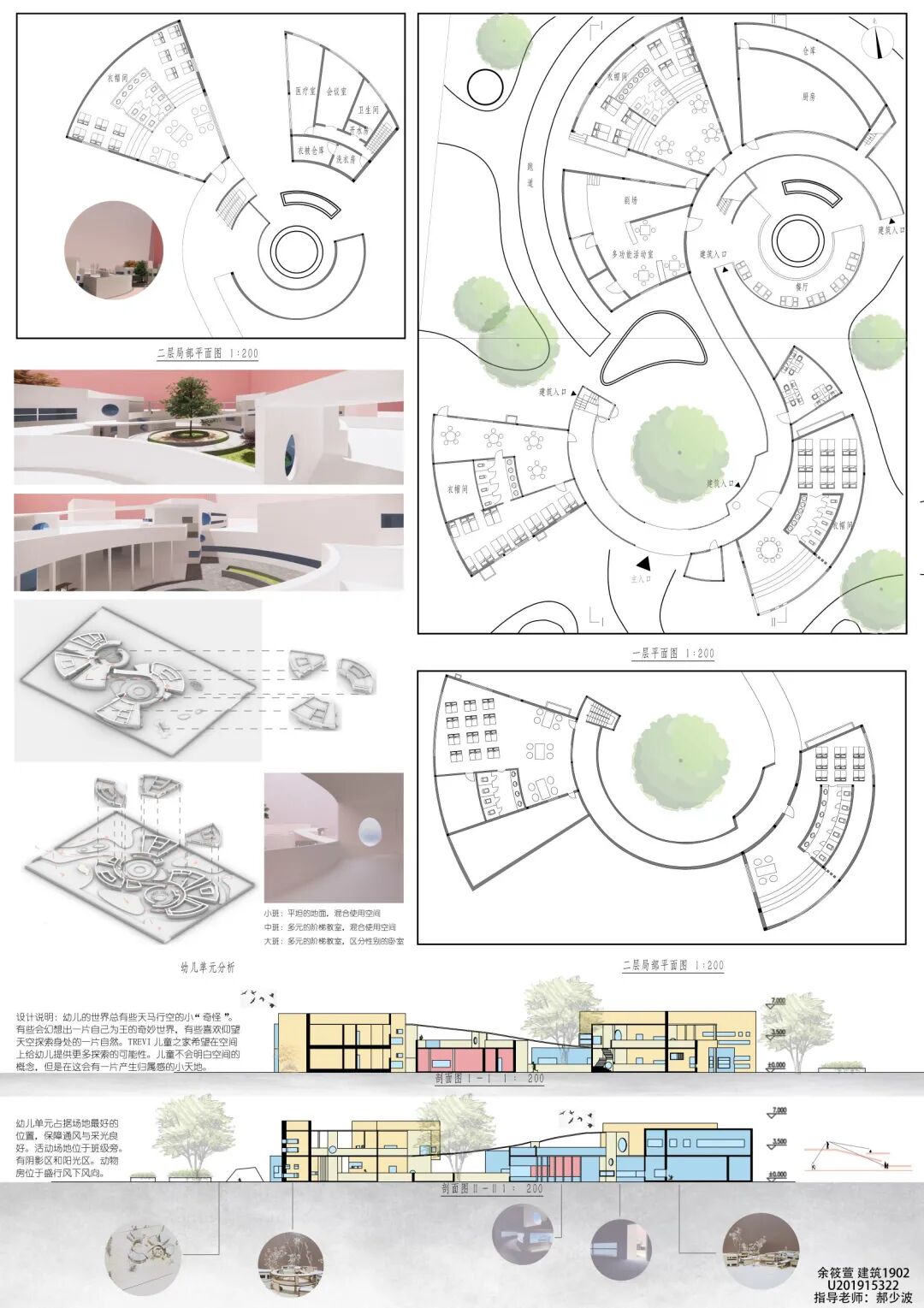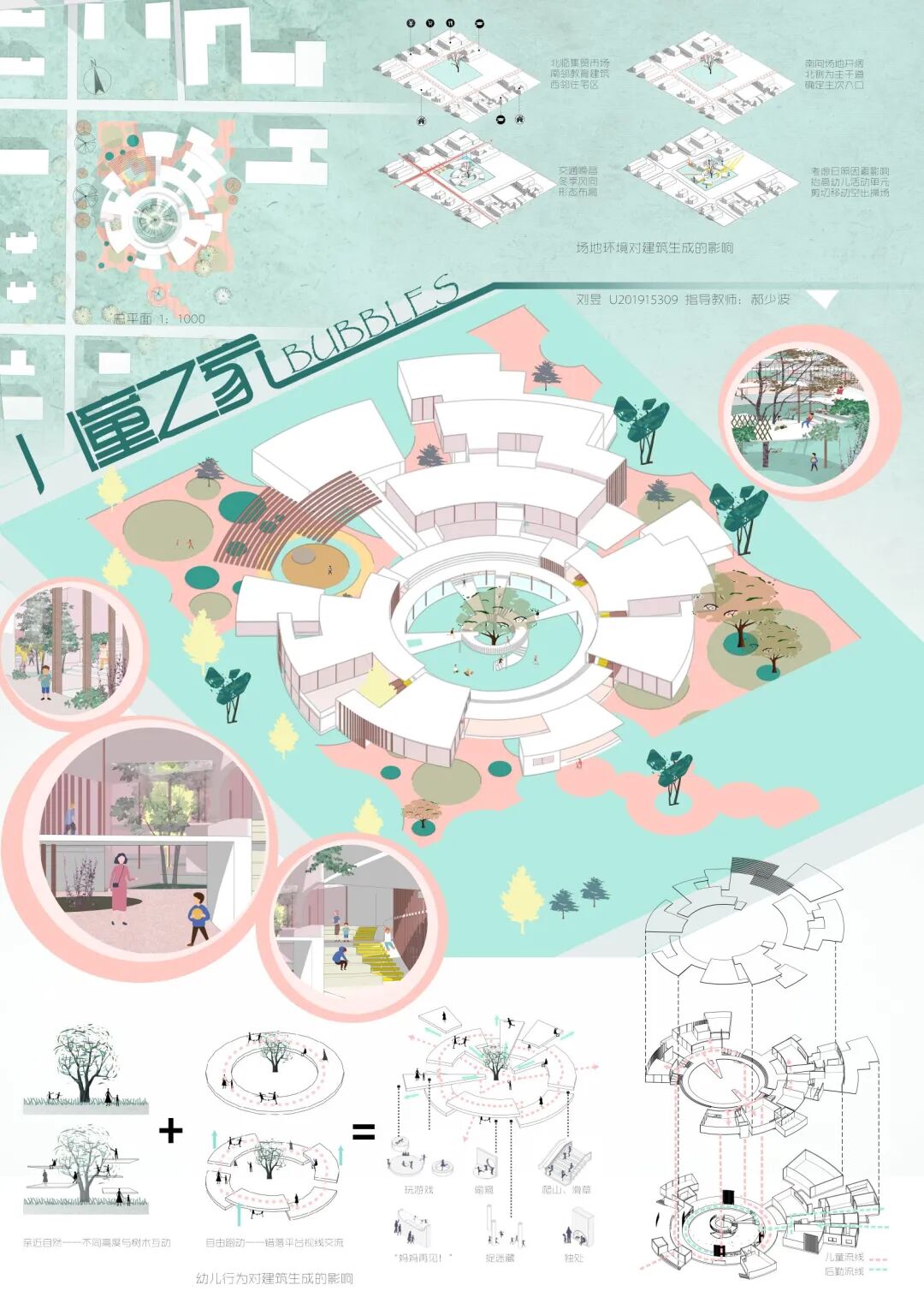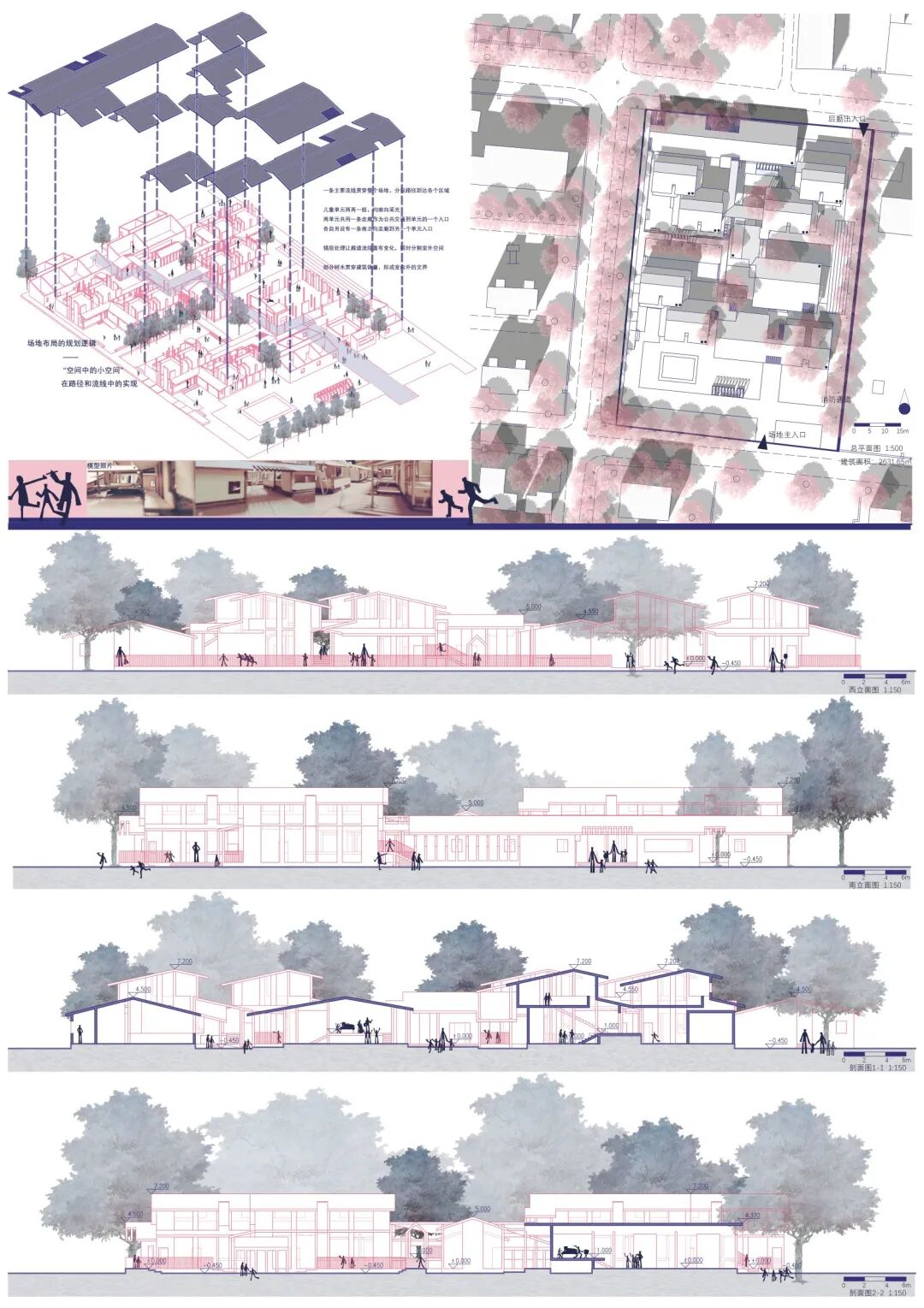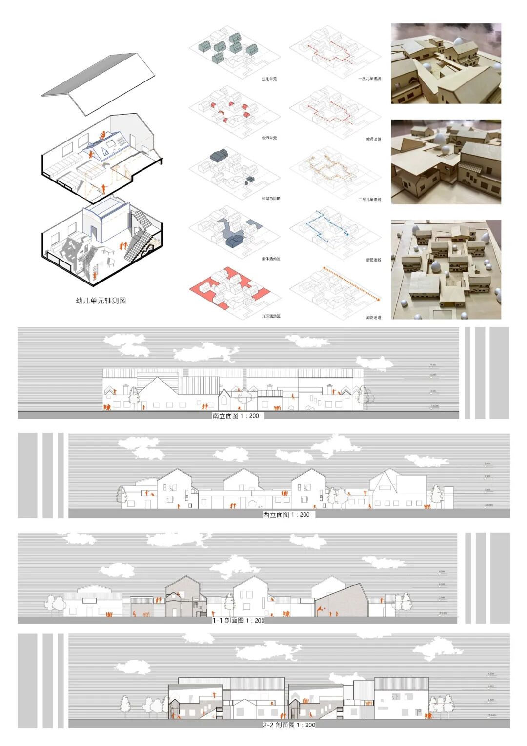 针对社会现状提出解决问题的策略——置入两个不同功能的庭院,再通过对儿童一天的时间线的折叠,进一步转化为空间的布置模式。充分考虑场地周边条件,以一种谦逊的状态将建筑置入到场地之中,再通过相减的手法加入两个庭院。希望孩子们能够在这片地上既能够与家长增进交流,又能够在自己的世界里快乐成长。
