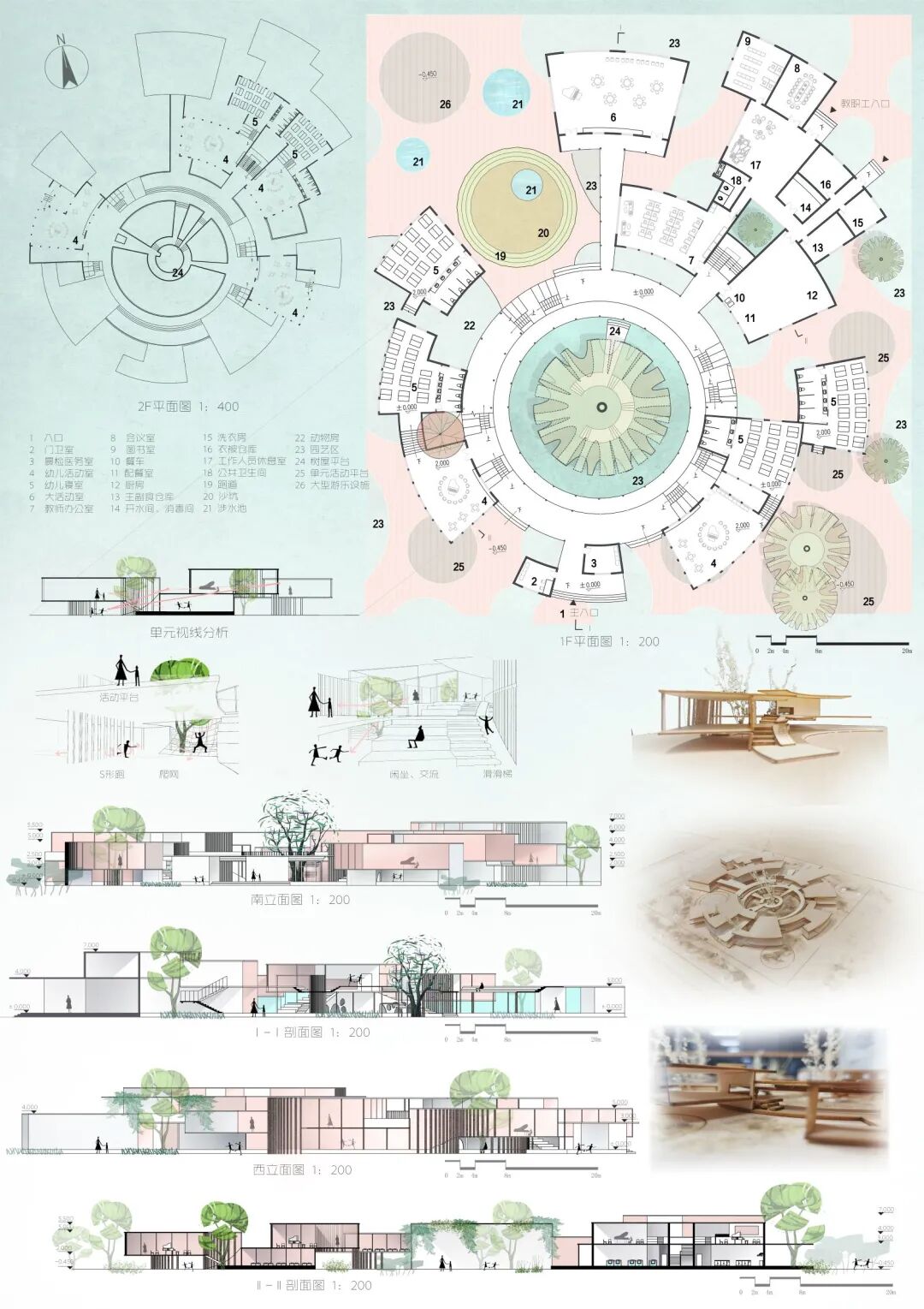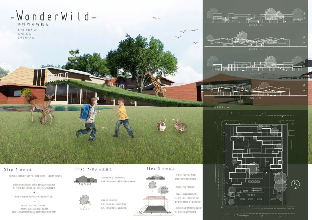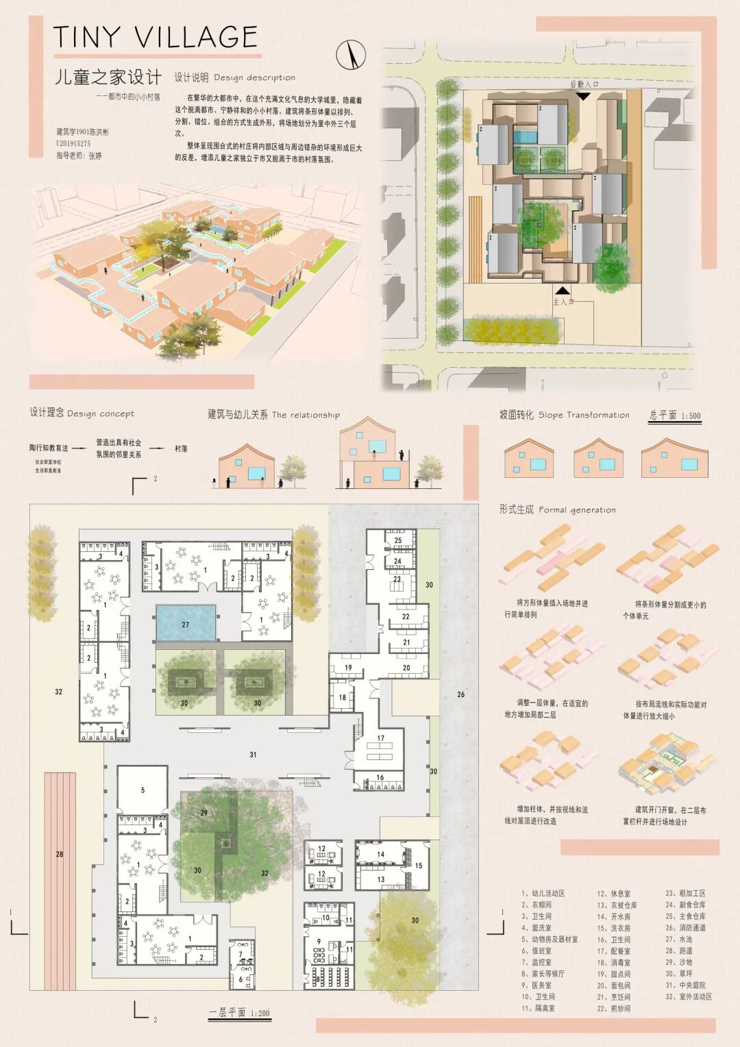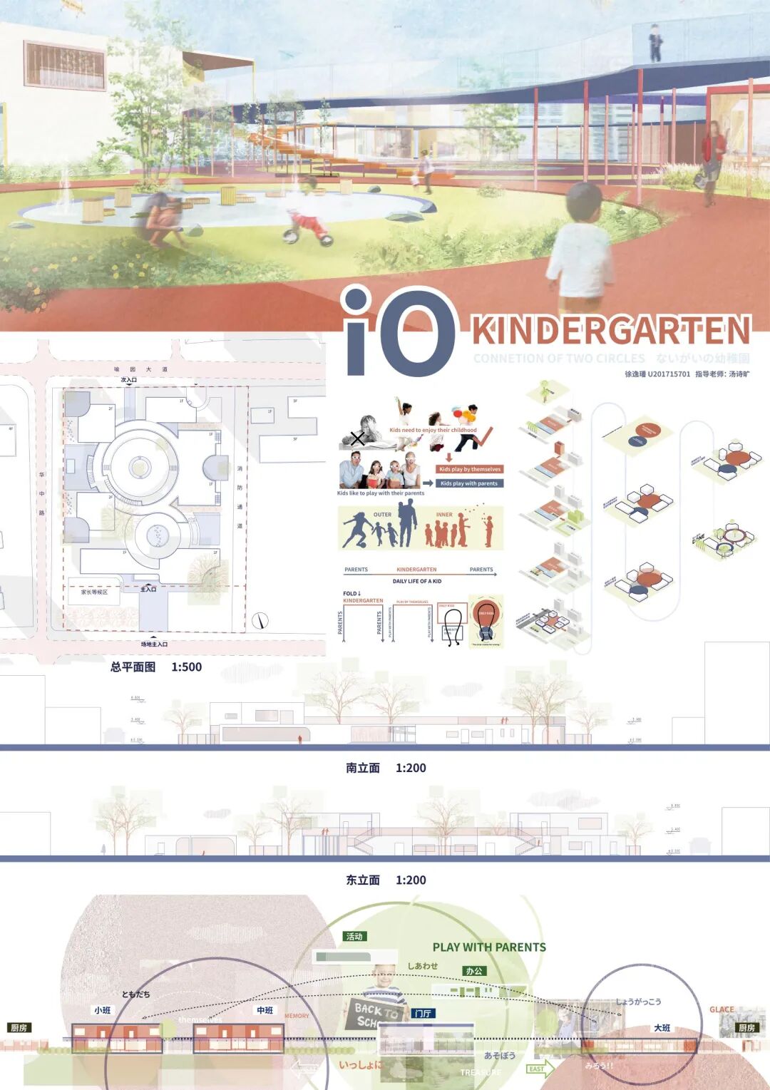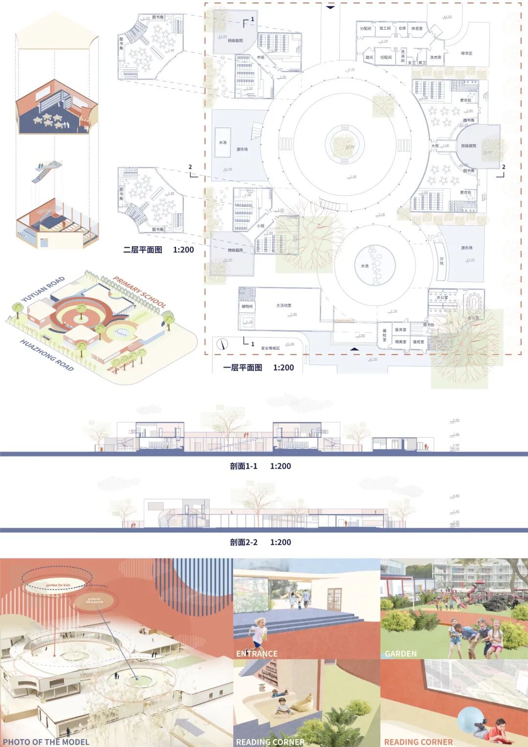 针对社会现状提出解决问题的策略——置入两个不同功能的庭院,再通过对儿童一天的时间线的折叠,进一步转化为空间的布置模式。充分考虑场地周边条件,以一种谦逊的状态将建筑置入到场地之中,再通过相减的手法加入两个庭院。希望孩子们能够在这片地上既能够与家长增进交流,又能够在自己的世界里快乐成长。