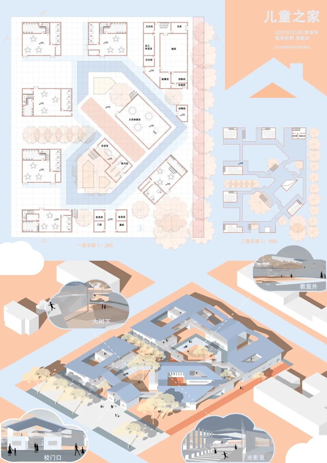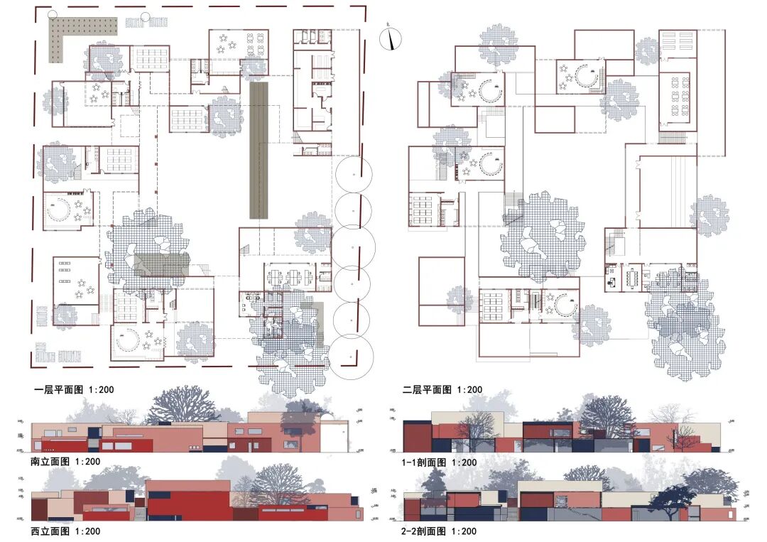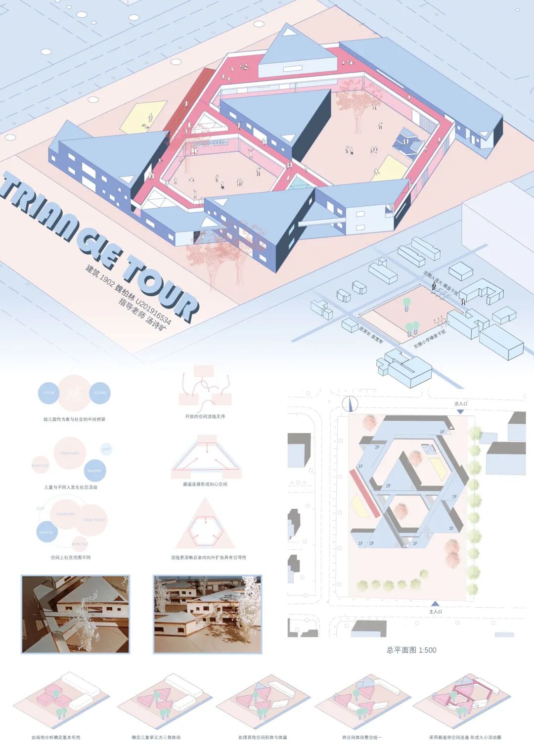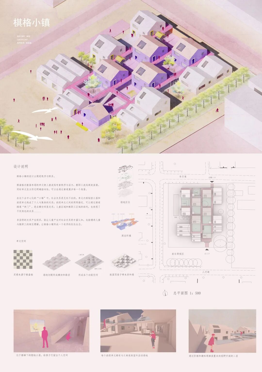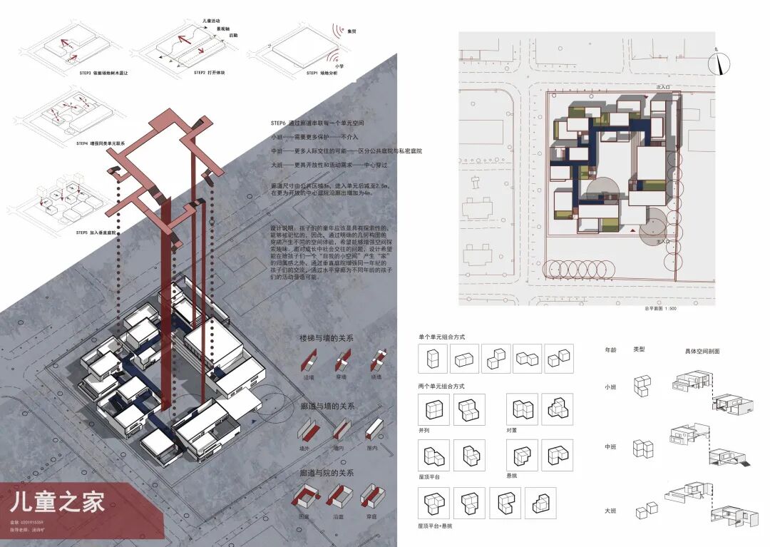 针对社会现状提出解决问题的策略——置入两个不同功能的庭院,再通过对儿童一天的时间线的折叠,进一步转化为空间的布置模式。充分考虑场地周边条件,以一种谦逊的状态将建筑置入到场地之中,再通过相减的手法加入两个庭院。希望孩子们能够在这片地上既能够与家长增进交流,又能够在自己的世界里快乐成长。