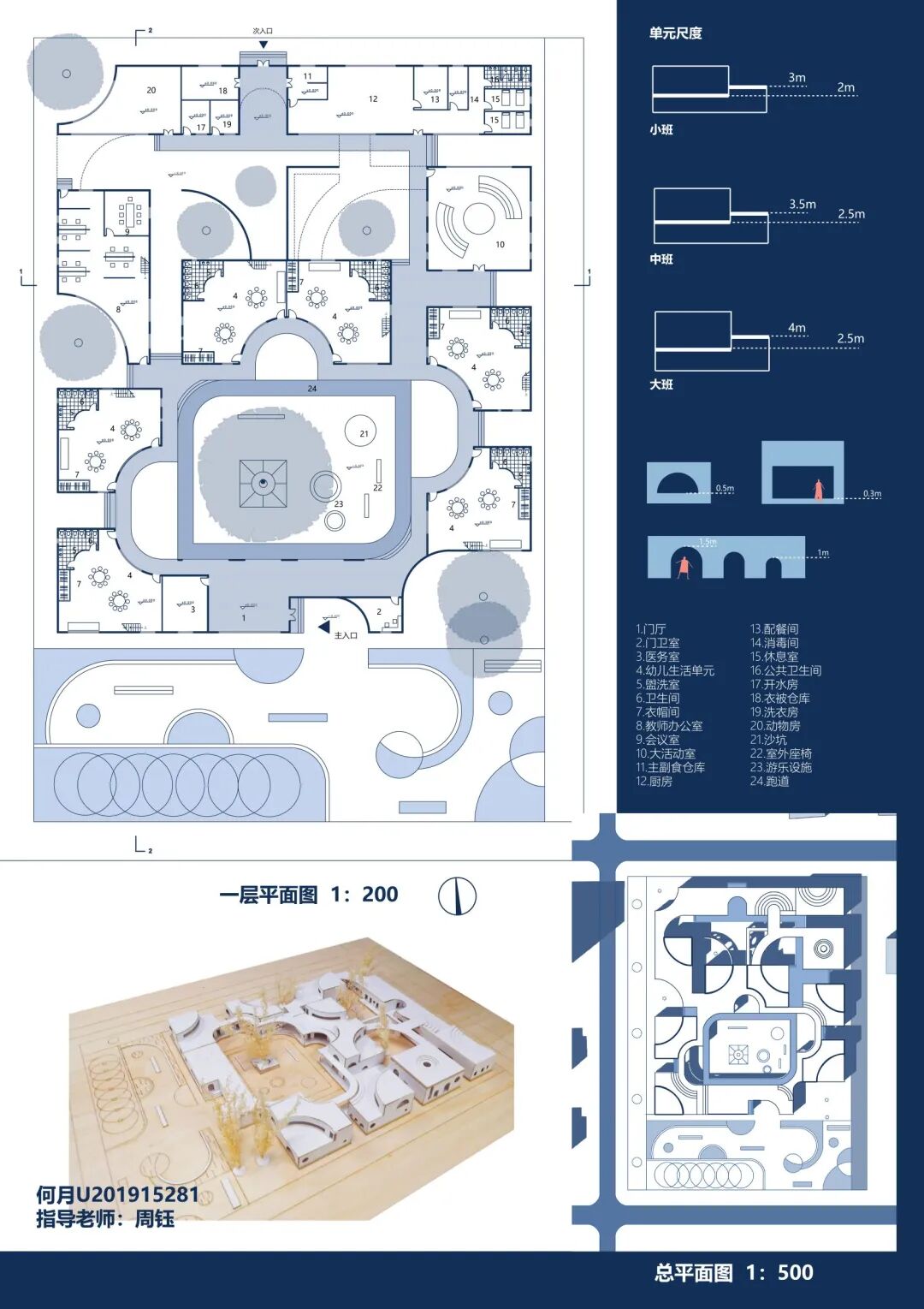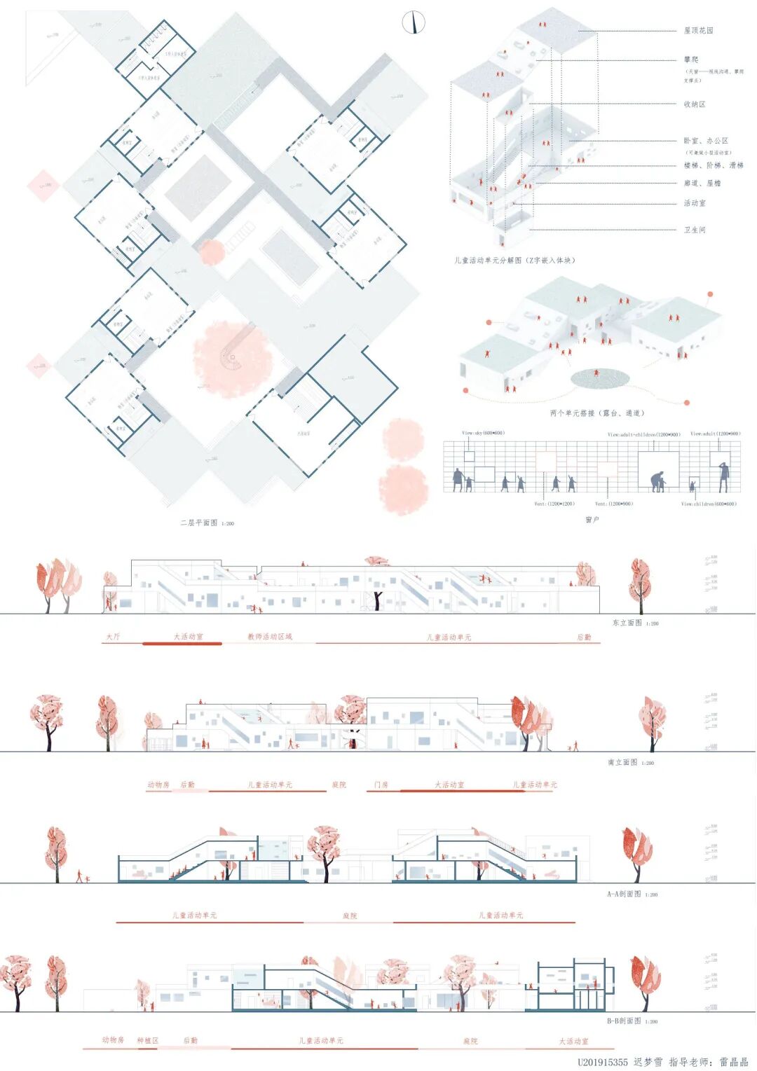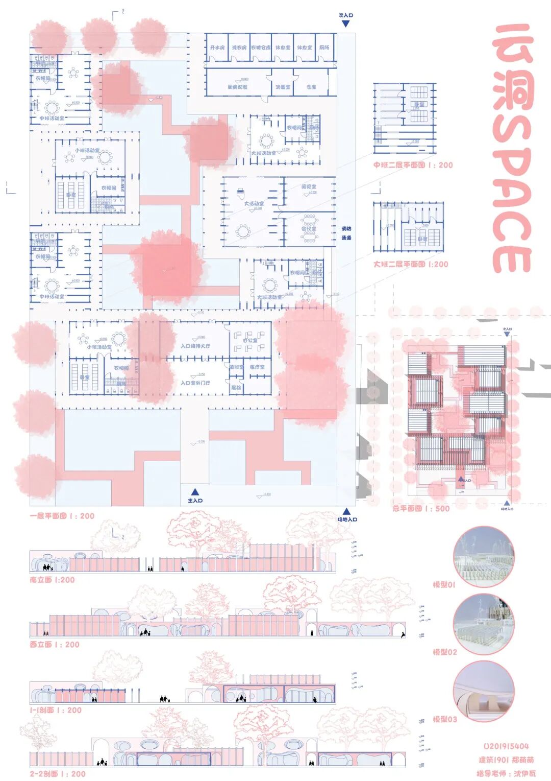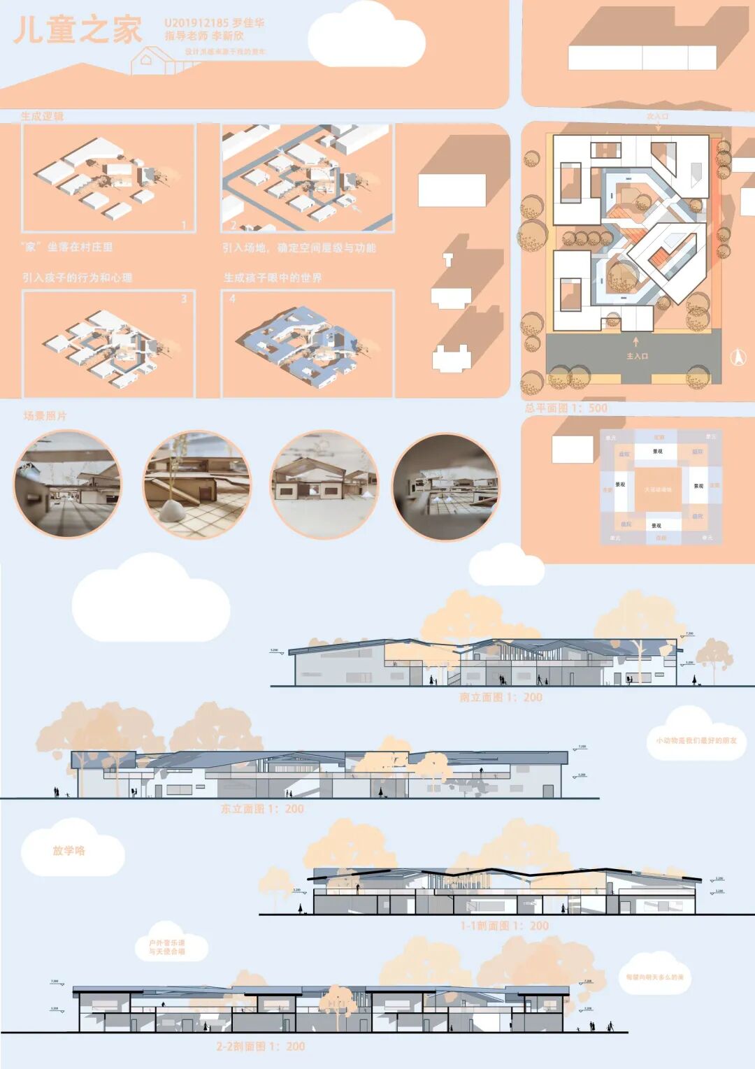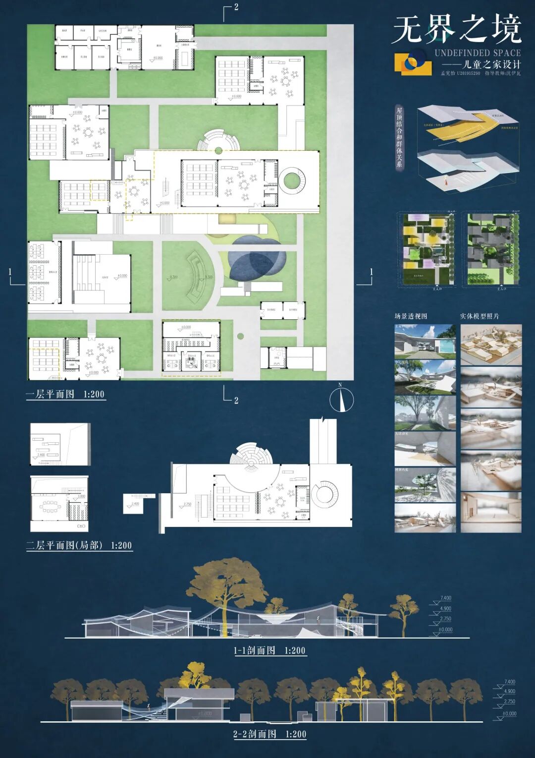 针对社会现状提出解决问题的策略——置入两个不同功能的庭院,再通过对儿童一天的时间线的折叠,进一步转化为空间的布置模式。充分考虑场地周边条件,以一种谦逊的状态将建筑置入到场地之中,再通过相减的手法加入两个庭院。希望孩子们能够在这片地上既能够与家长增进交流,又能够在自己的世界里快乐成长。
