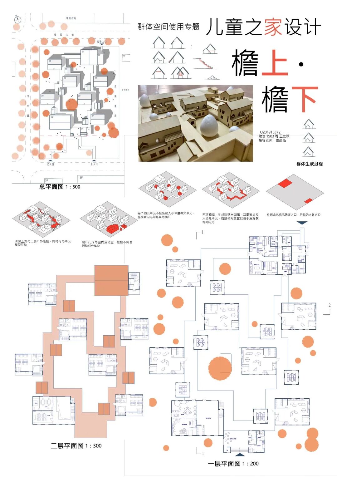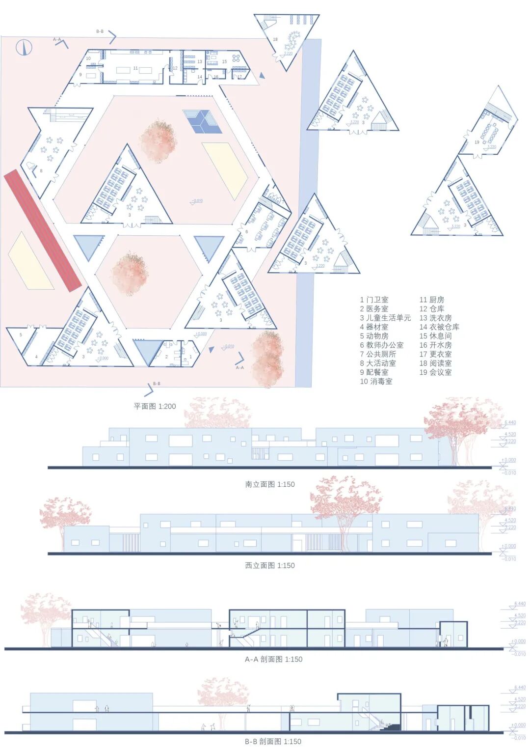 本次儿童之家设计,从概念出发,希望通过不同空间范围的社交活动圈,在儿童之家中打造出多群体的共同社交空间,增加儿童的社交范围,以此达到向大孩子及大人学习的目的。而在最为主要的儿童生活单元选取三角形体块,使三种年龄层级的儿童单元围合形成中心庭院,同时形成六边形环形流线,同时满足社交与奔跑运动的需求。儿童单元又与后勤、教师空间整体沿场地形成大环形流线,与成人产生交互,同时产生大小庭院,空间逐步递进。