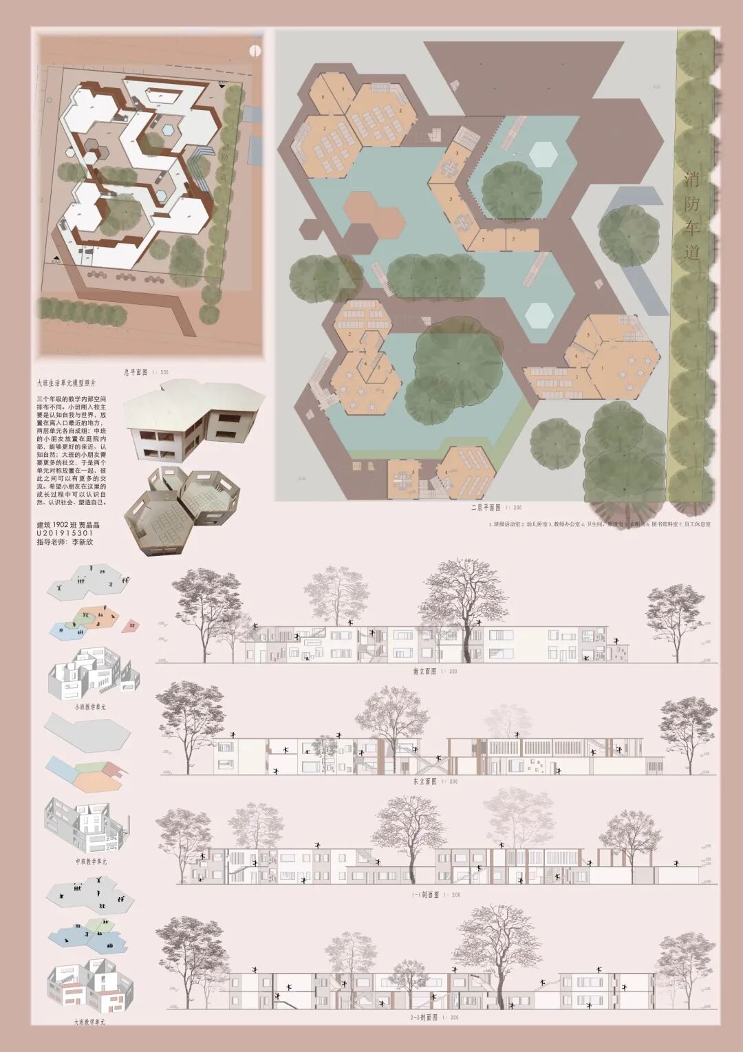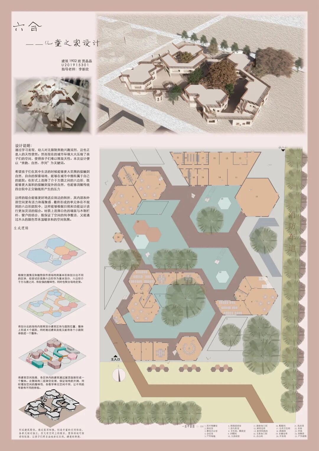 本次设计采取六边形的形式围合出四个庭院,首先确定了以“自然、奔跑、动静空间序列”三个关键词作为设计切入点,然后根据场地的植物、交通等情况,经过尝试后选择以六边形作为基础形态划分出四个不同的庭院,,六边形既可以四周正交轴线建筑带来的压迫感,又让建筑和场地有一定的向心力,同时还具有采光丰富等优势。再根据每个年龄段对自我、自然和社会的认知将每个单元设置在不同的庭院里。将每个庭院的屋顶连接起来,让孩子们可以自由的探索整个场地,同时利用屋顶庭院角落打散的建筑作为流线的节点,创造出动静的空间序列,让空间有不同的属性,带来丰富的建筑体验。