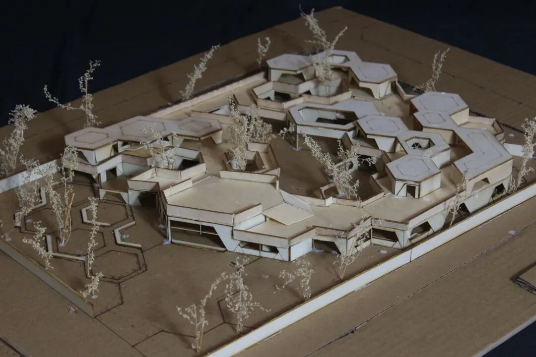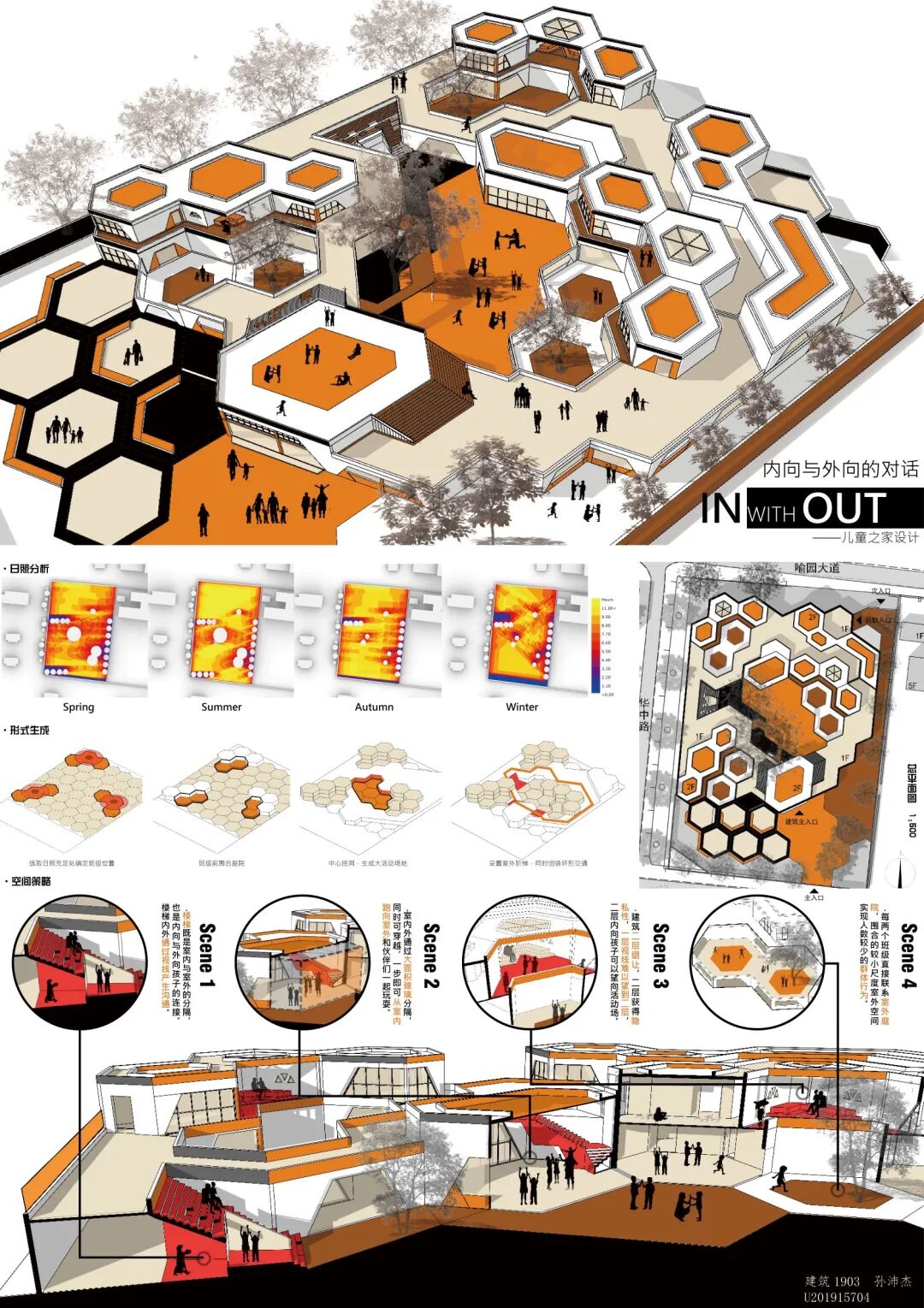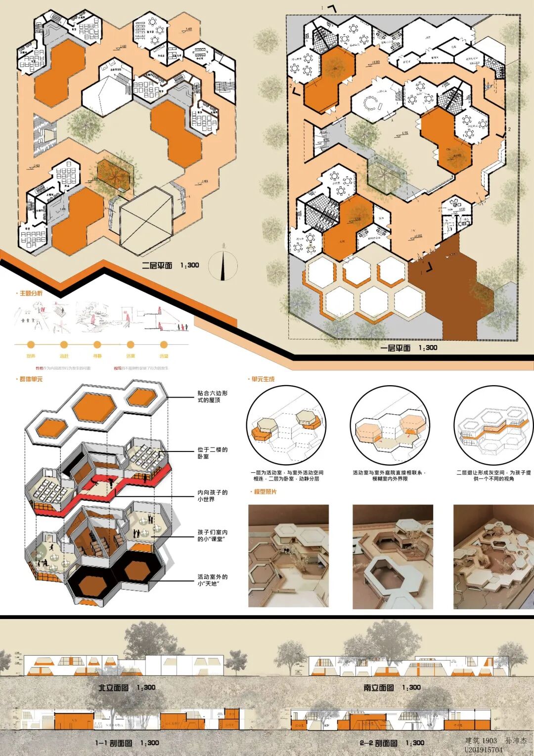 本次设计使用六边形作为单元原型,利用六边形形式上的独特性创造空间上的独特体验。在空间上创造内向者与外向者的特殊空间,利用视线中的交汇、阻隔等关系实现两种群体的分离与交集,满足两种群体的不同活动,让内向和外向的孩子都能够在建筑中发挥自己的天性。