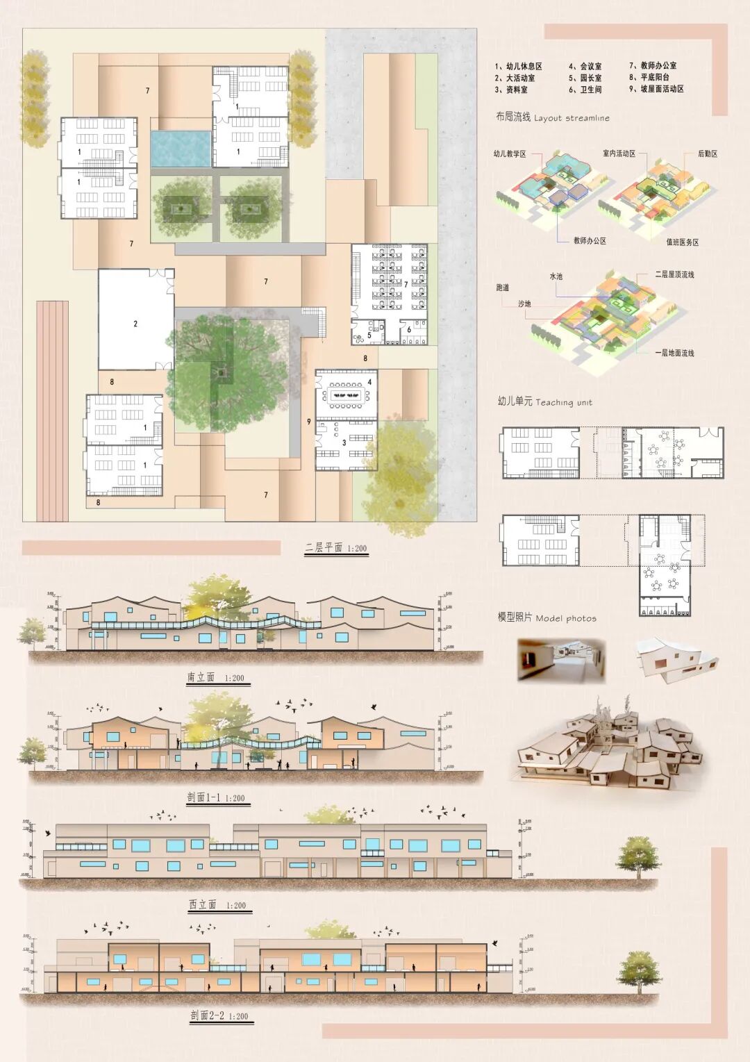 儿童之家,寓教于乐。而现在大部分幼儿建筑与游乐设施是分开设计的。“如何将建筑与游戏结合”是本次设计的出发点。通过对儿童发展心理学的学习以及对身边儿童行为的观察,选择利用斜面。通过循环路径的设置,将幼儿园串联成一个整体,通过廊道设计满足不同使用者的使用需求。