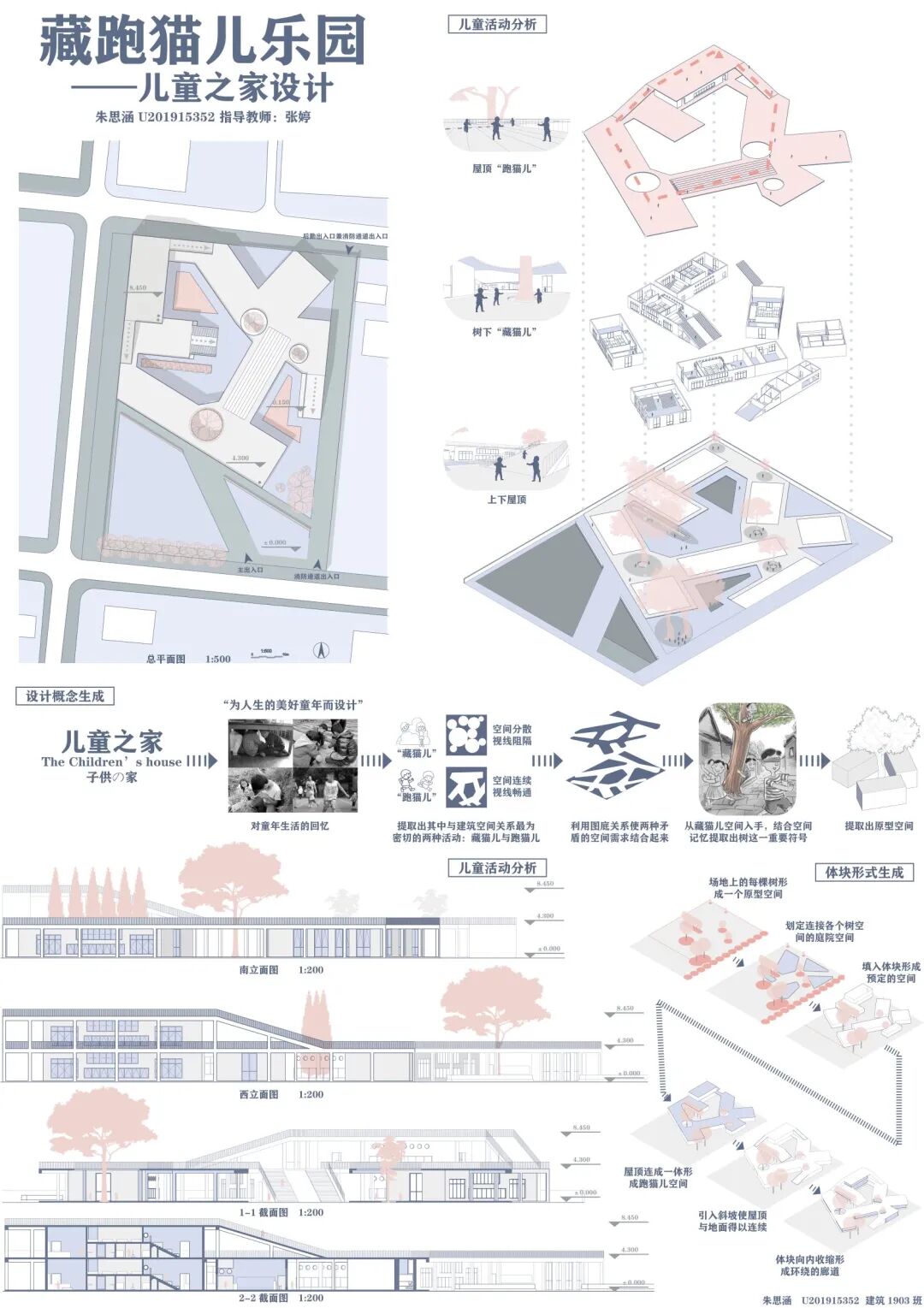 本次儿童之家的设计,我对于开题讲座里的最后一句“为人生的美好童年而设计”记忆很深刻,于是我从自己的童年出发思考,从各种各样的游戏中选出了两种与建筑空间关系最紧密的——“藏猫儿”与“跑猫儿”(家乡方言,即捉迷藏和一种追逐游戏的统称),然后从“藏猫儿”的特色空间入手,保留场地中原有的树,重点打造这一以树木为中心的空间,最后利用图底关系制造出“跑猫儿”的空间。同时班级单元也按照“藏猫儿”的出发点设计,实现室内室外逻辑的贯通。我希望儿童之家的孩子们能像我的童年一样,在大街小巷无忧无虑地穿梭、在蓝天下自由自在地奔跑、游戏。