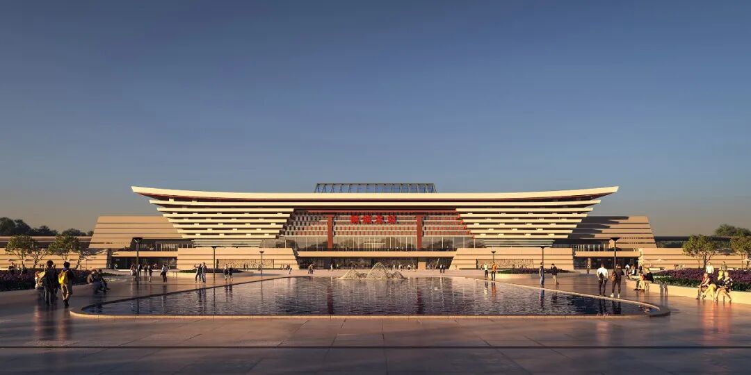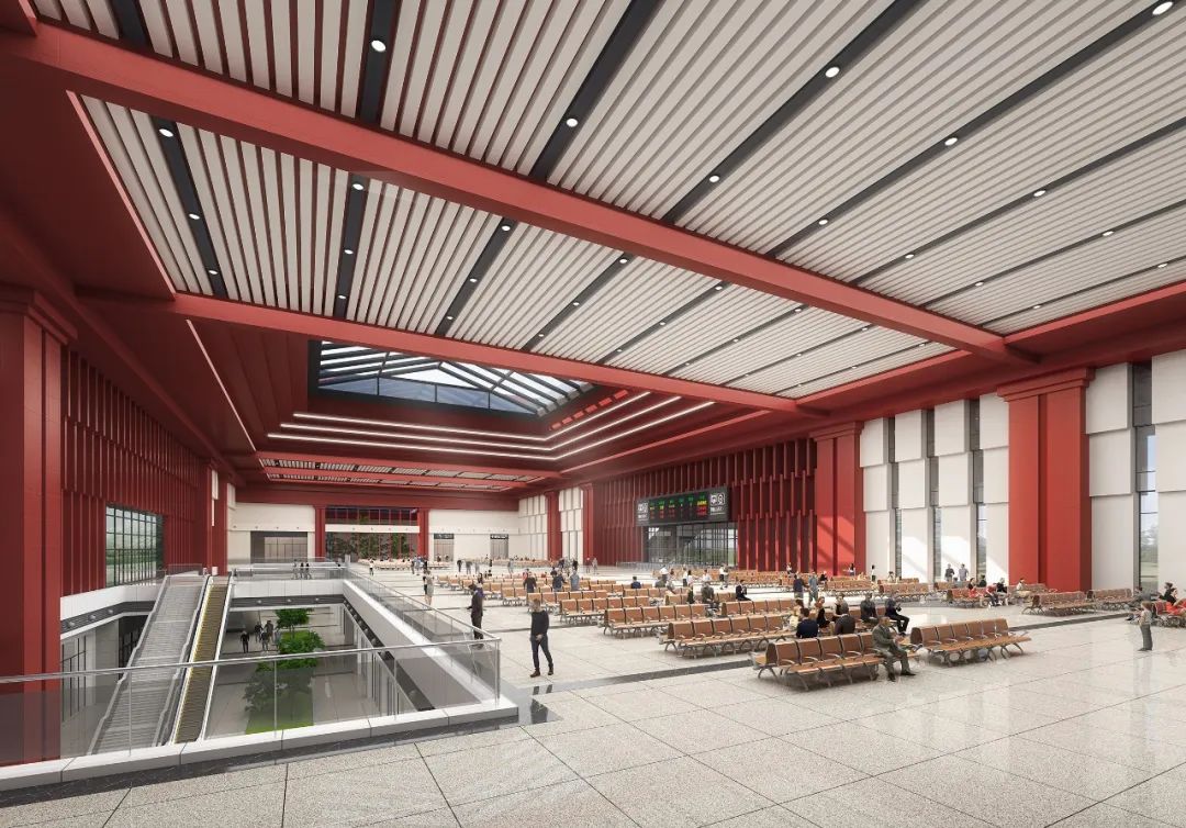 方案设计通过现代建筑设计语汇的演绎,弘扬“红色文化”,传承“老区精神”。建筑整体形态呈三段式布置,舒展的石材基座横向展开,主体站房立面层叠出挑,大气完整的中式屋顶统领全局。红安站设计展现了大气恢弘的形象塑造和红色文脉的转译表达,集时代精神、地域文脉、建筑性格为一体的红安站将成为彰显城市壮阔历史的全新名片。