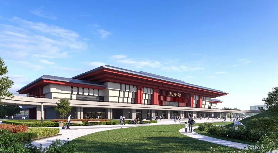 红安县隶属于湖北省黄冈市,地处鄂豫两省交界处。大革命时期,这里打响了黄麻起义第一枪,具有“中国第一将军县”之称。红安不只是红色文化旅游的圣地,同时也是鄂东地区山水文化的典型代表。红安站站房为线侧平式站型,站房建筑面积20000平方米,车站规模为 3 台 8 线。