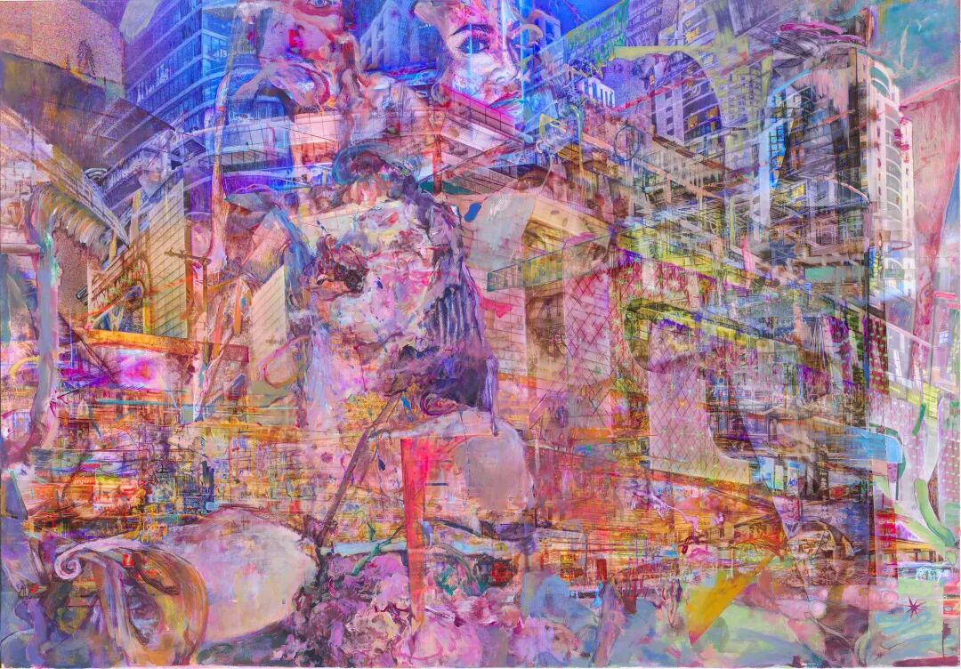 《妖夜慌踪》系列是陈卉将绘画和摄影融合的综合媒介创作实验:将在曼谷驻地创作时拍摄的人妖身体与城市空间的照片随机导入图形处理软件自动生成重叠混乱的图像,再在此上进行手工绘画重构,迫使两种媒介形成巨大的冲突和张力,从而创造出更加无序的,消散注意力的,没有中心透视、明确造型以及美感性的图像。这种图像生成的方法是一种隐喻,即在即将到来的未来,图像会如何统治人类?而曼谷的人妖和城市空间被混合在一起又产生了另一种隐喻,即人和物理空间、人造物、技术之间互相角力互相侵蚀之后的关系,会否就是走向赛博朋克的未来?