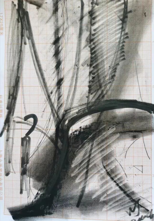 2.在南新园时用水墨每天对着窗外画写生,大概A3尺幅。在手工制作的厚麻纸上积墨。那时也画过一些更大尺寸的作品。不过后来渐渐对表现城市失去了兴趣。