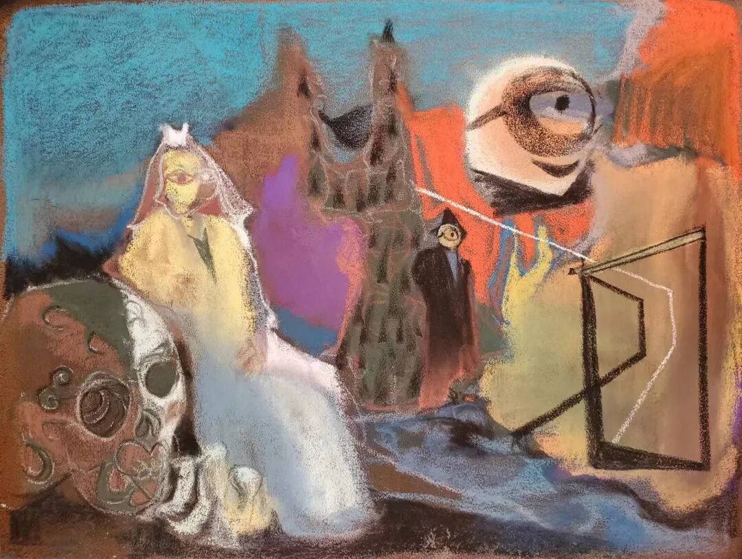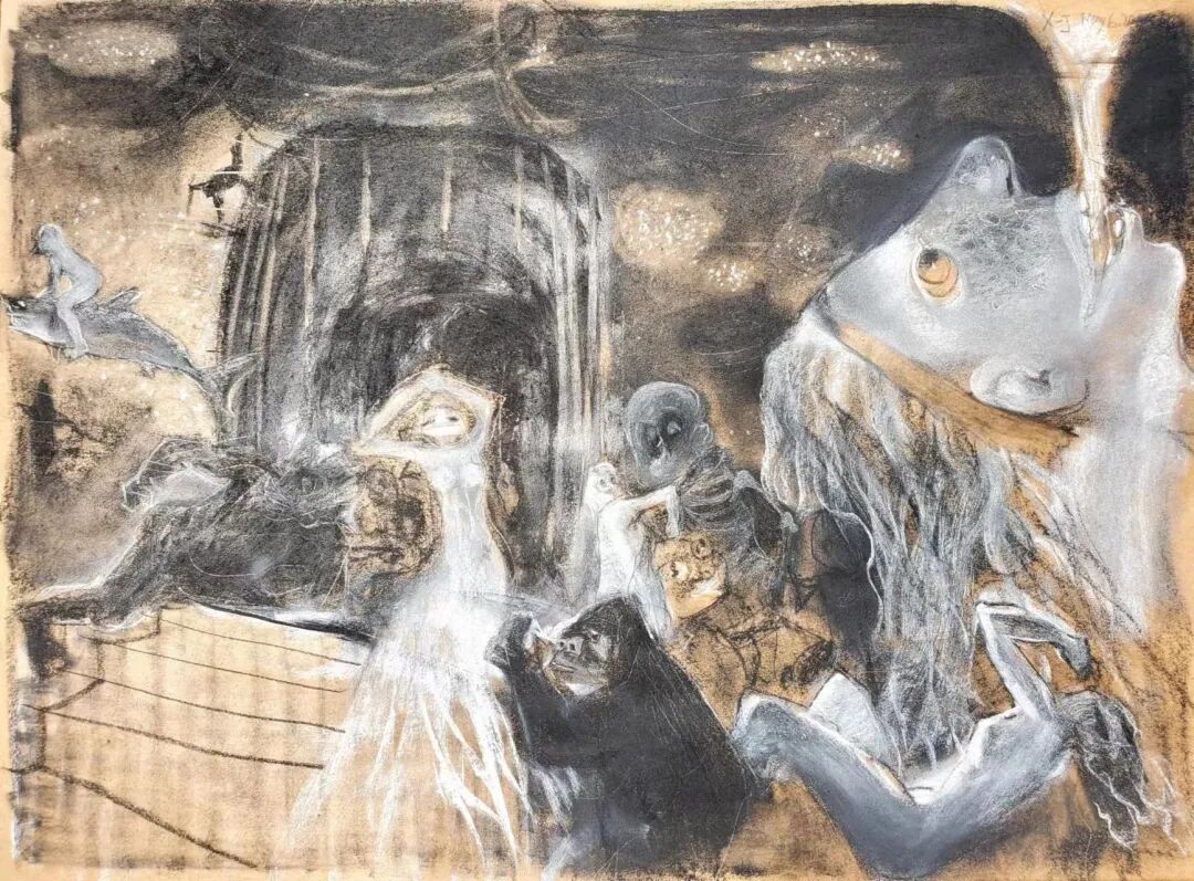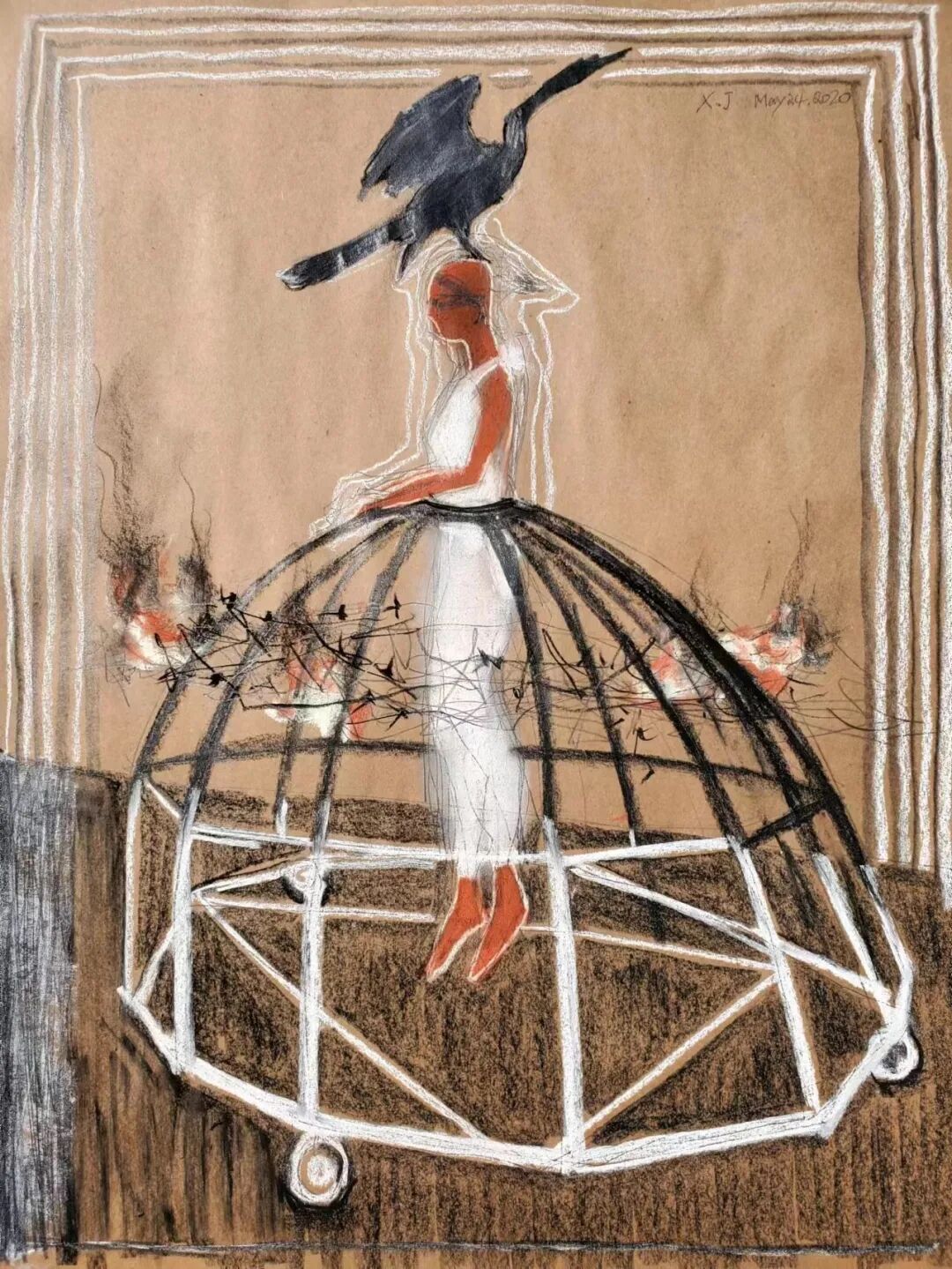 镜花缘,30.5x23cm,2020,纸本色粉、炭精
