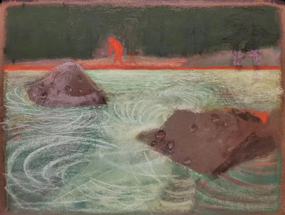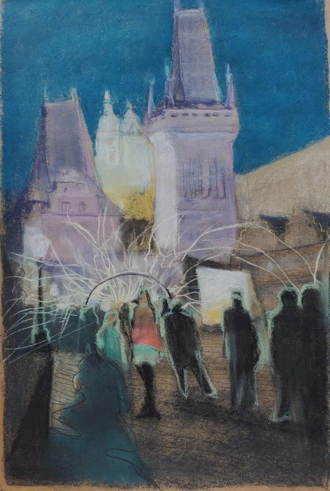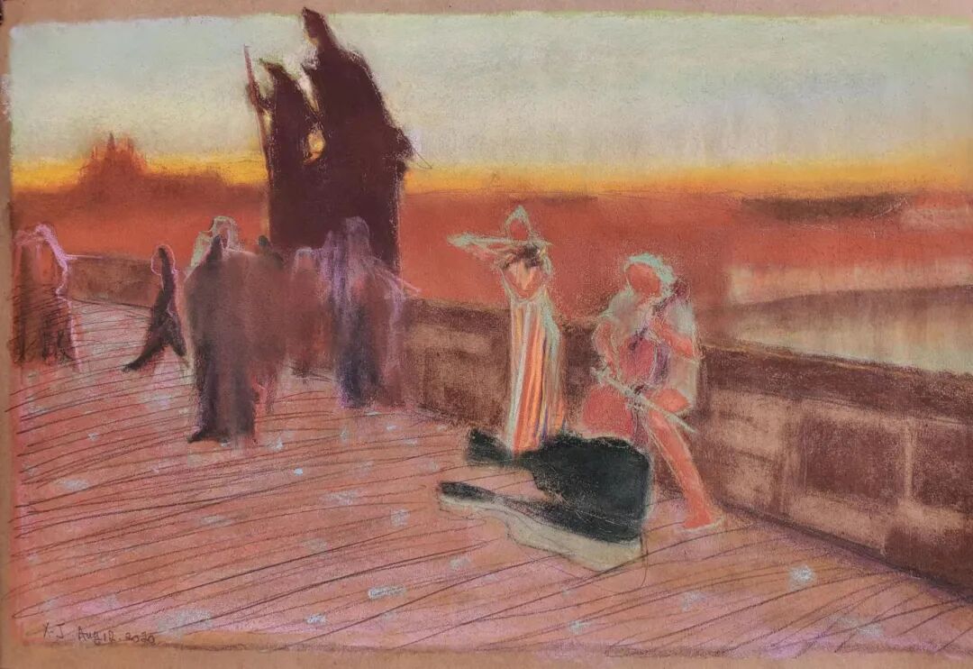 查理大桥,46x30.5cm,2020,纸本色粉、炭精、铅笔